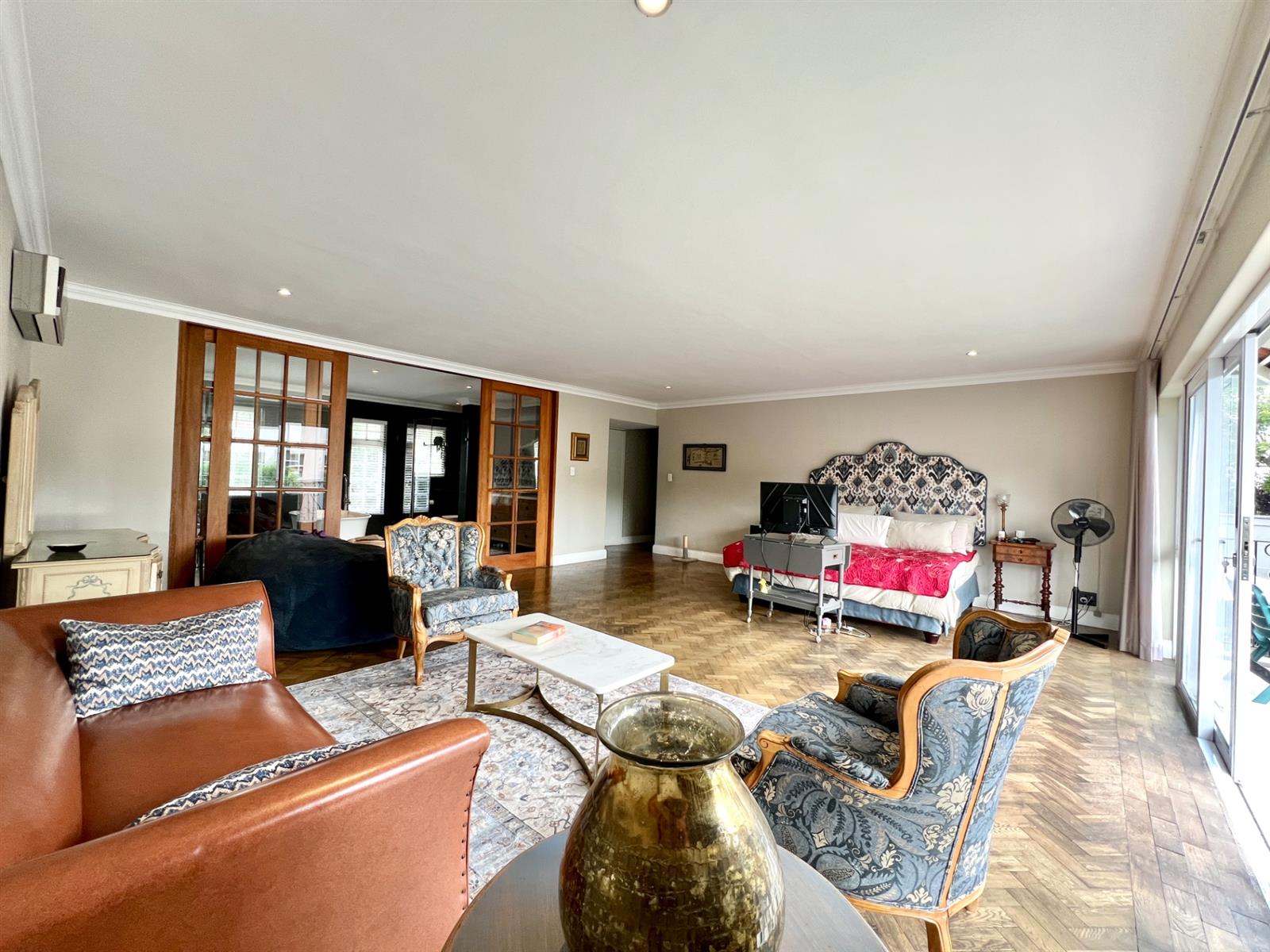 The main bedroom suite deserves special mention, featuring air-conditioning, a generous private balcony overlooking the garden and pool, and a luxurious full bathroom with freestanding bath and shower. Sliding glass-pane wooden doors create an elegant separation between bedroom and bathroom.