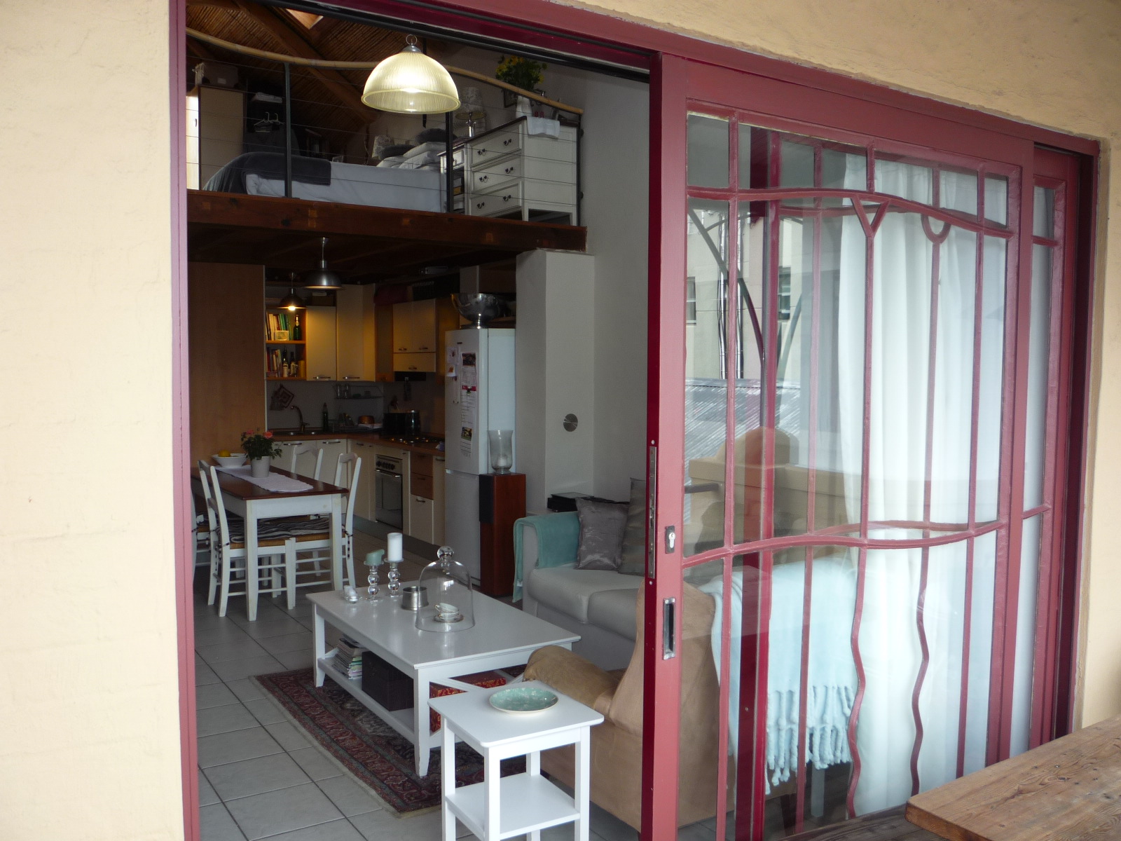 The living area is fully tiled, with stairs leading to a spacious carpeted mezzanine bedroom.