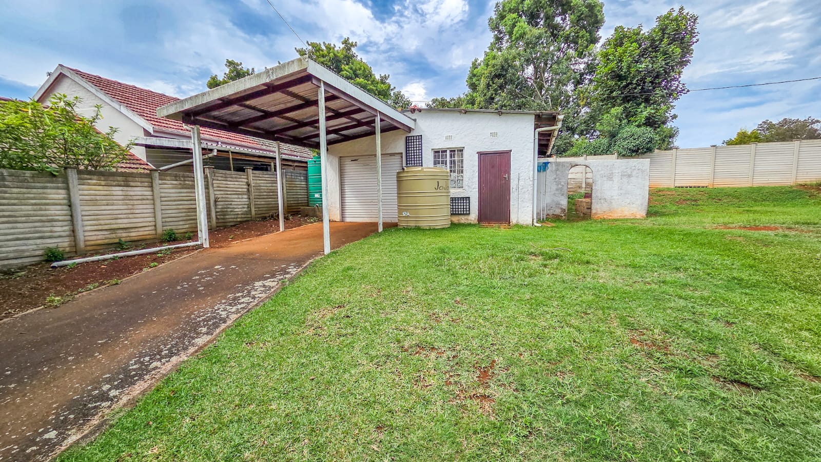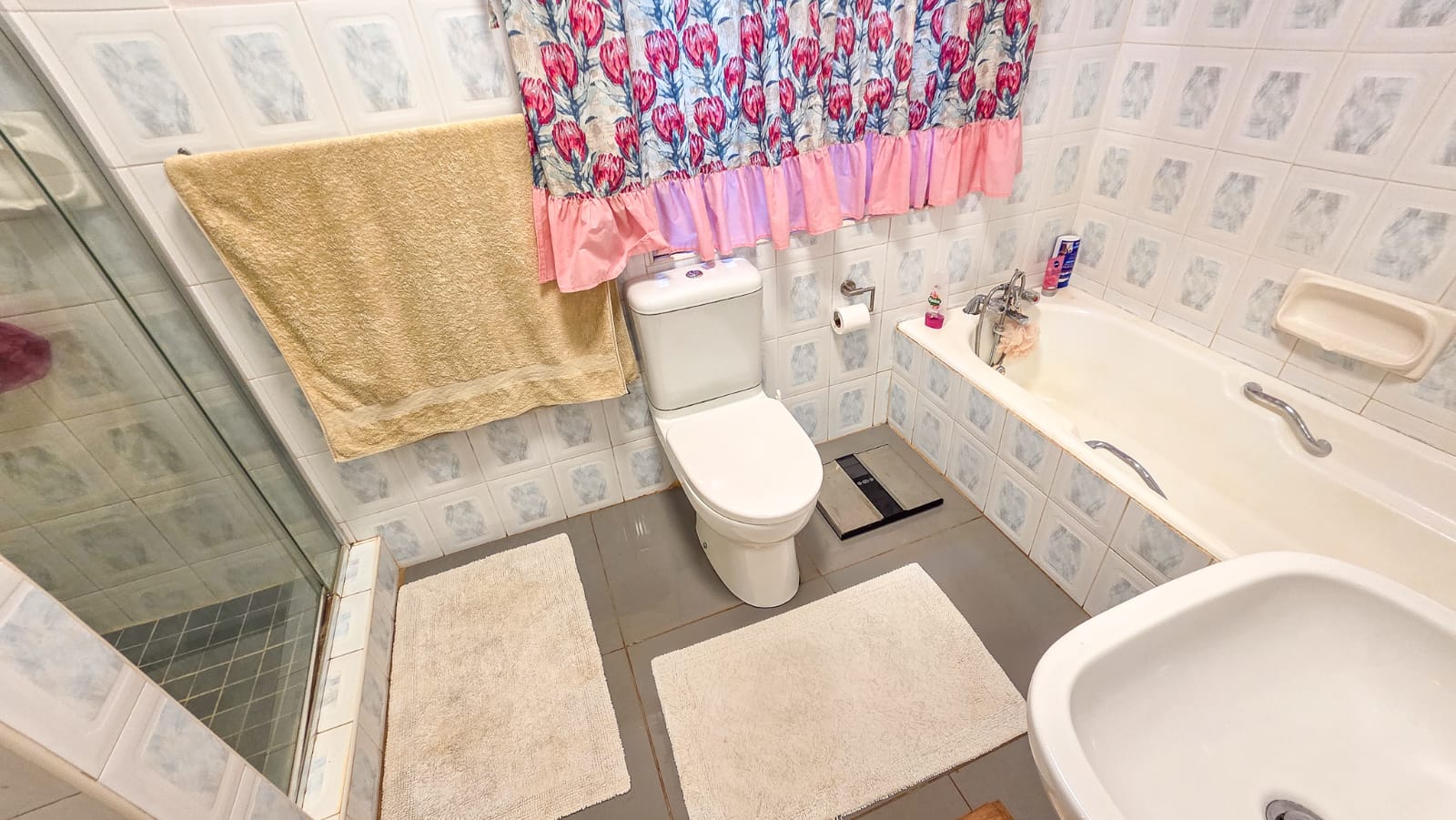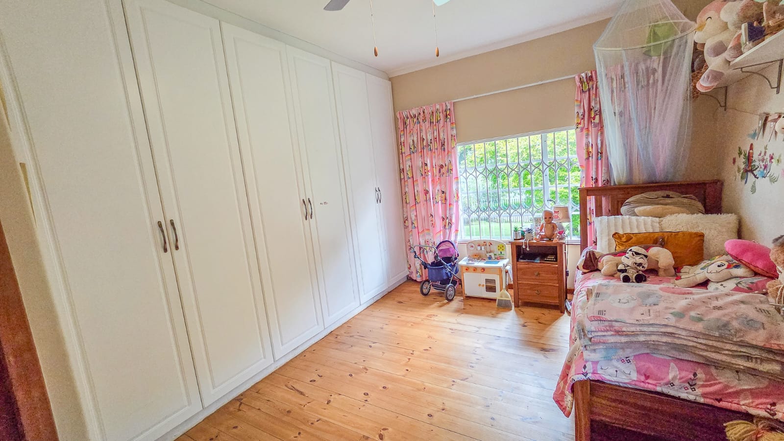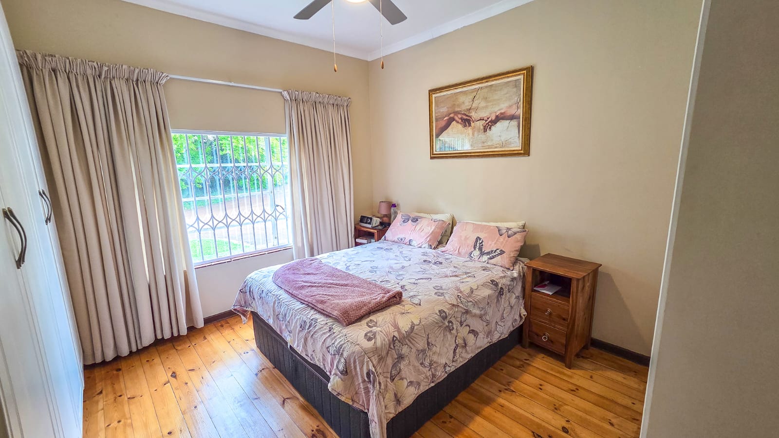 Step inside to find beautiful original wooden floors that add warmth and charm throughout the home. All four bedrooms feature built-in cupboards and ceiling fans, ensuring comfort and practicality. The property offers two bathrooms: one fitted with a bath, basin, and toilet, and the other a full en-suite bathroom for added convenience.