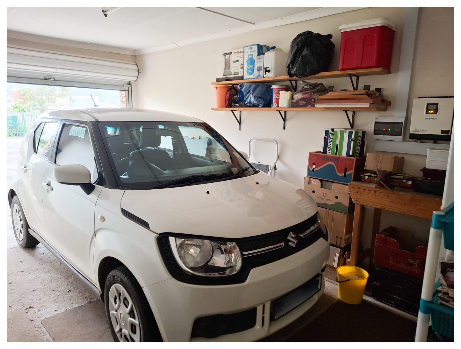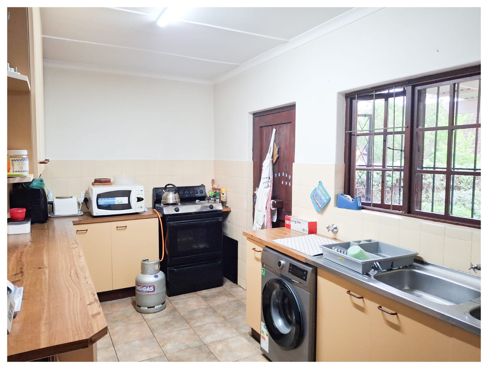 The practical kitchen provides ample counter space, a double sink, and room for a washing machine, fridge, and free-standing oven. From here, there is direct access to an extra-length garage that offers additional storage space.