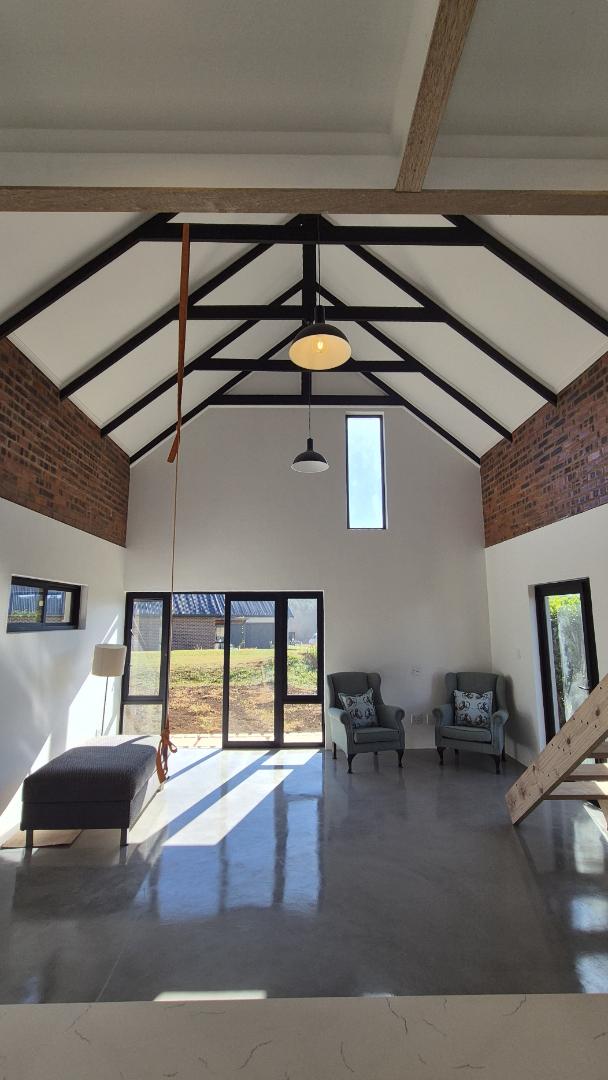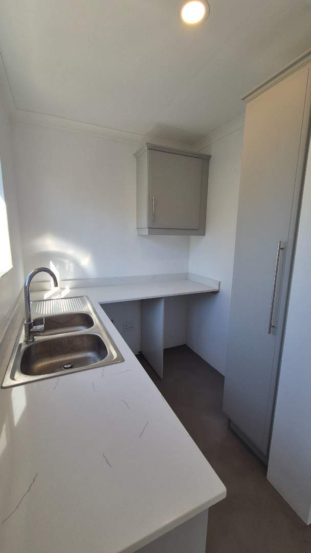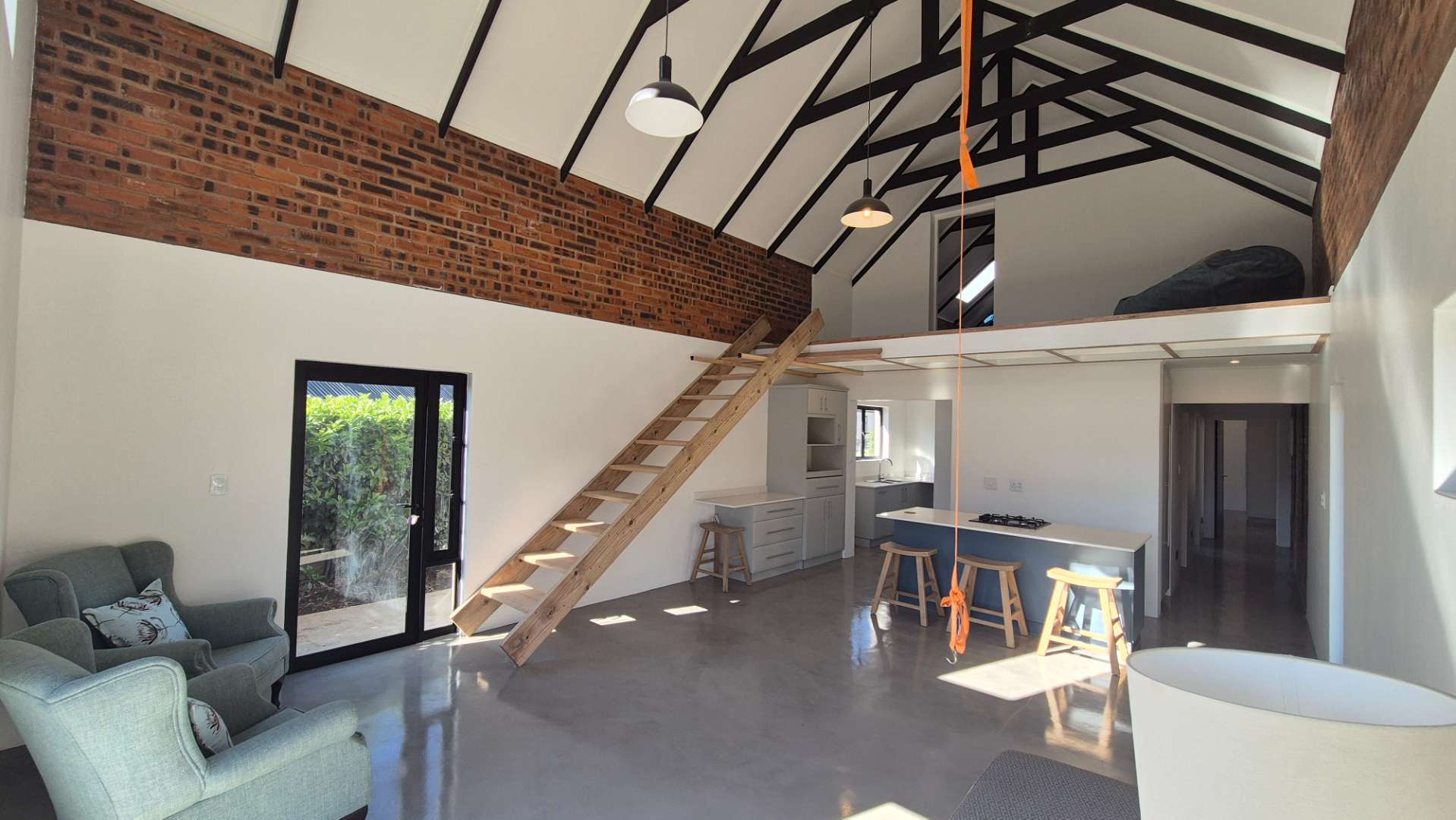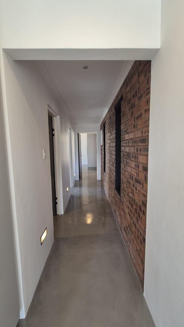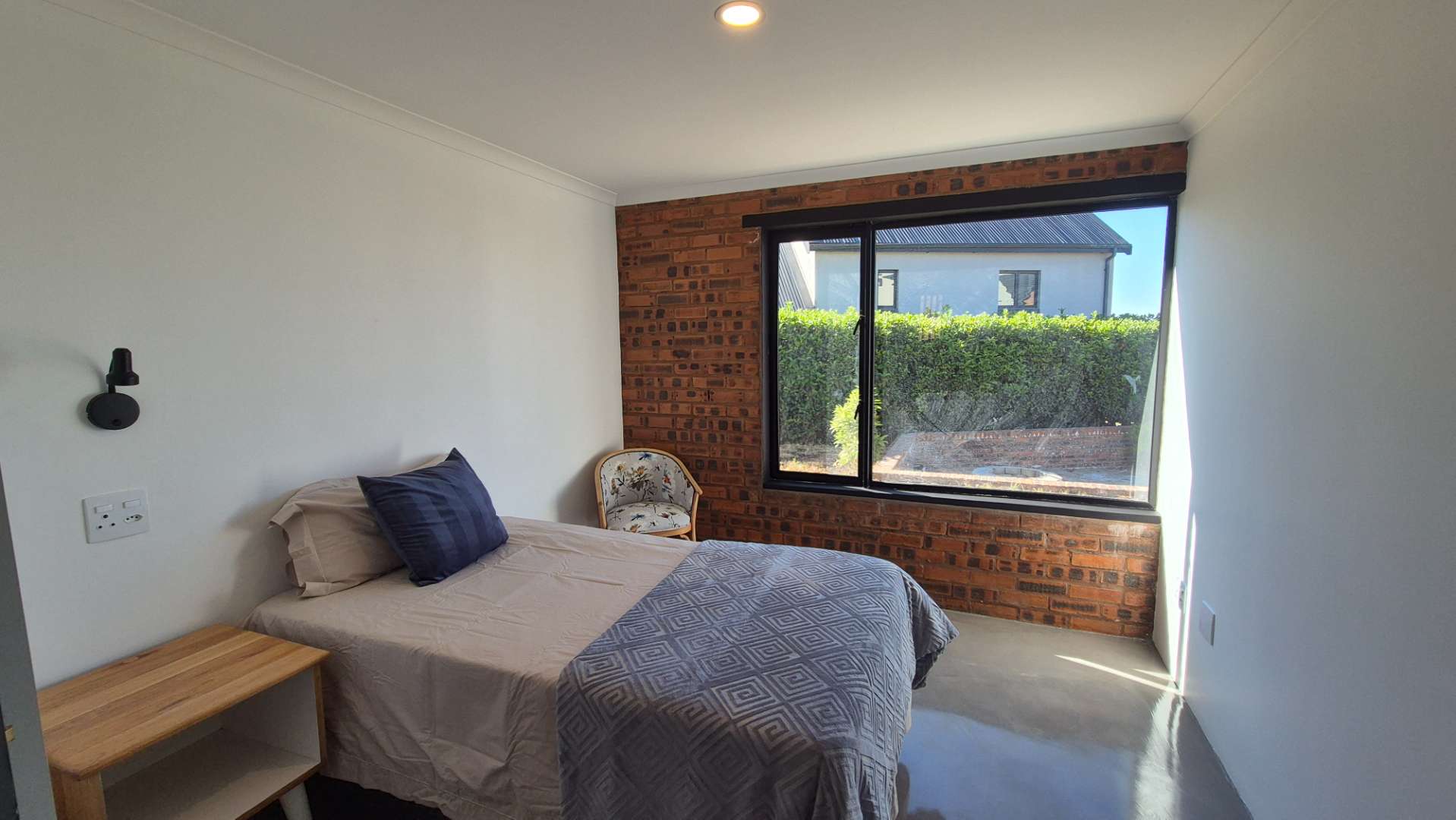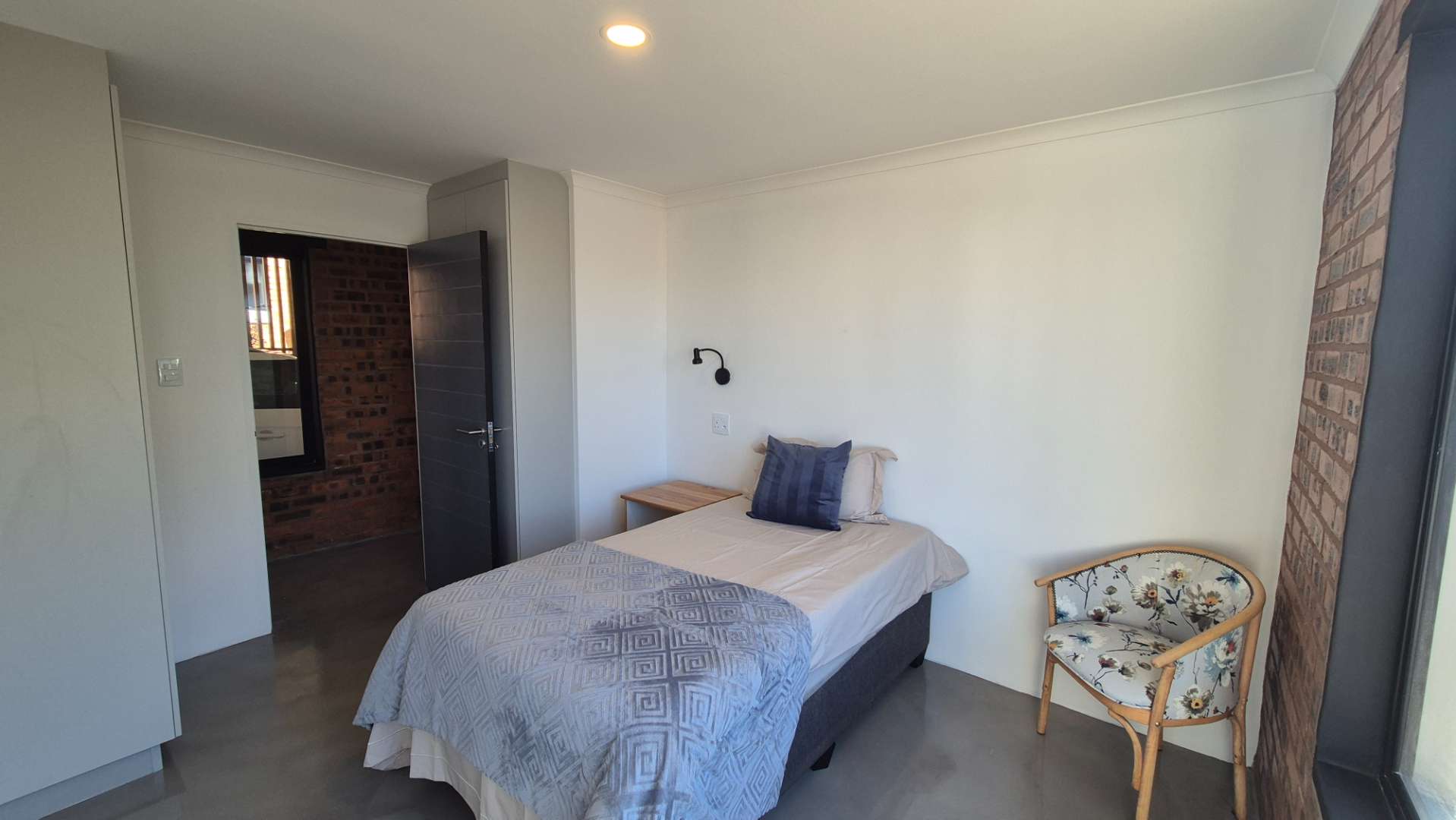 A wooden staircase takes you up to a mezzanine loft with its own balcony overlooking the lounge, ideal for a study or a small lounge for the guest suite. The bedroom upstairs is spacious and has an en-suite bathroom featuring a large shower. Downstairs, the passage, with handy sensor lighting and a linen cupboard, leads you to the other two bedrooms. The family bathroom has a large open shower. The main bedroom has a ceiling fan and enjoys access to the side garden. The ensuite bathroom has an open shower, as well as a double basin, and it enjoys access to the side garden. Both bedrooms are fitted with stylish overhead bedside lamps.