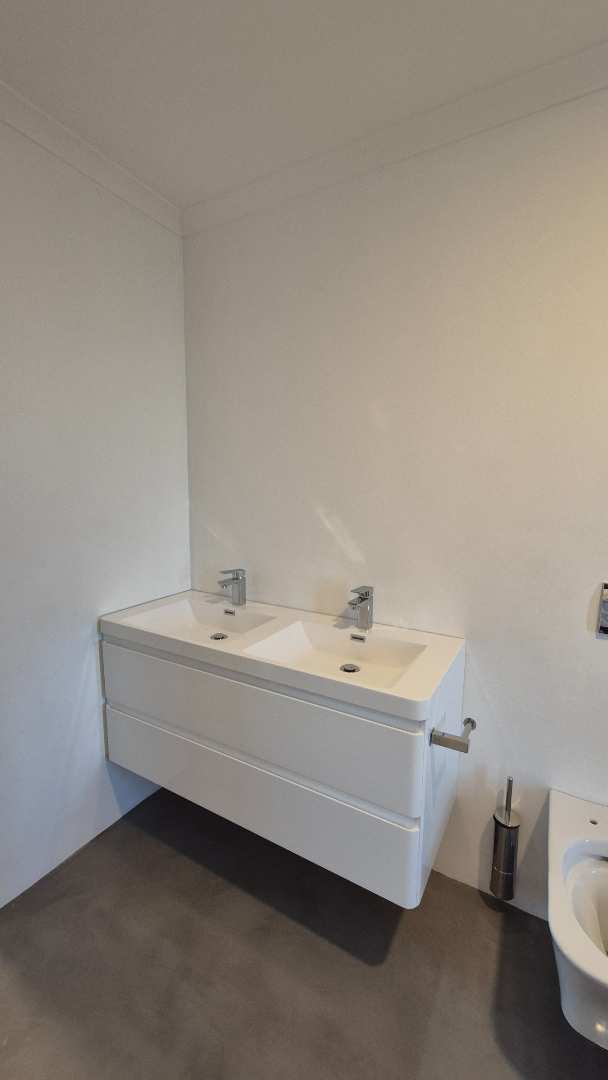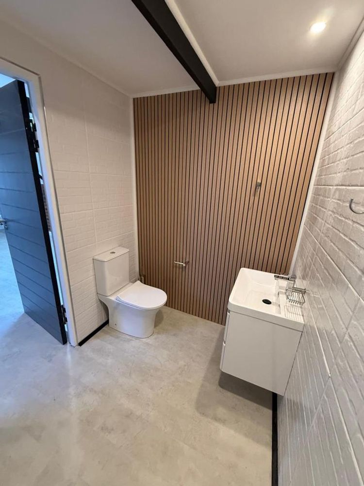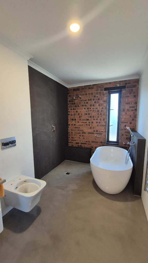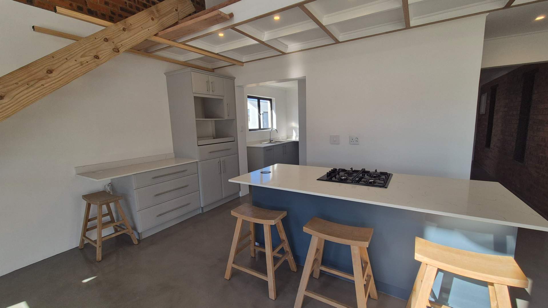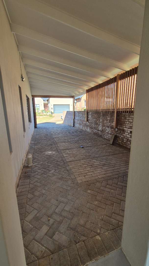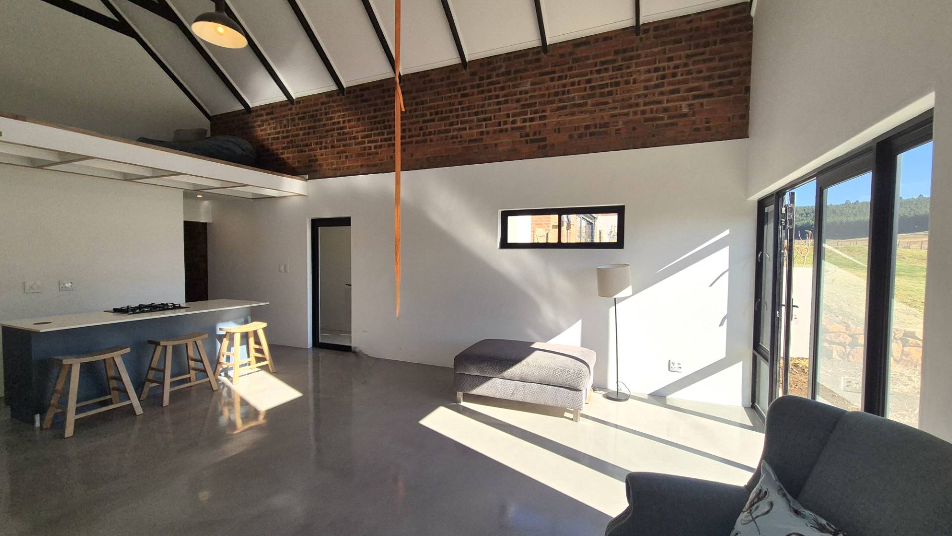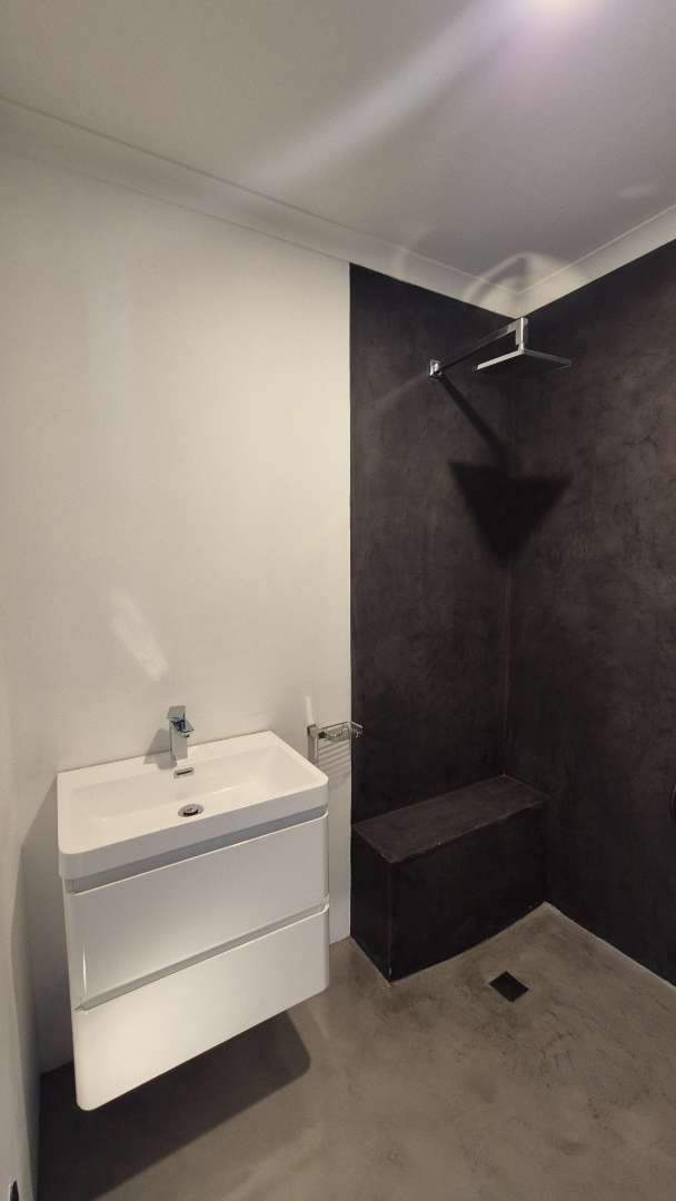A wooden staircase takes you up to a mezzanine loft with its own balcony overlooking the lounge, ideal for a study or a small lounge for the guest suite. The bedroom upstairs is spacious and has an en-suite bathroom featuring a large shower. Downstairs, the passage, with handy sensor lighting and a linen cupboard, leads you to the other two bedrooms. The family bathroom has a large open shower. The main bedroom has a ceiling fan and enjoys access to the side garden. The ensuite bathroom has an open shower, as well as a double basin, and it enjoys access to the side garden. Both bedrooms are fitted with stylish overhead bedside lamps.