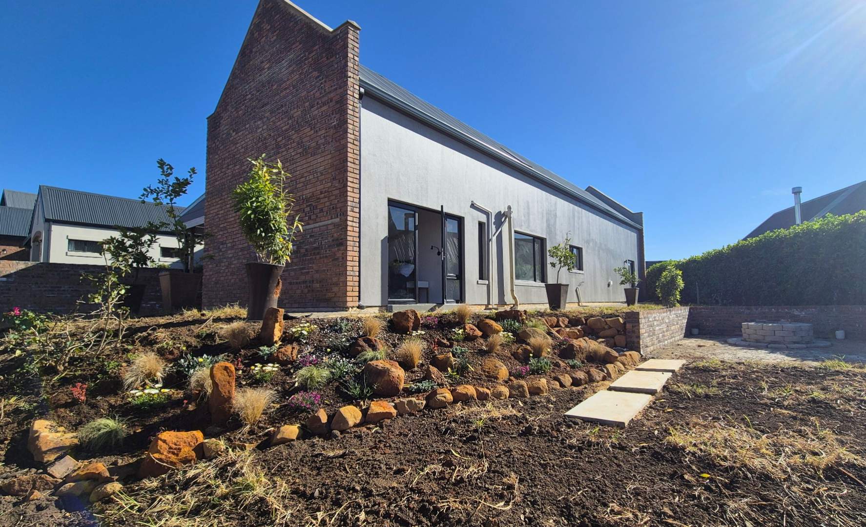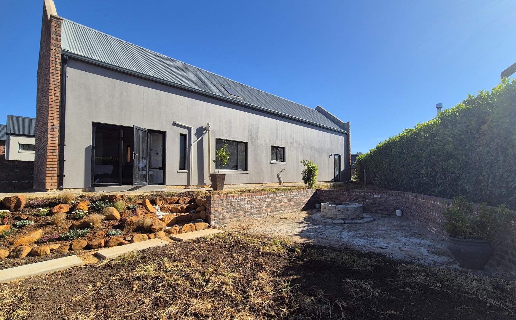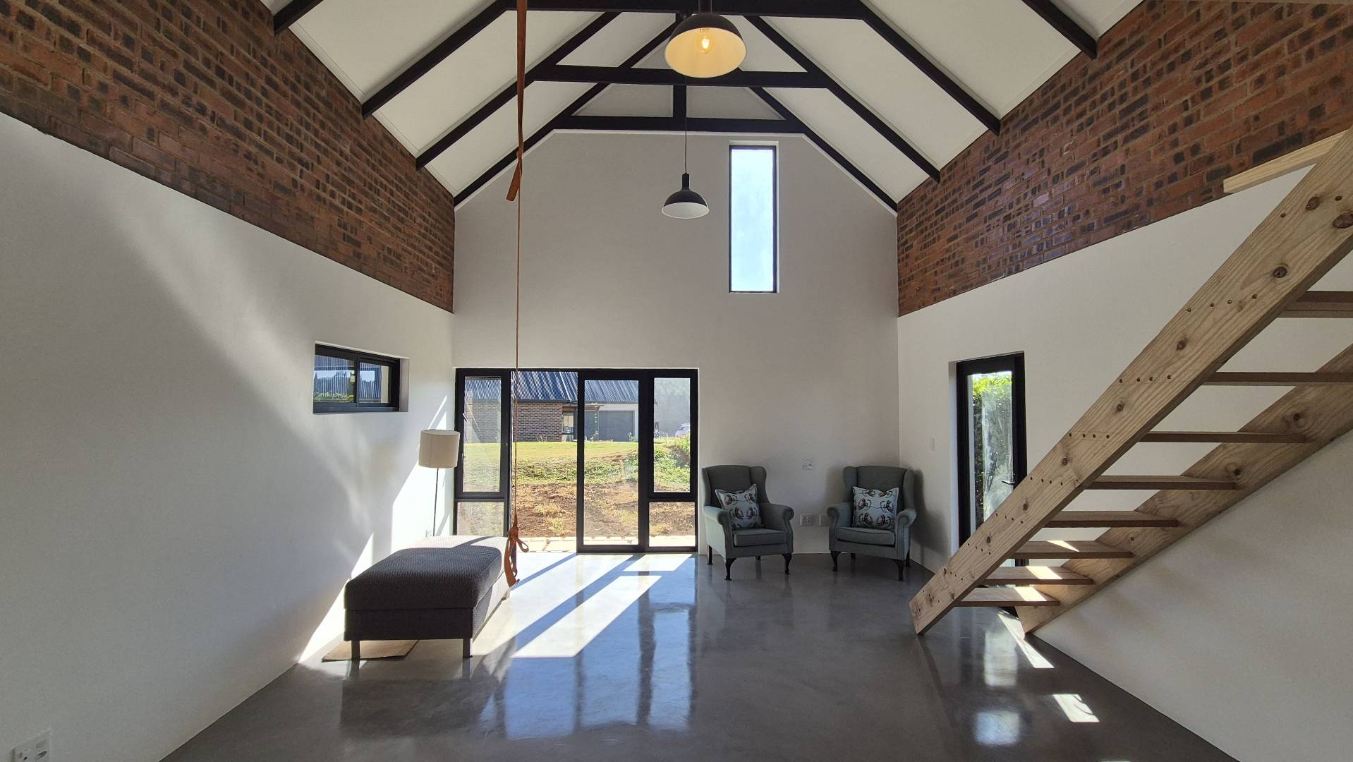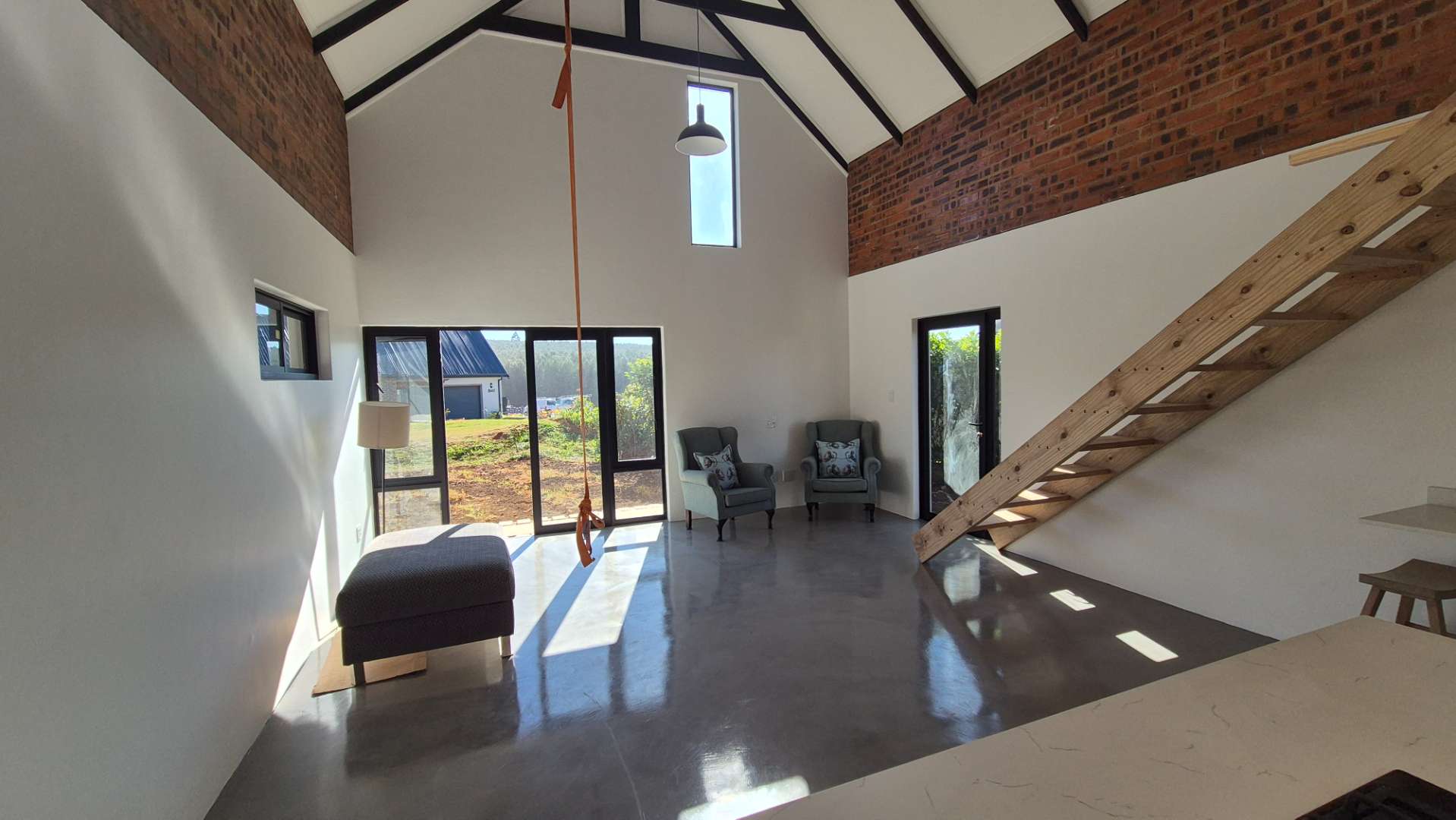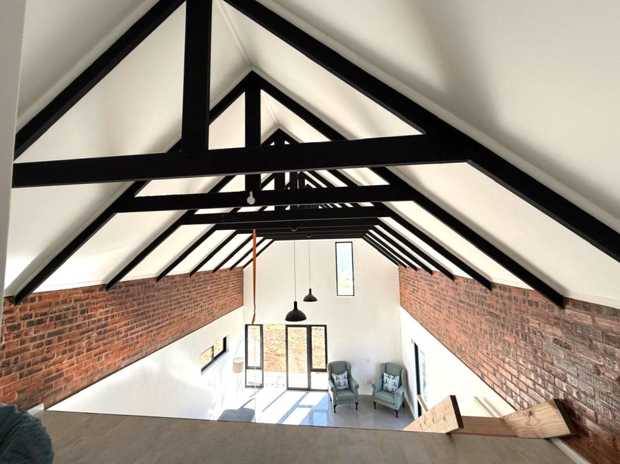 Inside, screeded flooring flows throughout, creating a clean and contemporary look. The open-plan living area is the heart of the home, with an impressive A-frame ceiling and exposed beams that give the space an airy, spacious feel. Large doors open directly onto the Vineyards, allowing you to enjoy the beauty of the estate right from your doorstep. Another door leads out to the side garden, where a designated concrete firepit area – complete with a central firepit – makes for the perfect place to gather with family and friends.