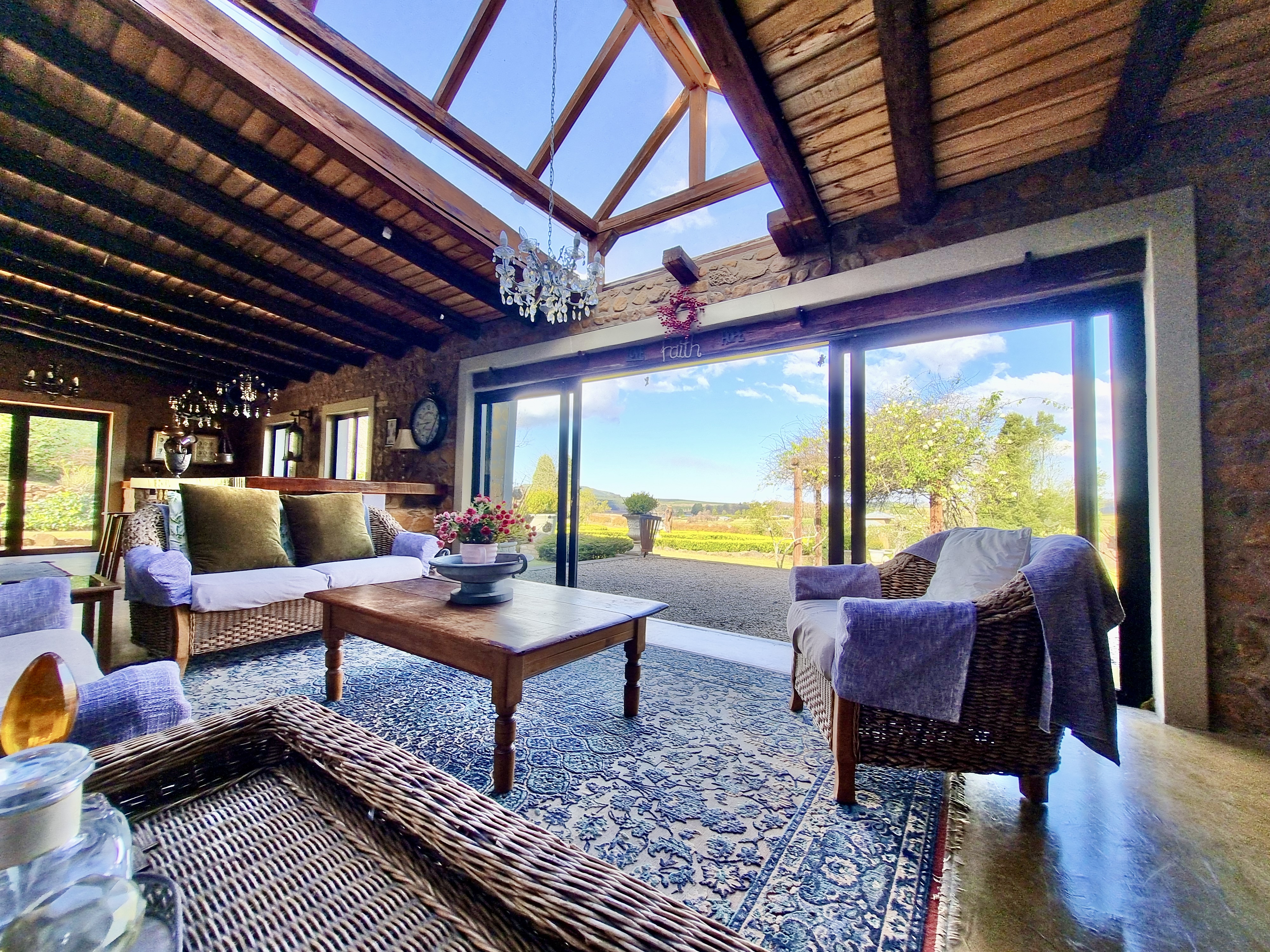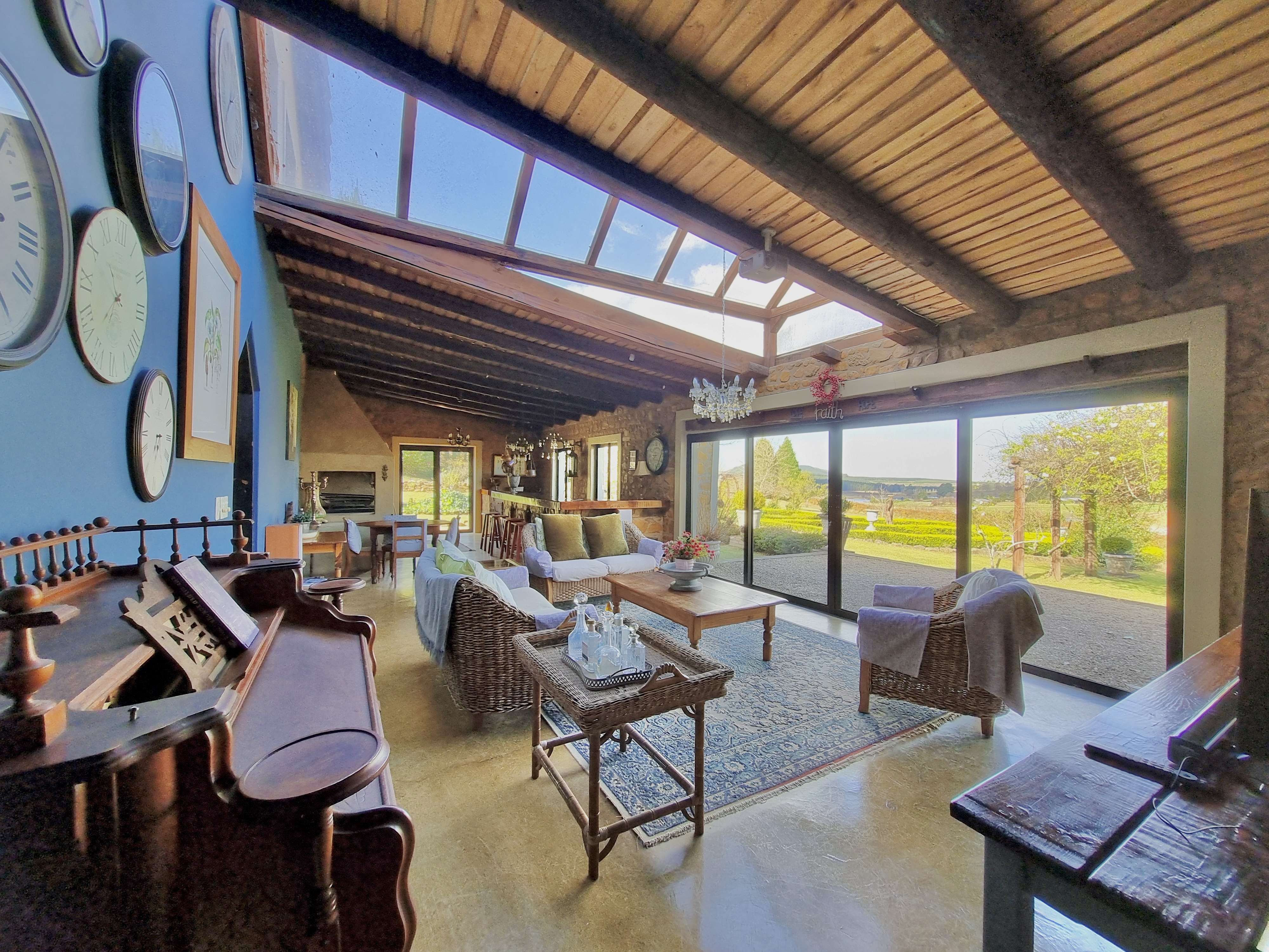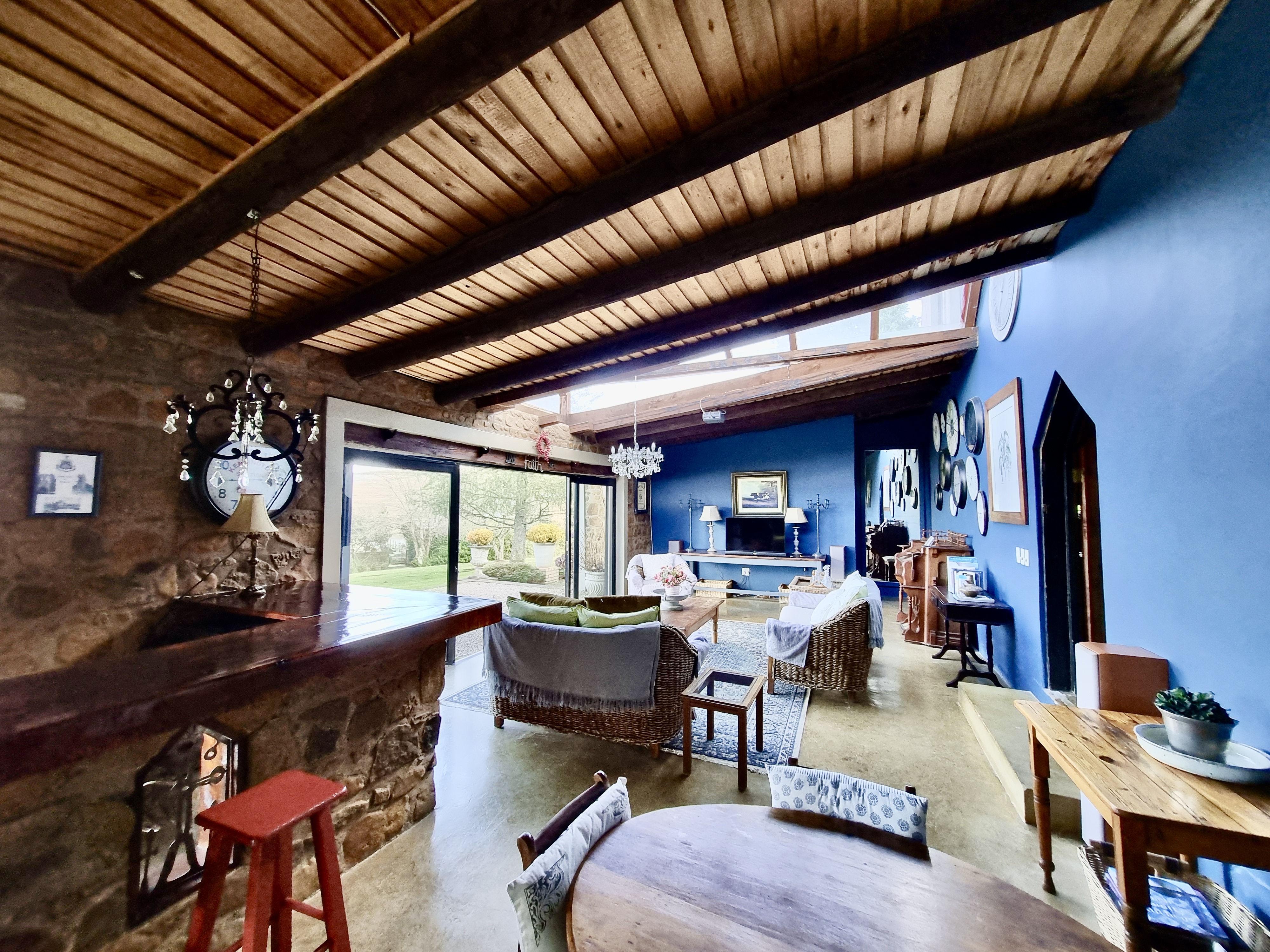 Character and warmth flow throughout - from the spacious lounge to the long, rustic dining room with its inviting fireplace and reading nook. The kitchen is fully equipped with a gas-electric stove, a large scullery, and everything needed for both family living and professional event catering. A cozy bar with its own fireplace opens through French doors to two sun-soaked patios that frame the serene views.