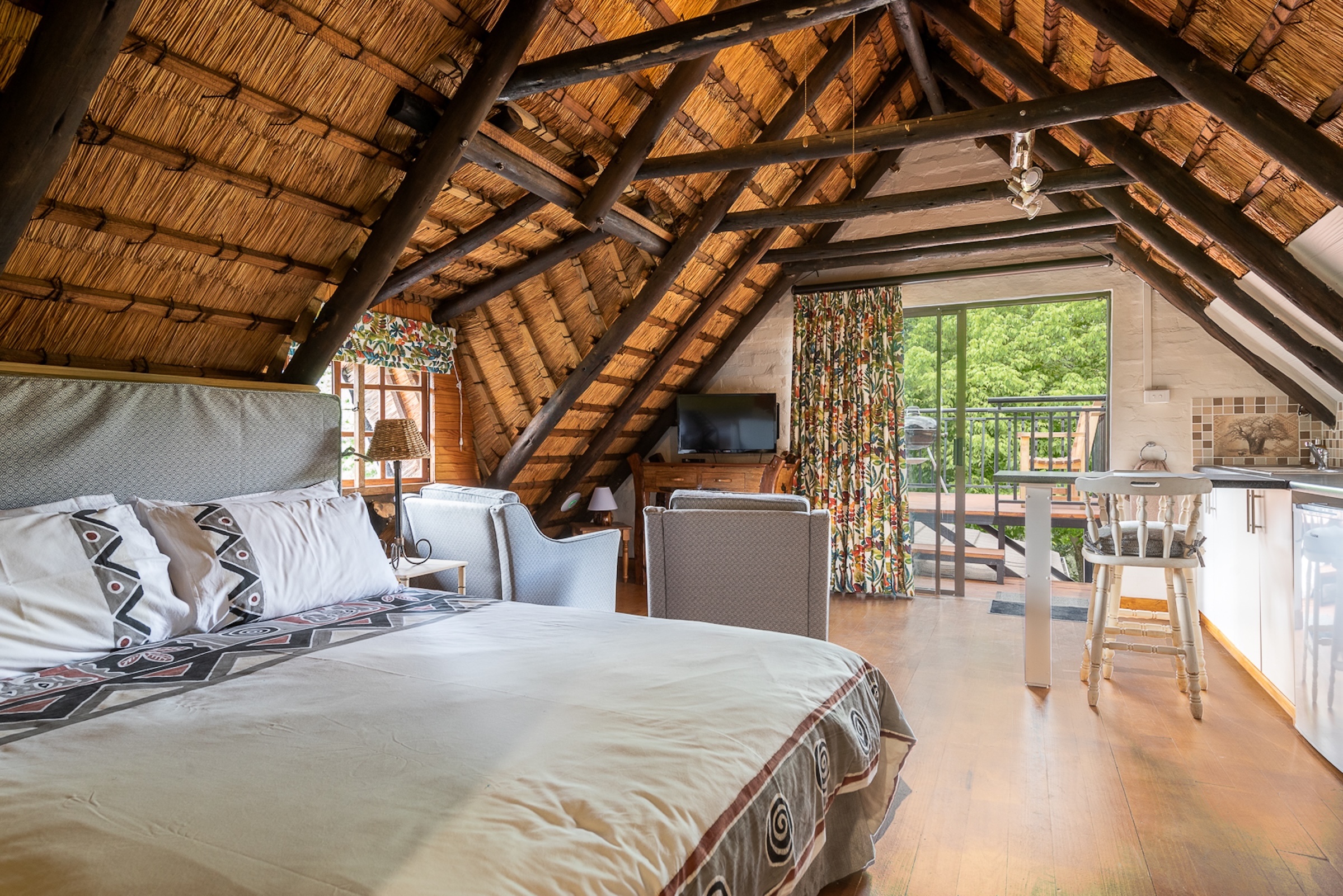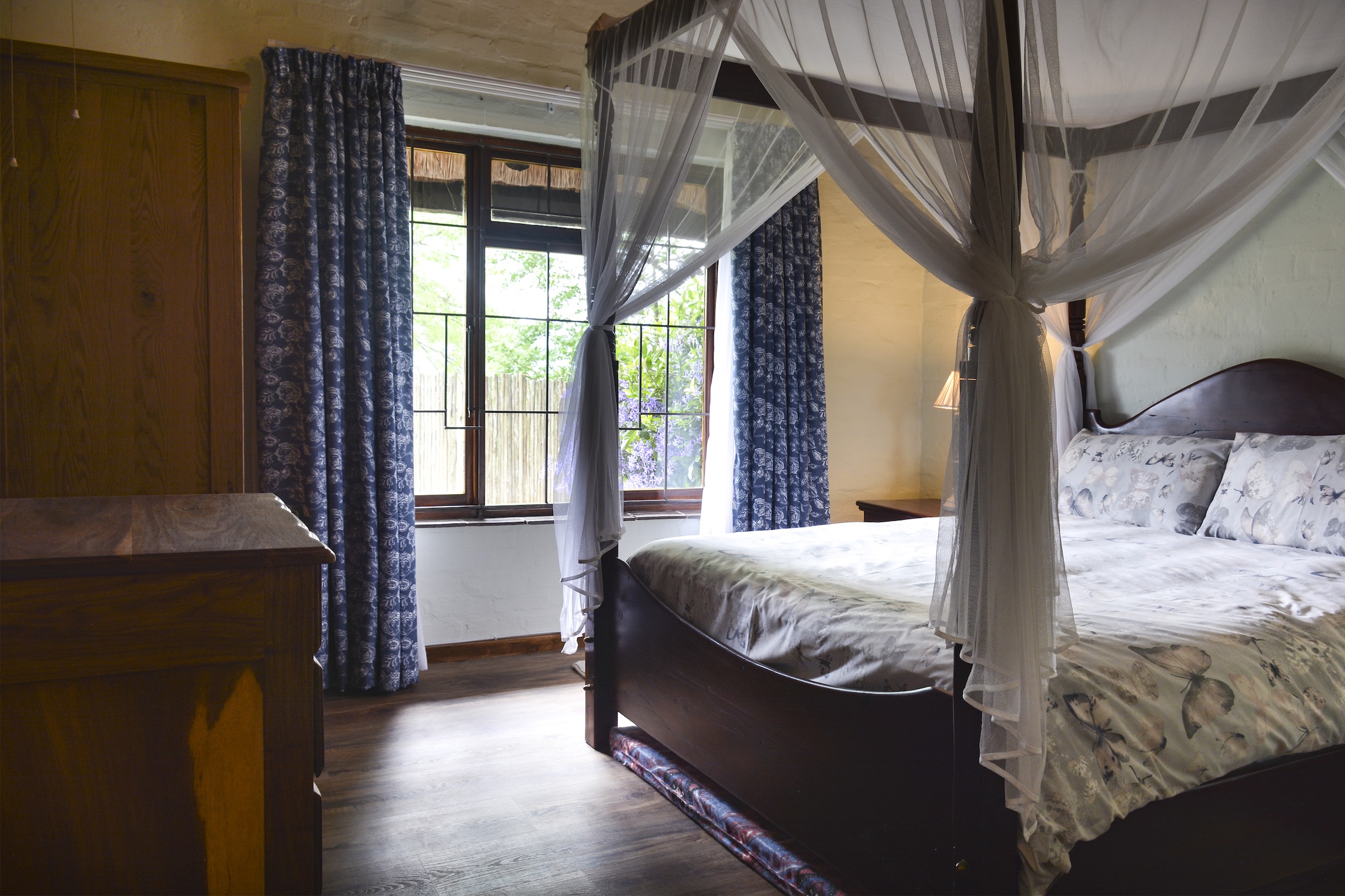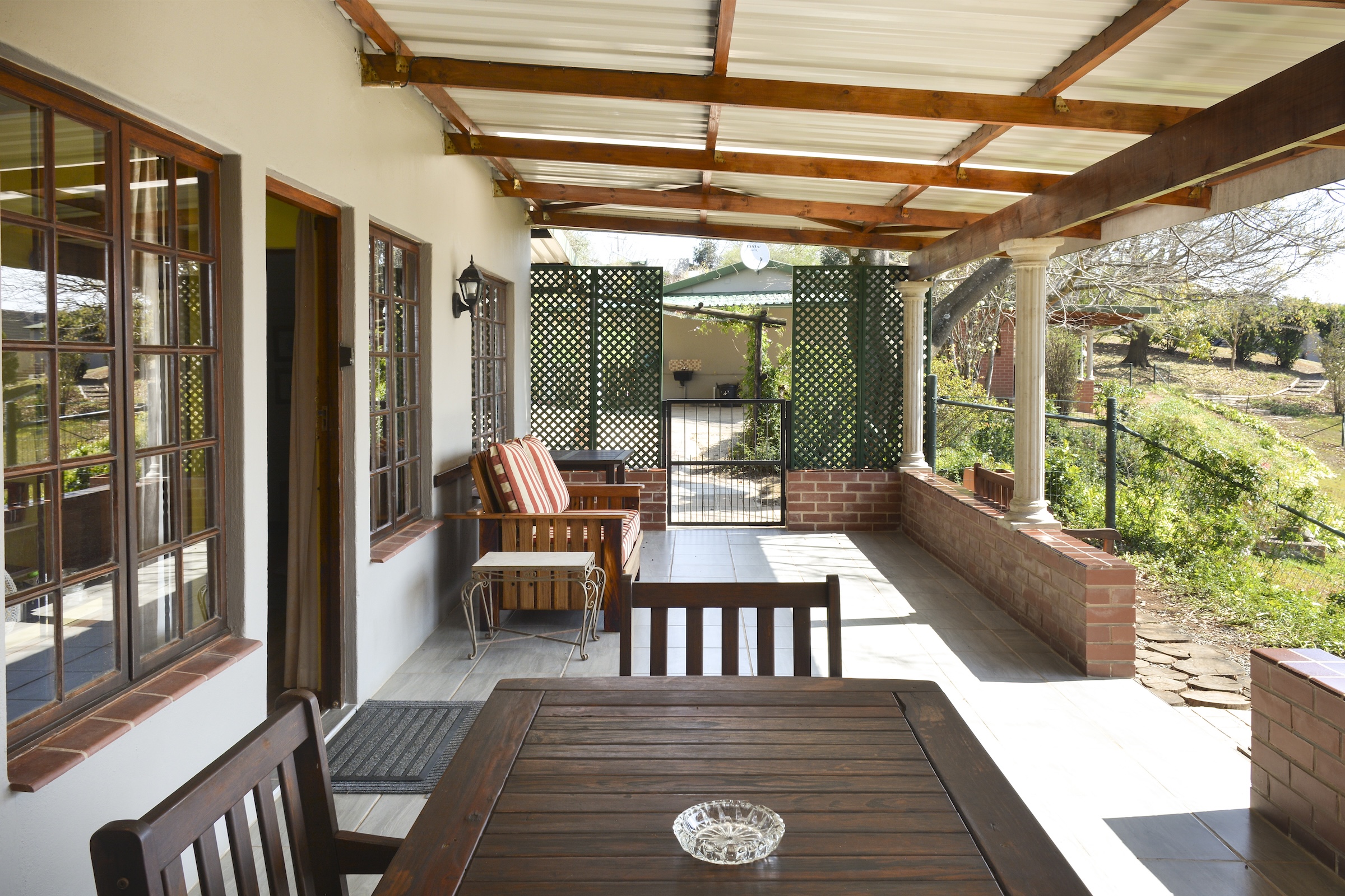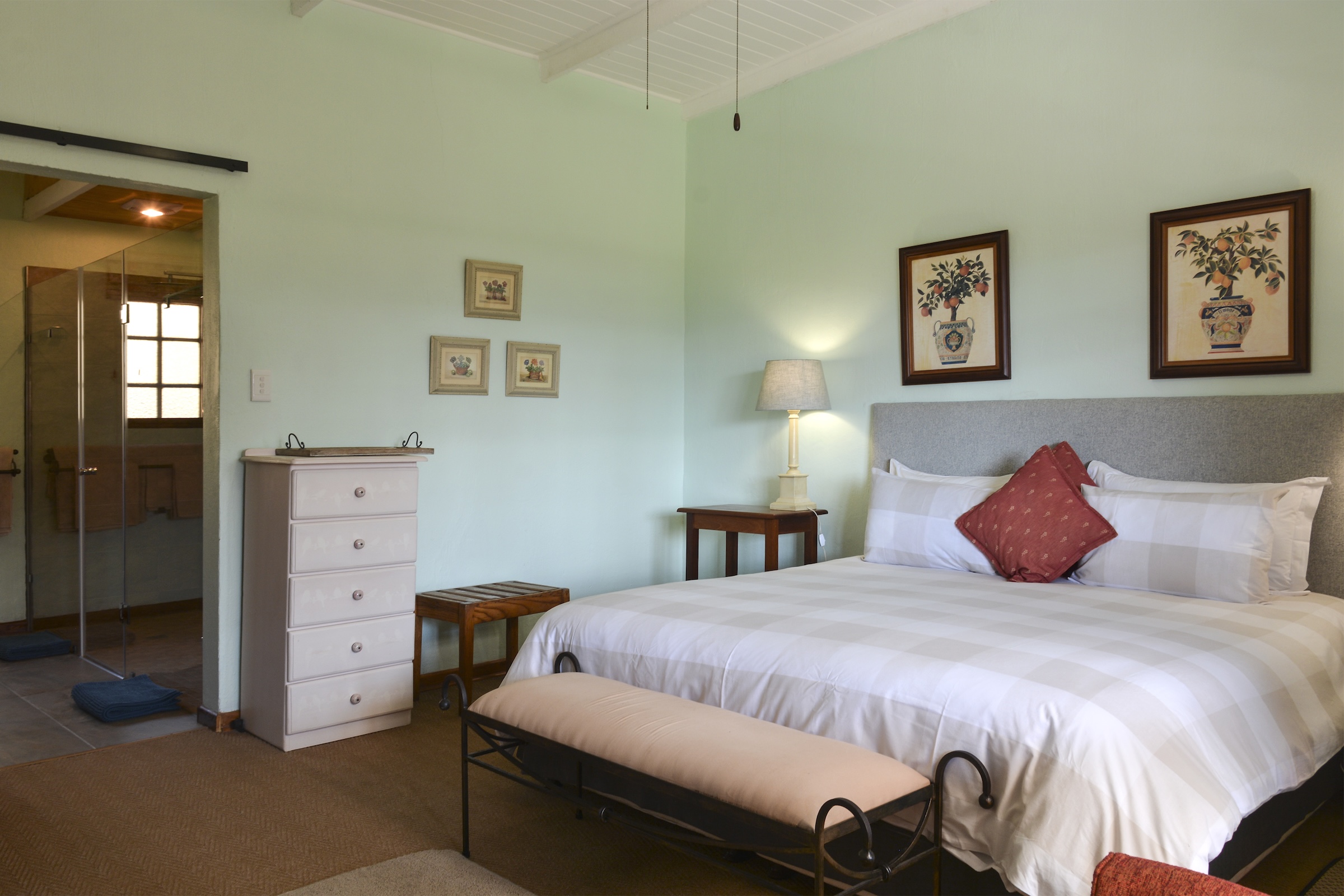 The 5.45 ha are a mixture of landscaping and lawns around the individual dwellings, all of which have fenced gardens, plus extensive planted areas of shrubs and flowers interspersed with large trees all of which combine to give the property a remote and tranquil feeling which attracts various species of small game and a large variety of birds. There is also a natural pond which is part of an adjoining wetland at the bottom of the property which attracts various bird life including the Crowned Crane.