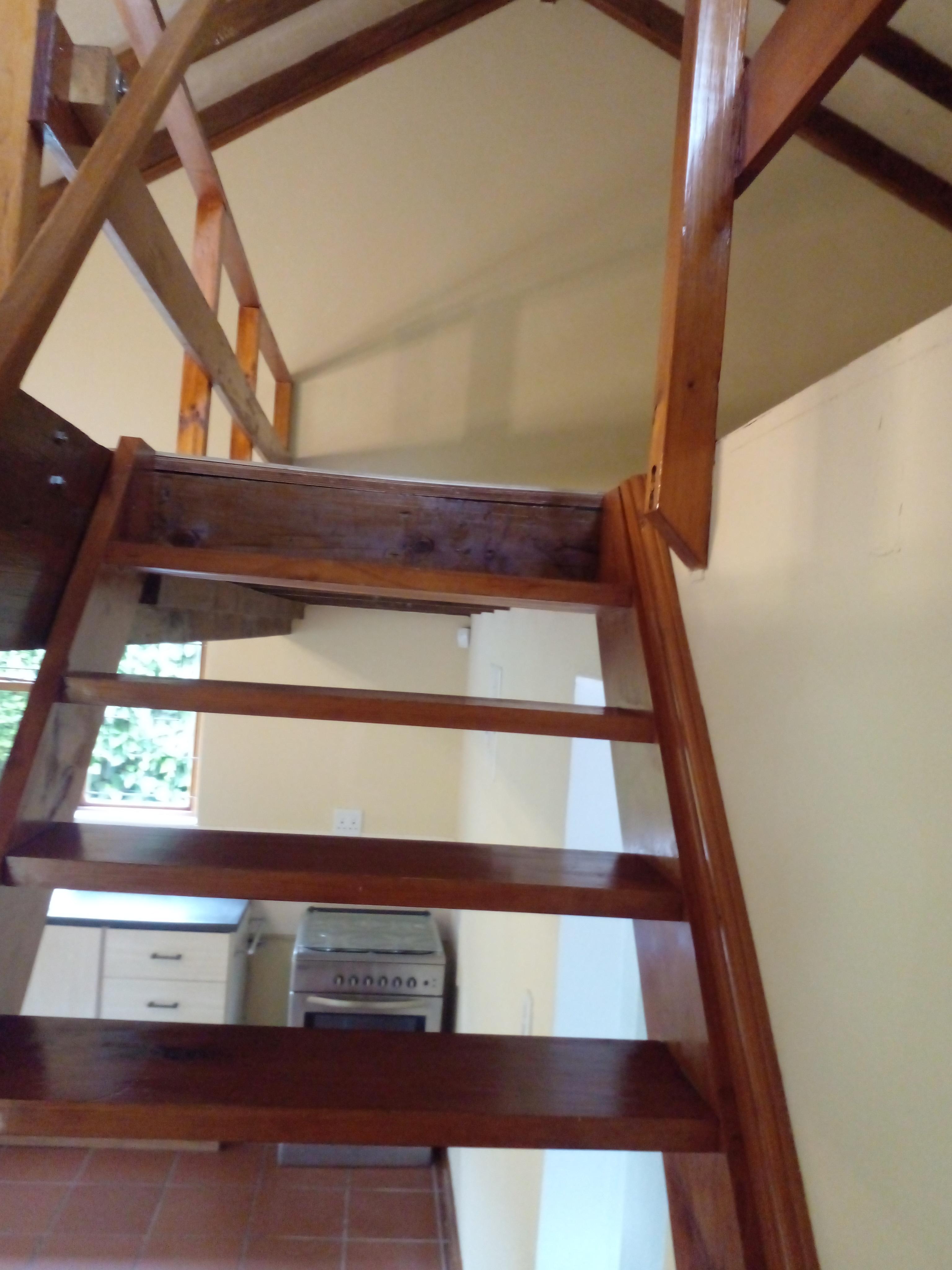 The ground floor features an open-plan kitchen and dining area, along with the main bedroom and bathroom. The kitchen includes a gas hob and oven, with additional space for a washing machine and freezer.