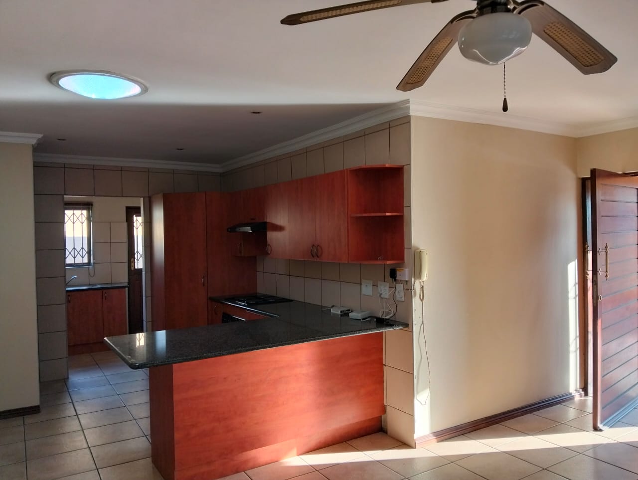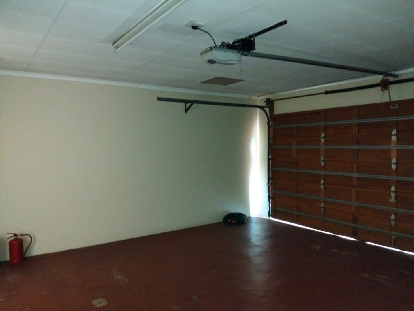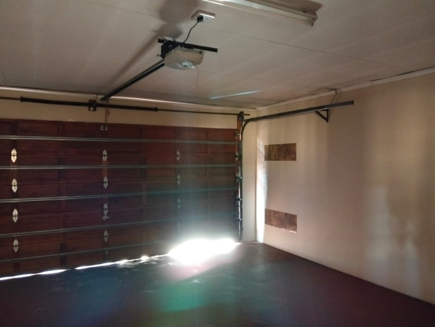 The kitchen is fitted with a four-plate stove and stylish blinds, ideal for daily meal prep. The home includes three generously sized bedrooms, all with built-in cupboards, and two bathrooms, one of which is a main en-suite for added privacy. Secure parking is provided by two garages, ensuring peace of mind.