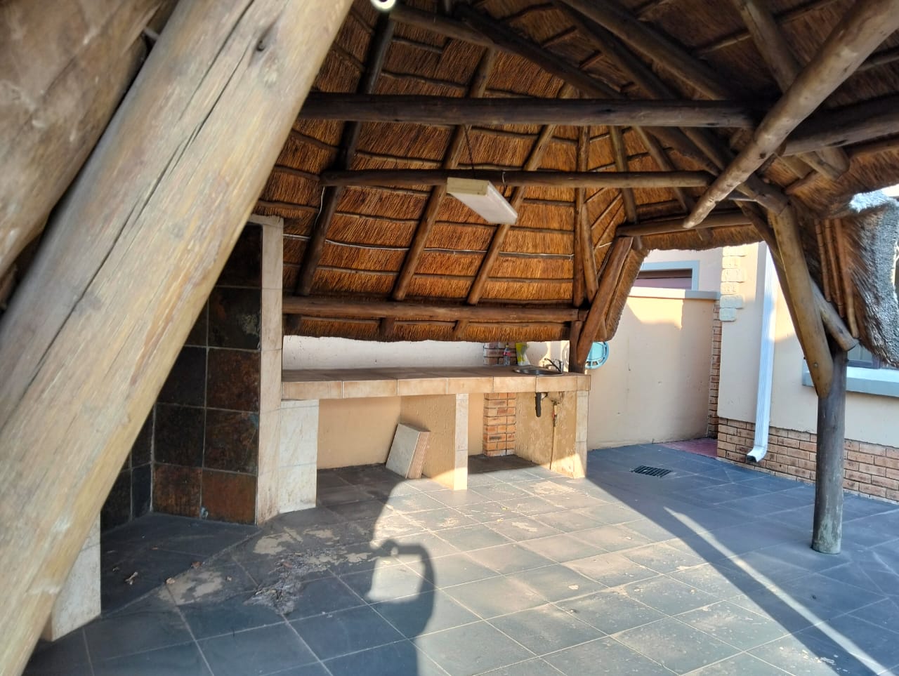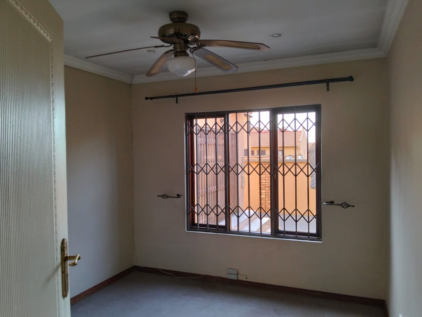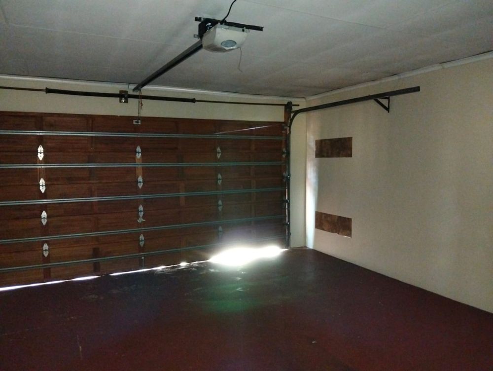 The kitchen is fitted with a four-plate stove and stylish blinds, ideal for daily meal prep. The home includes three generously sized bedrooms, all with built-in cupboards, and two bathrooms, one of which is a main en-suite for added privacy. Secure parking is provided by two garages, ensuring peace of mind.