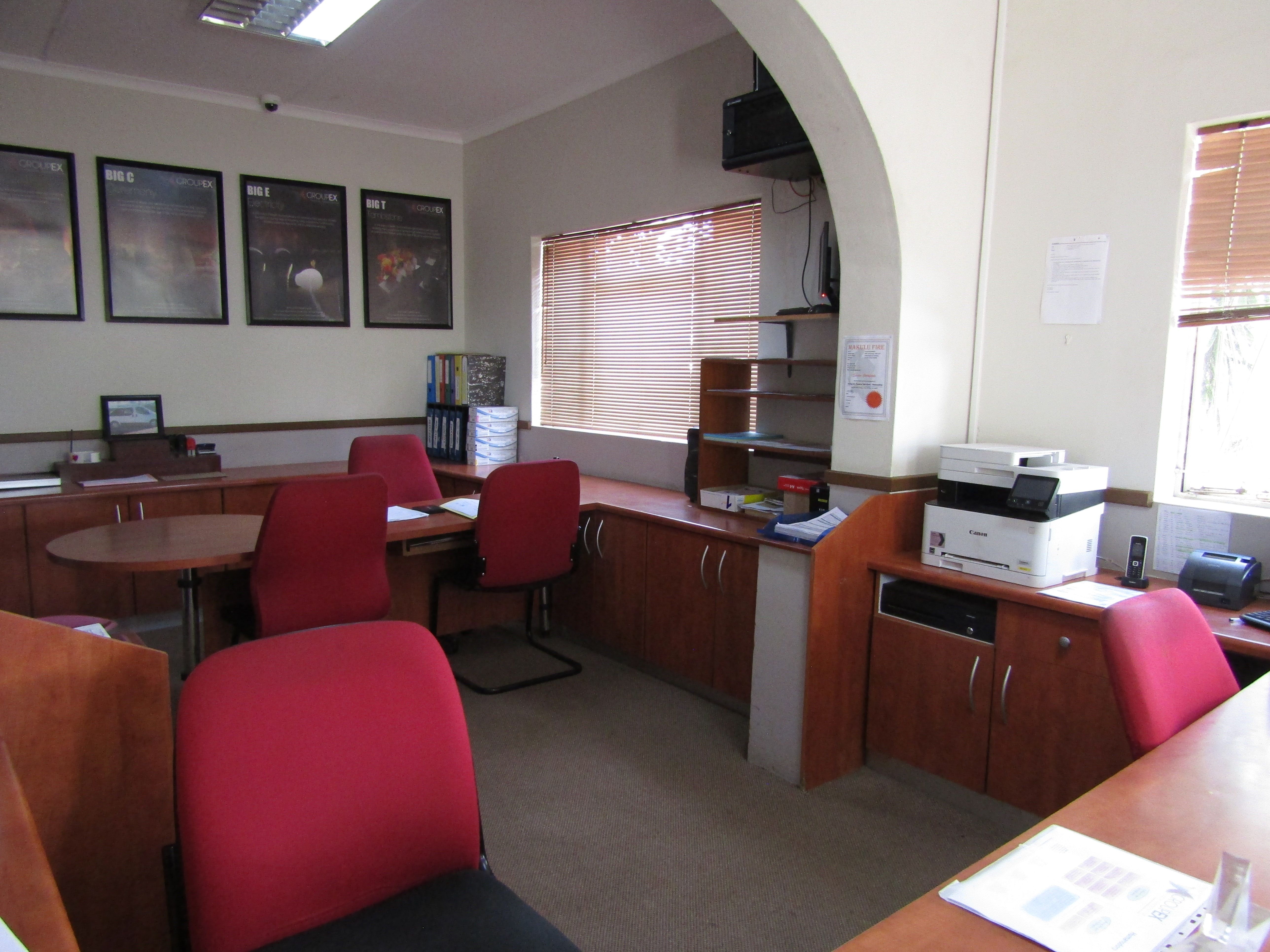 The building has a sunlit entrance hall that leads into a large open-plan main office and reception room. There is also a bathroom, a kitchen, and three separate offices.