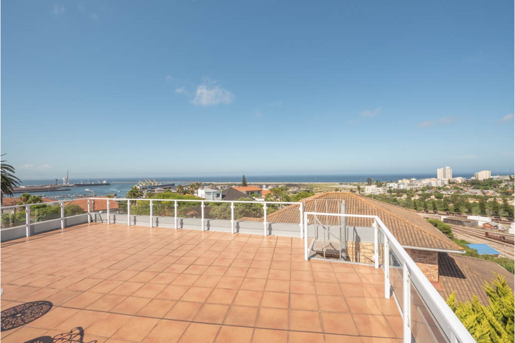 Outdoors, the landscaped garden invites you to unwind, with features including a braai area, sunny patio, and a rooftop terrace that offers breathtaking sea views—ideal for morning coffee or sunset gatherings. The automated double garage and ample on-site parking for up to eight vehicles add practicality to this impressive offering.