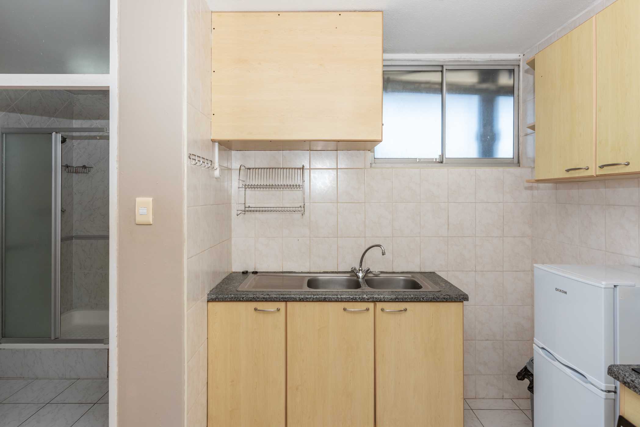 The apartment is neat, open-plan, and thoughtfully designed, even including space for a washing machine. Lovely parquet flooring and a nook in kitchen with chairs.