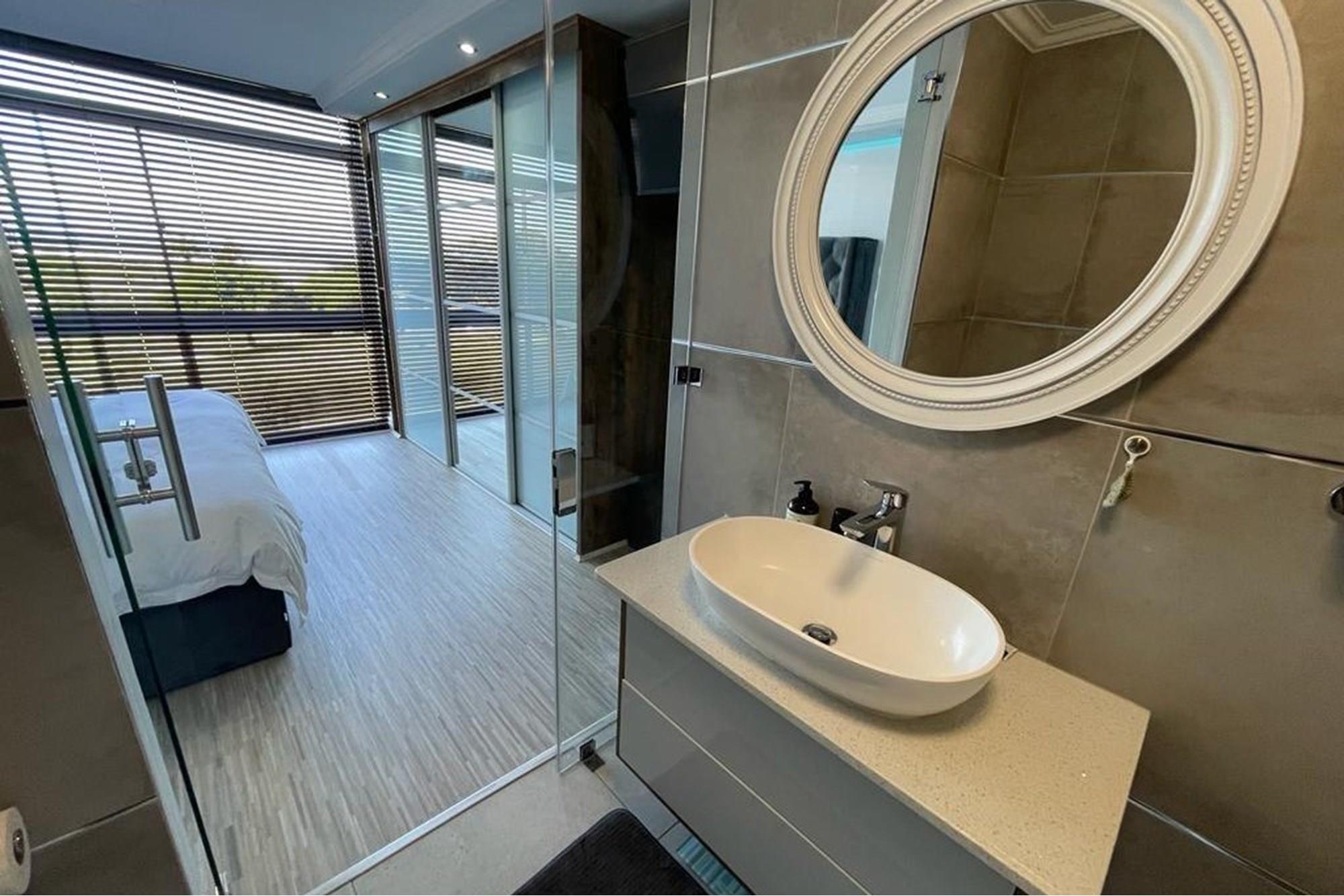 Main bedroom: King-size bed with a luxurious open-plan en-suite featuring a Victorian bath — unwind while enjoying a serene ocean view