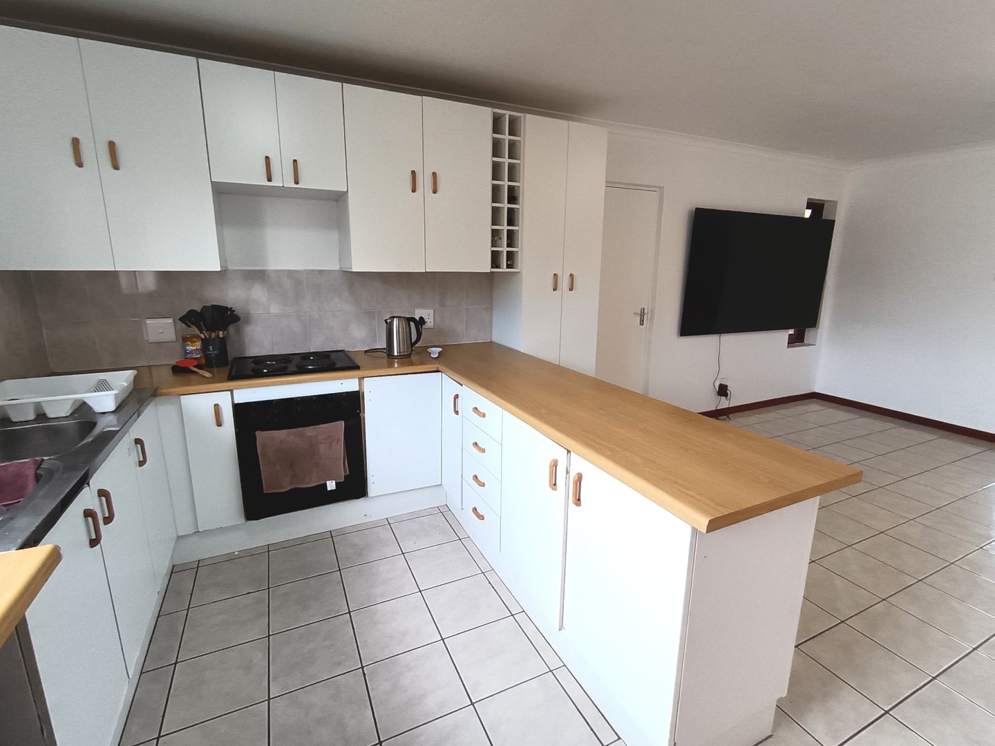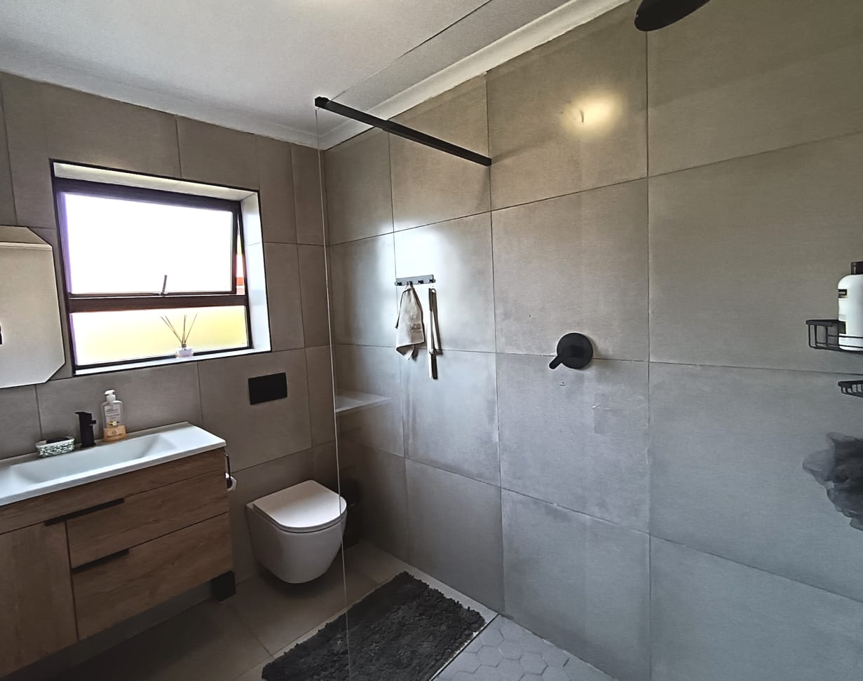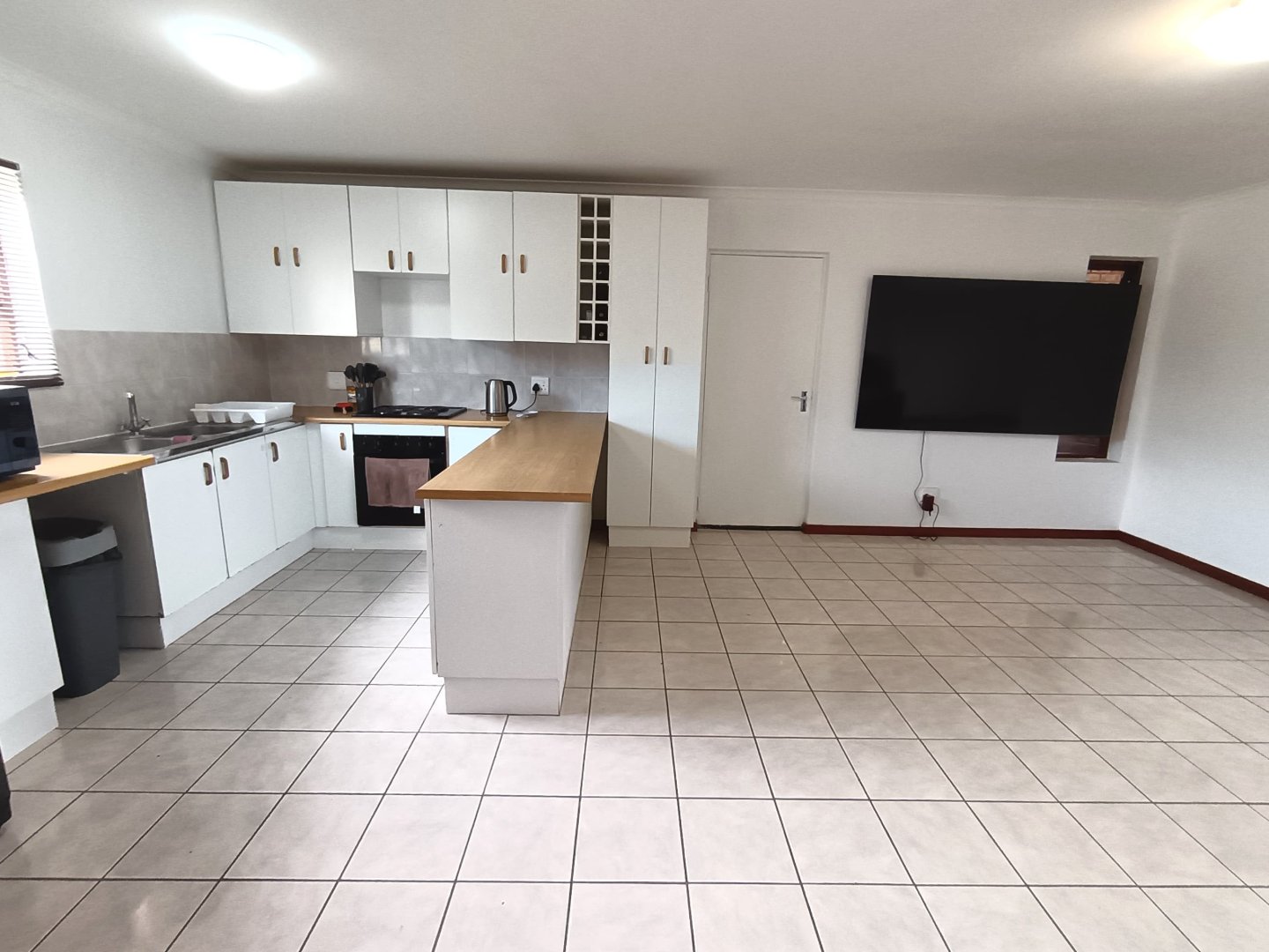 The open-plan living area is exceptionally generous, neatly tiled, ideal for relaxing or entertaining. A separate semi open plan dining room flows into a cosy built-in braai area, which opens to a small, private, enclosed yard.