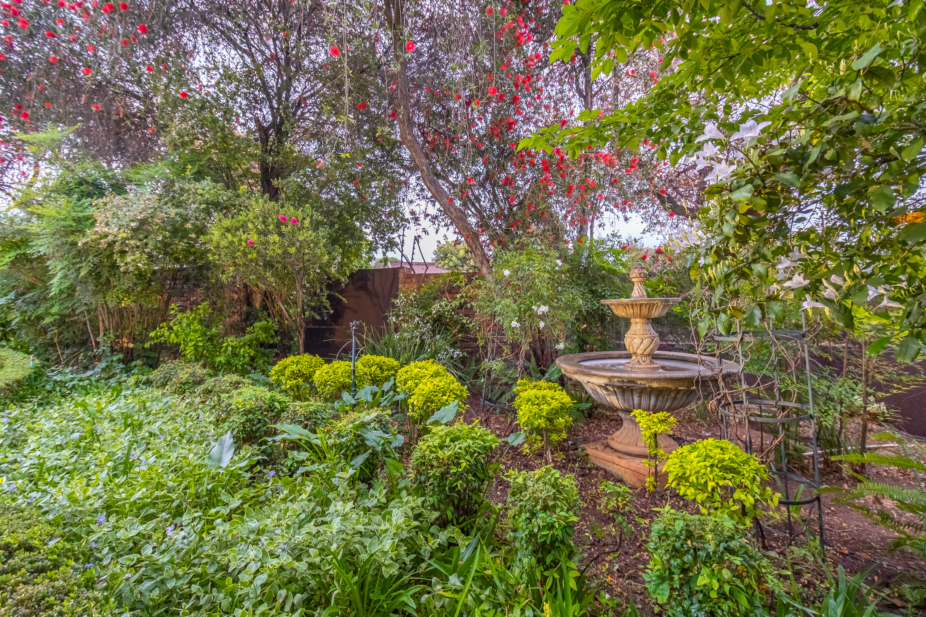 Set behind a lush, established Italian-style garden—complete with topiary hedges, mature plantings, and five water features—the home offers privacy and a serene setting from the moment you arrive.