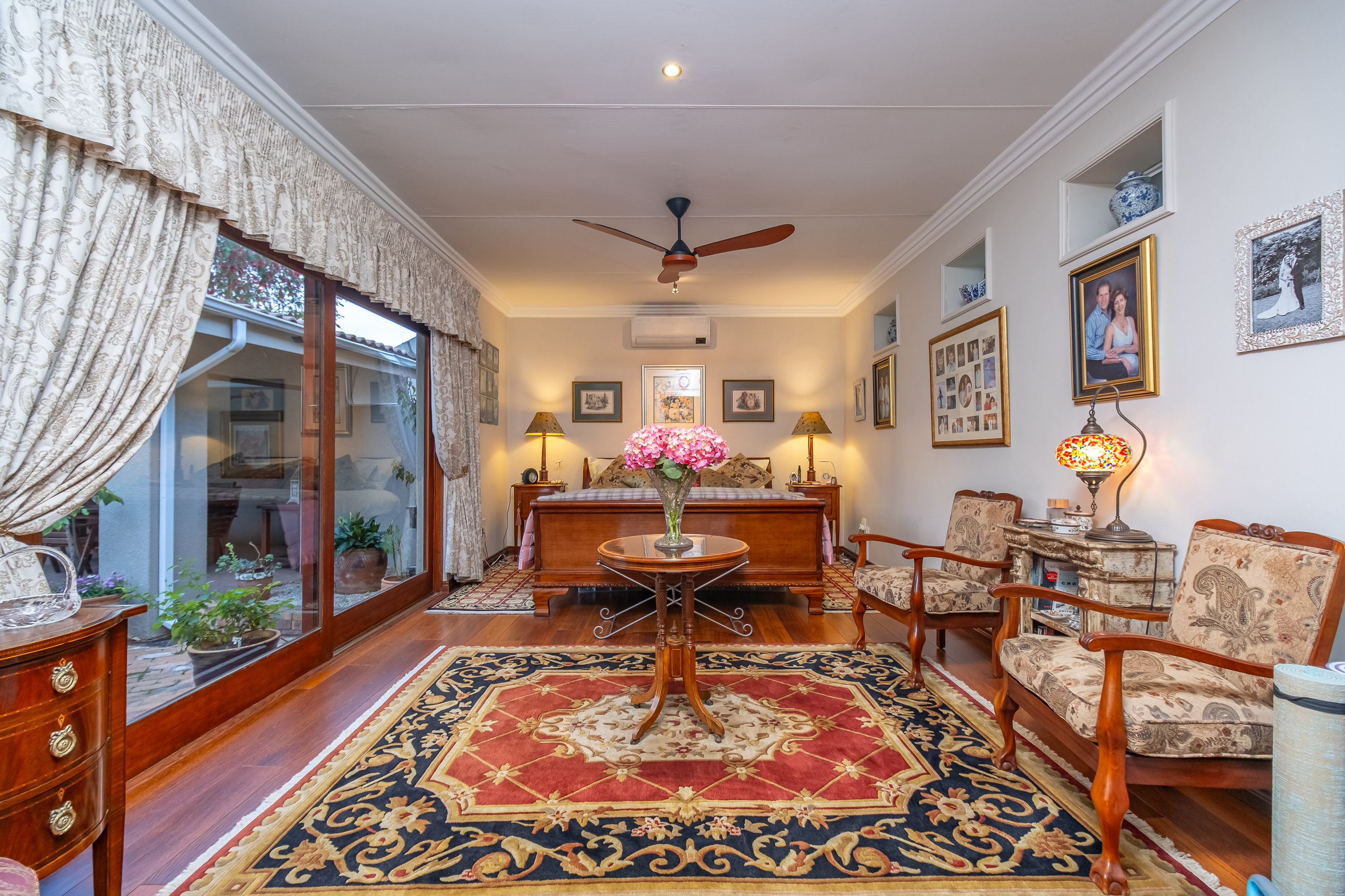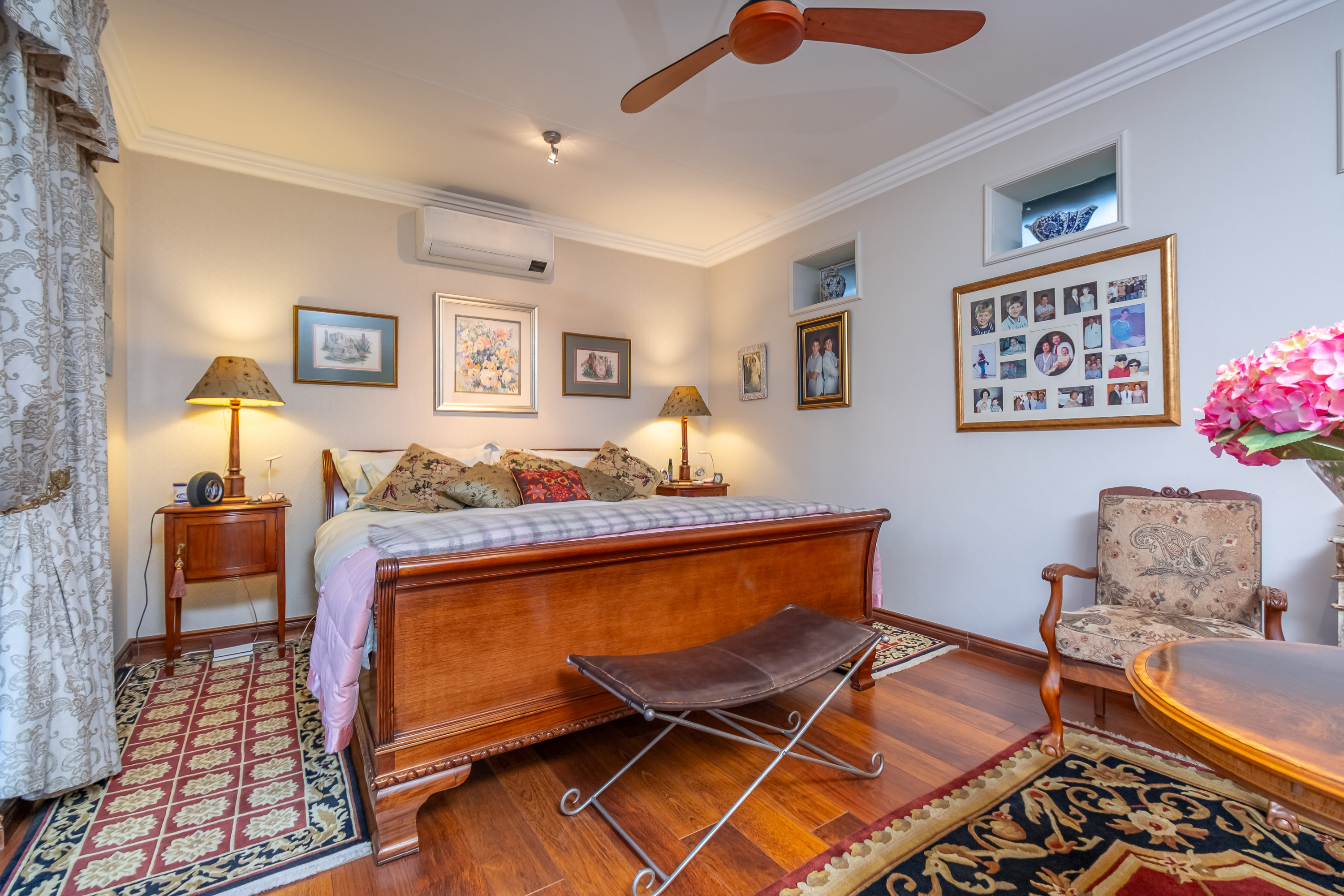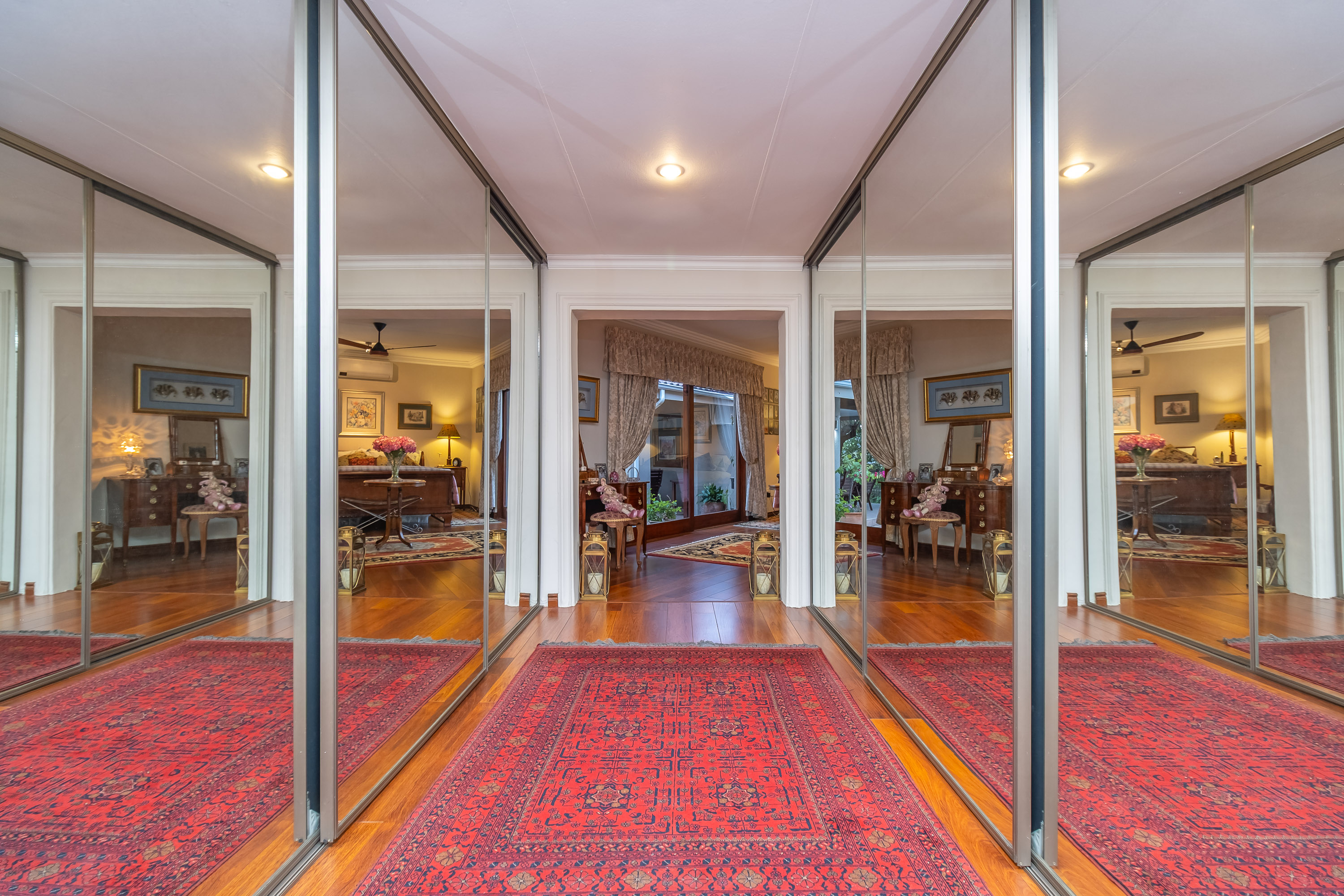 There are three bedrooms, each with built-in cupboards. The main suite includes a walk-through mirrored dressing area and en suite bathroom. Second bathroom with bath.