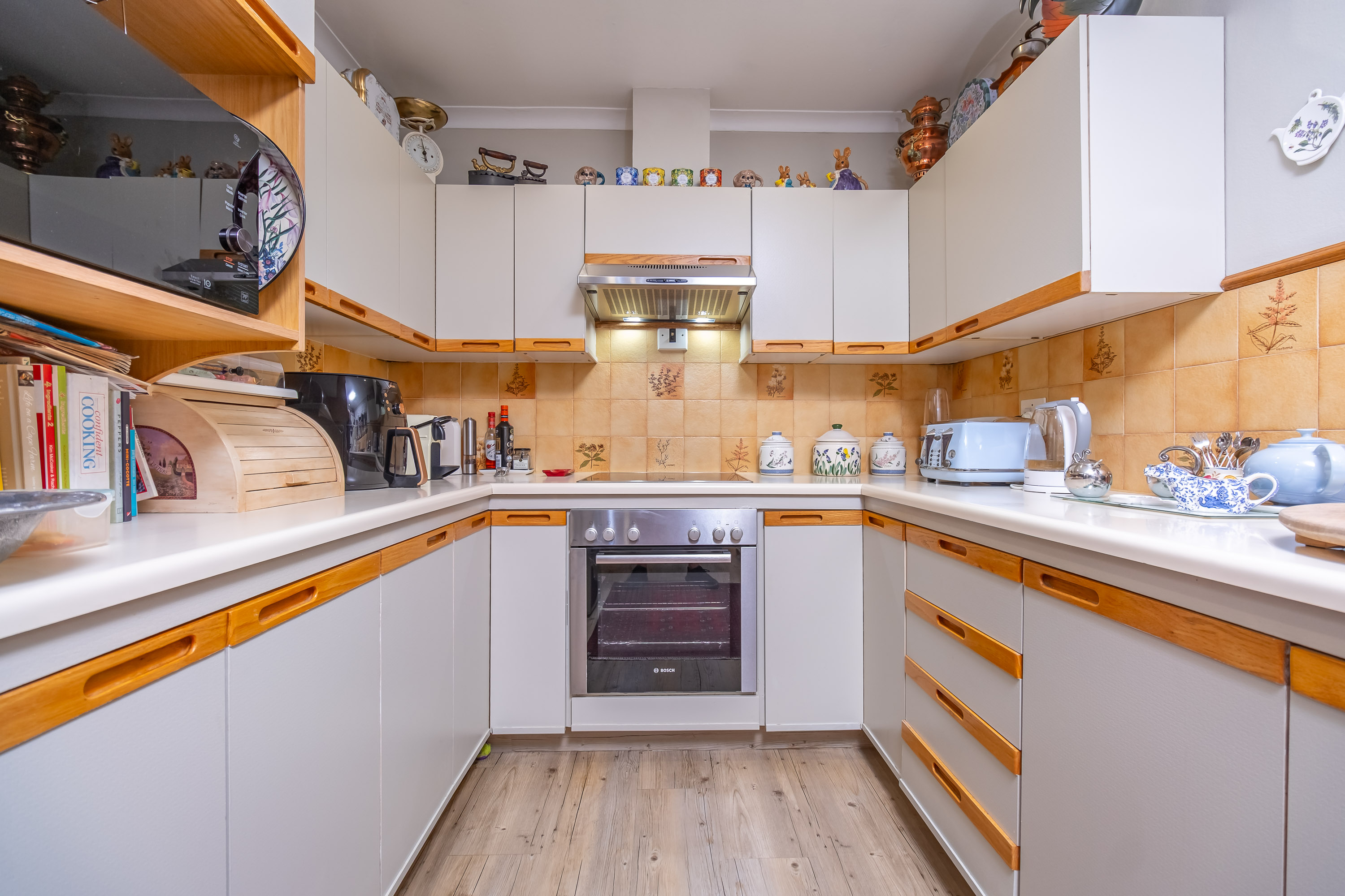 The eat-in galley kitchen is practical and functional, with an adjacent study nook perfect for remote work or homework.