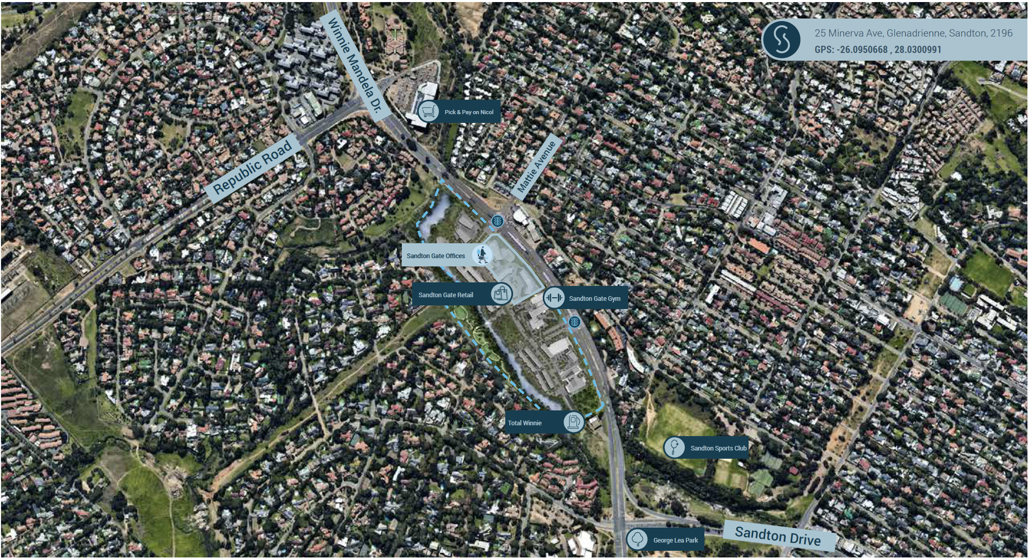 Well-located off the corner of Republic Rd & Woodlands Avenue, this site offers excellent branding opportunities for passing traffic. The property is situated opposite the Pick 'n Pay Nicol flagship store on Winnie Mandela Drive & the new Abland's Sandton Gate mixed use site, under development on the southern side. Access is from Woodlands Avenue.