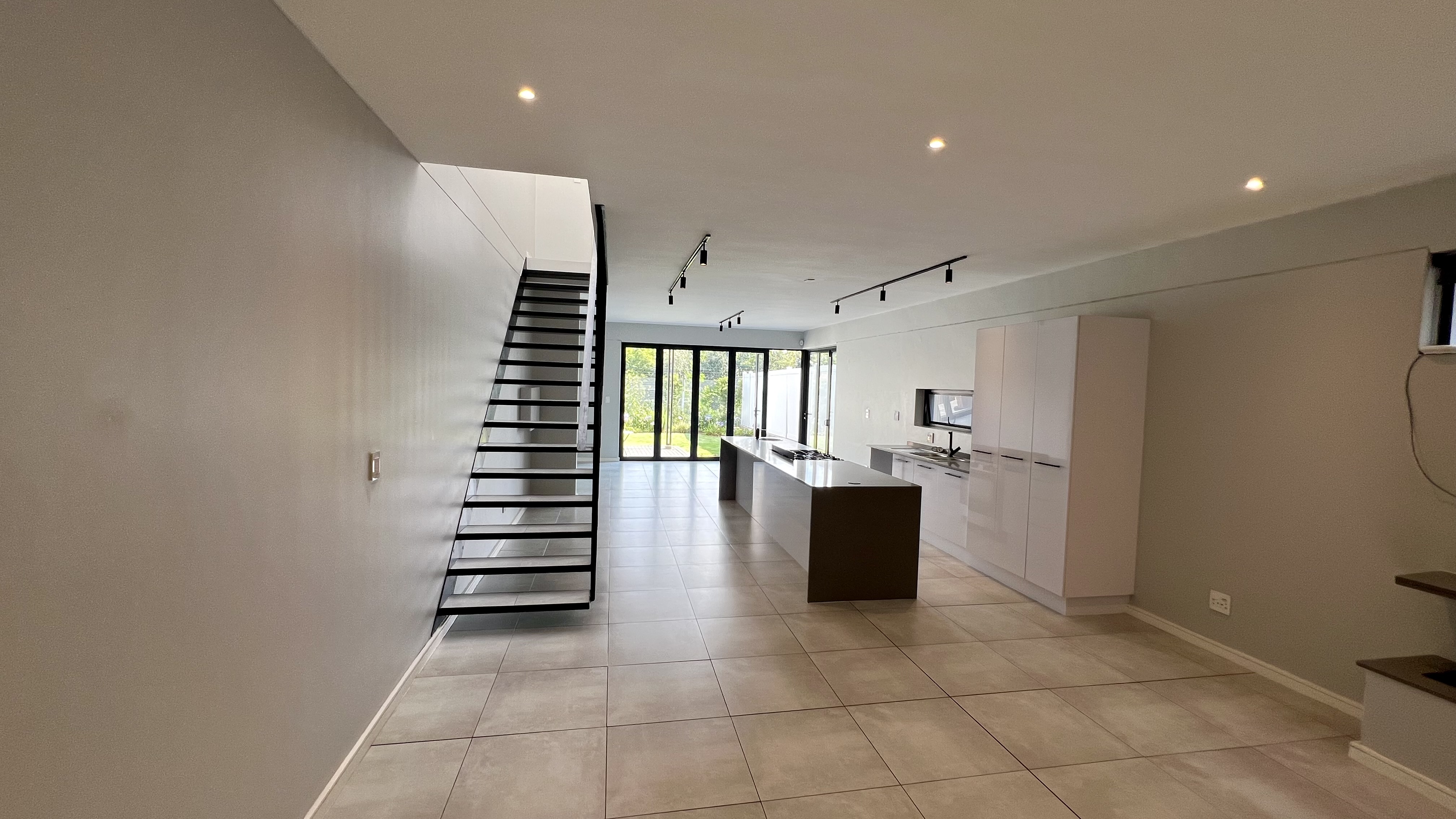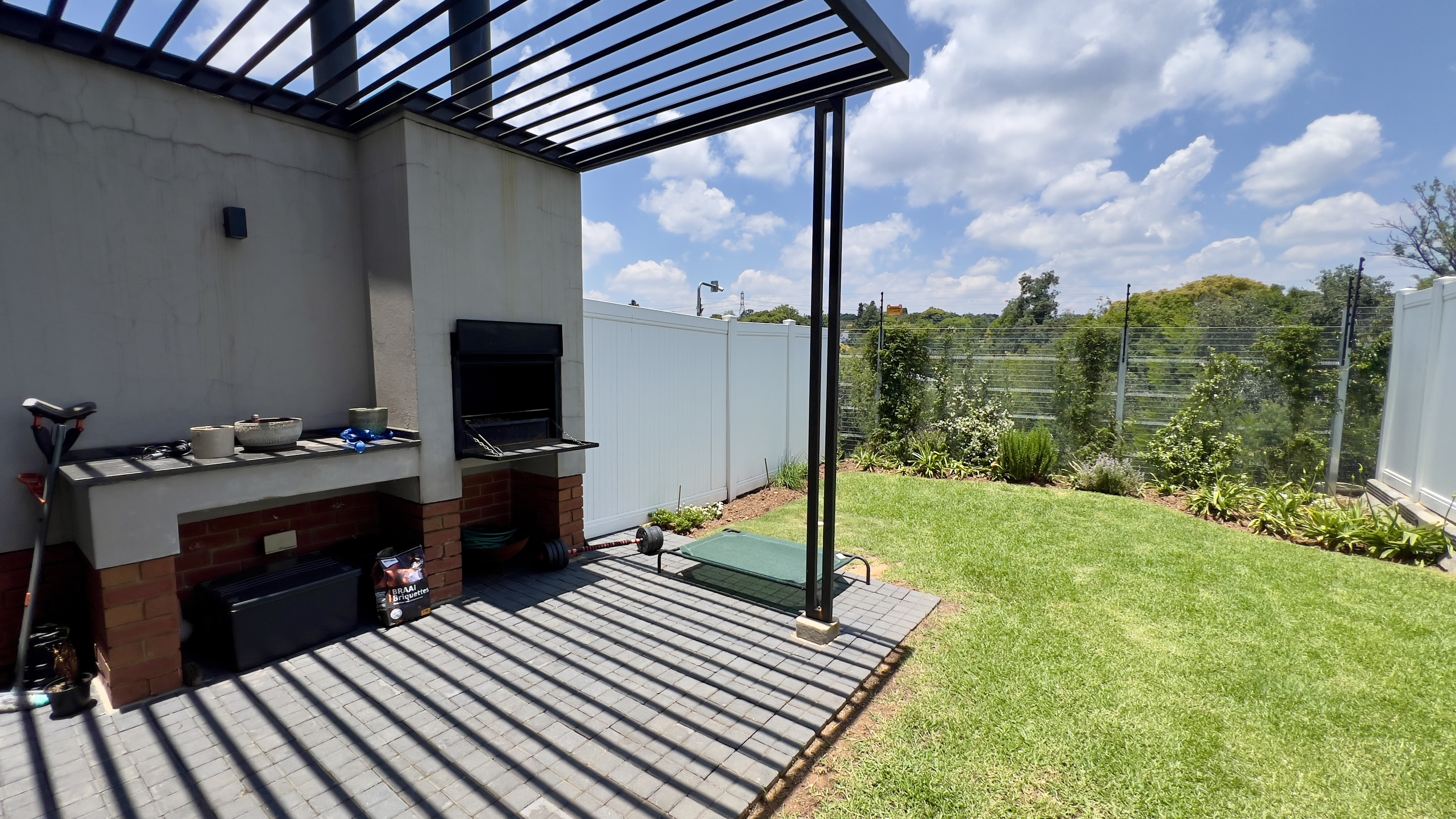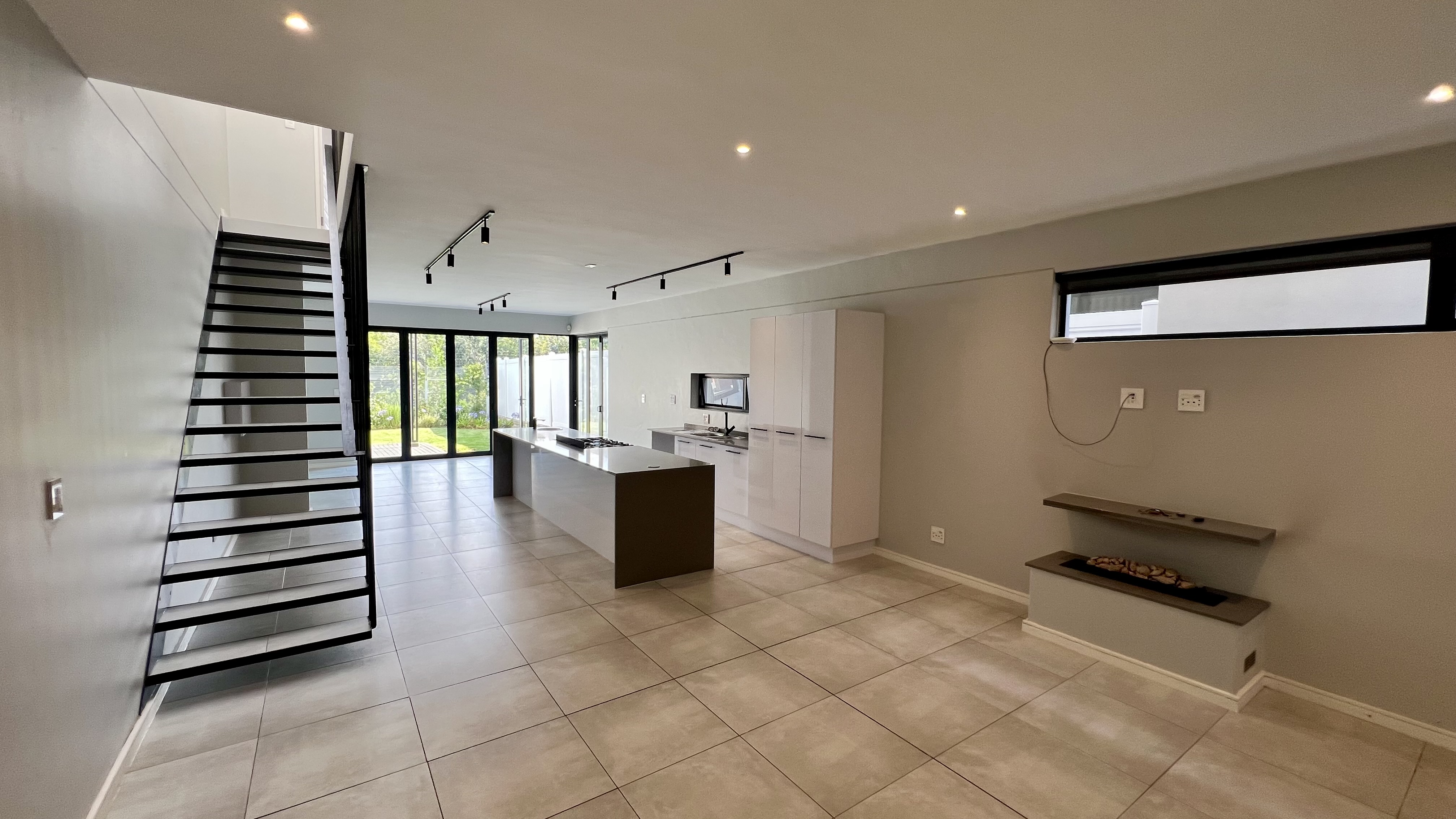 Upon entering through the large glass front door, you are greeted by a welcoming reception area with direct access from the single automated garage. To the right, the home opens into a beautifully designed living space featuring a stylish dining area with a gas fire place and a contemporary kitchen equipped with a 5-plate gas stove. The lounge flows seamlessly onto a private back garden with a covered patio and built-in braai—perfect for entertaining. You’ll also enjoy the tranquil sound of flowing water just beyond your garden.
