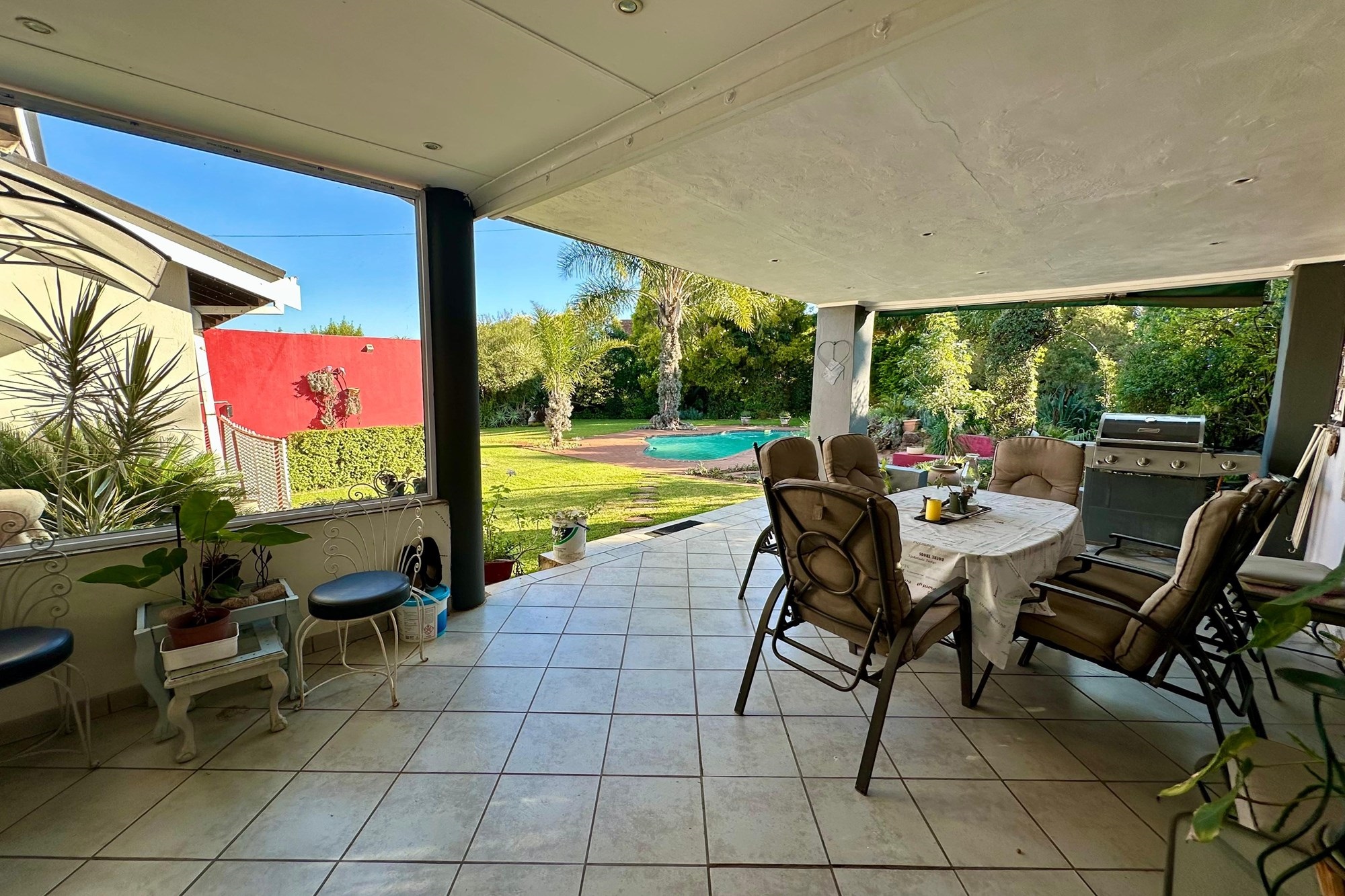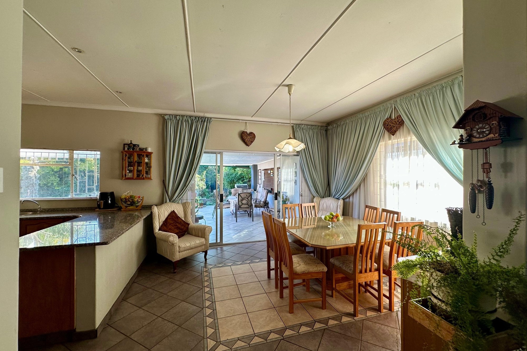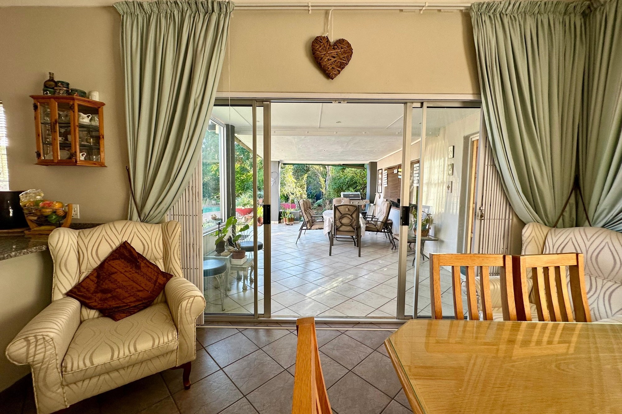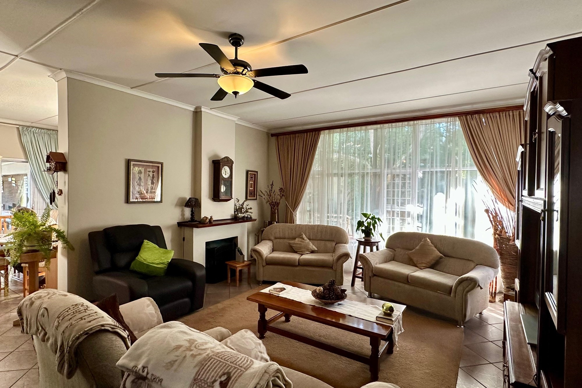 Step into a generous, open-plan living space featuring a modern kitchen with ample built-in cabinetry, seamlessly connected to the dining and lounge areas — all tiled for effortless upkeep. A second, oversized lounge with a cozy fireplace, ceiling fan, and sliding doors opens to a tiled entertainment patio overlooking a sparkling pool — ideal for weekend braais and summer relaxation.