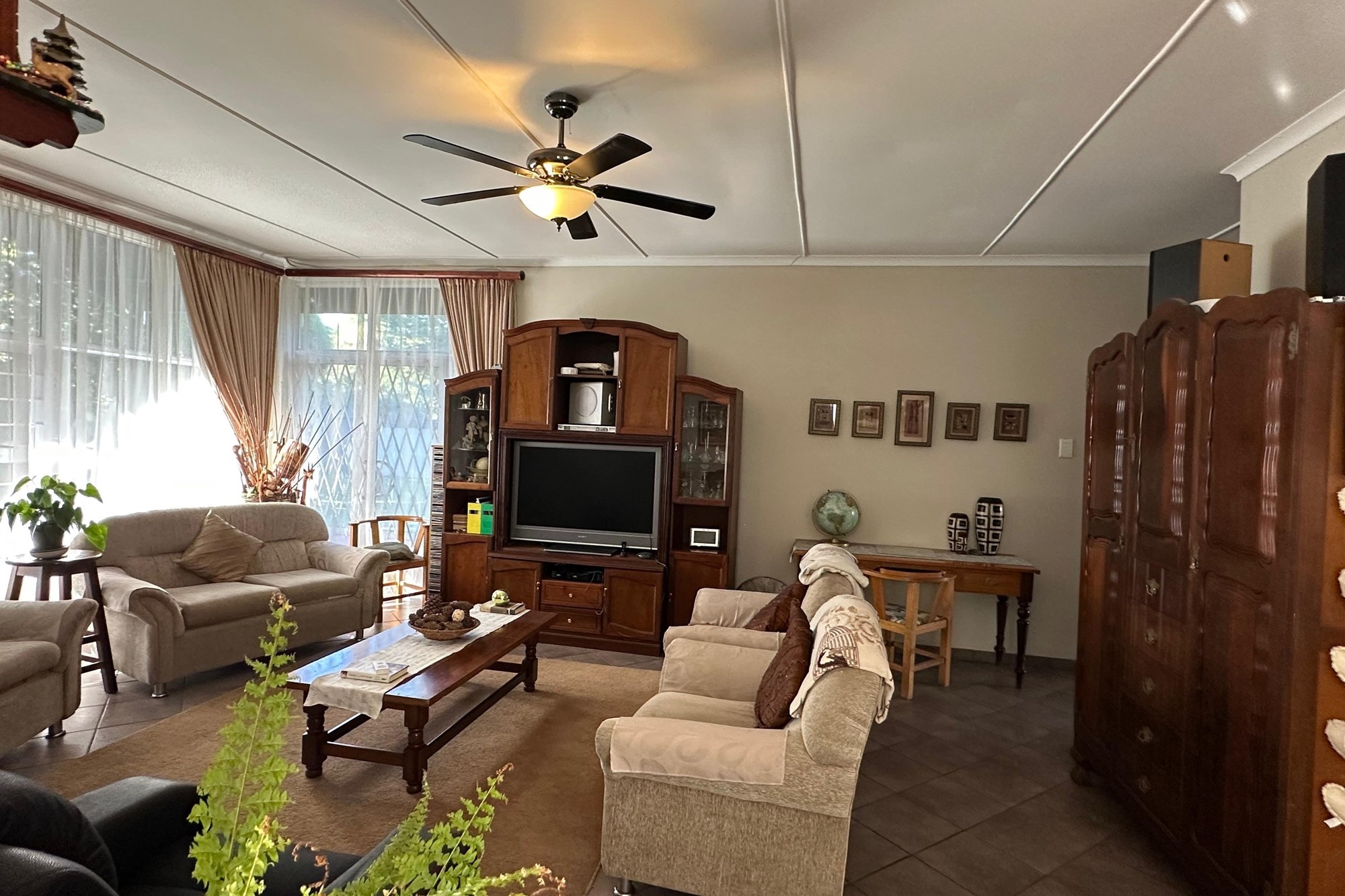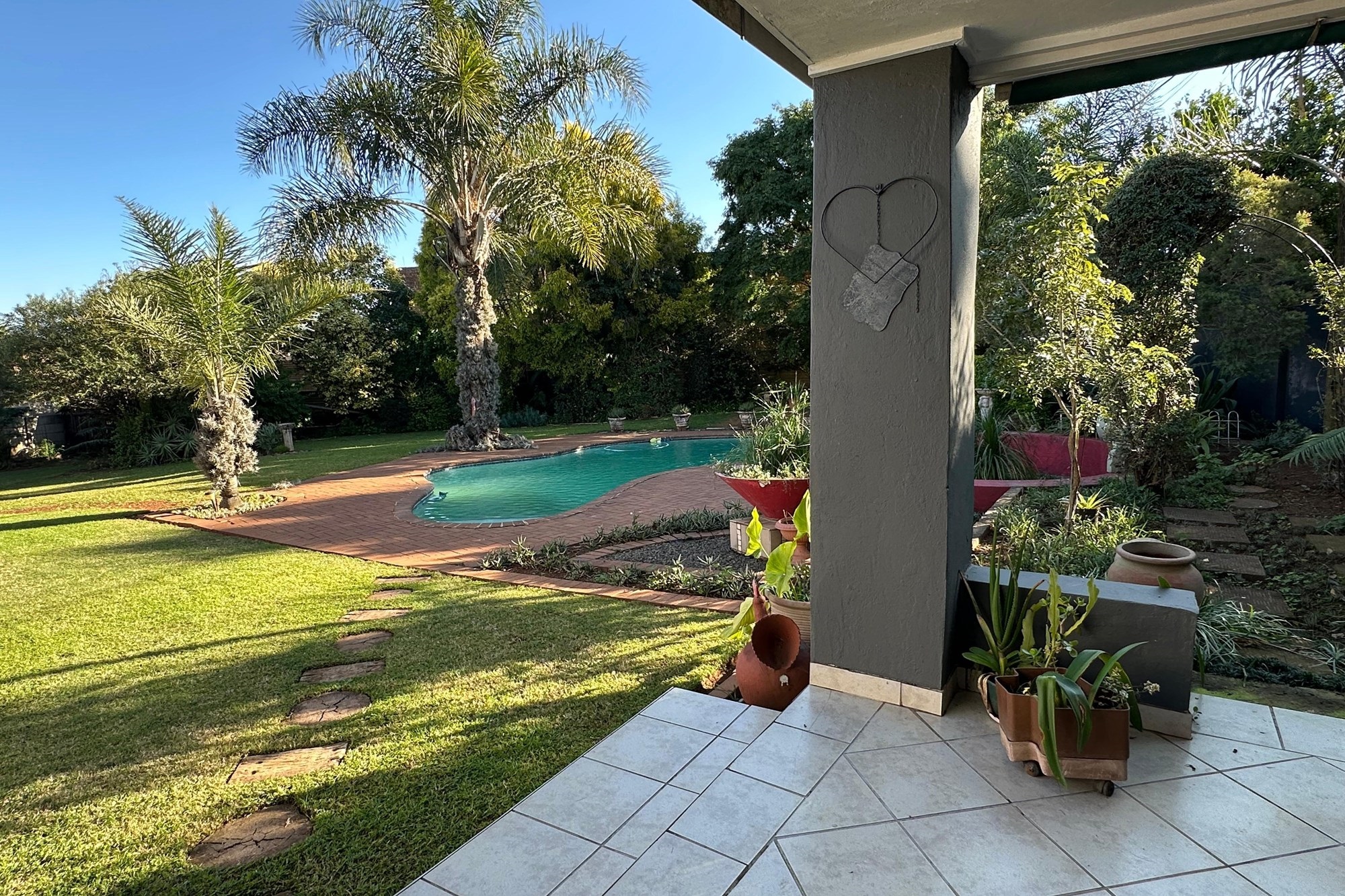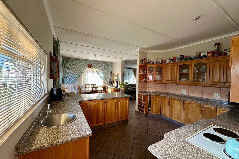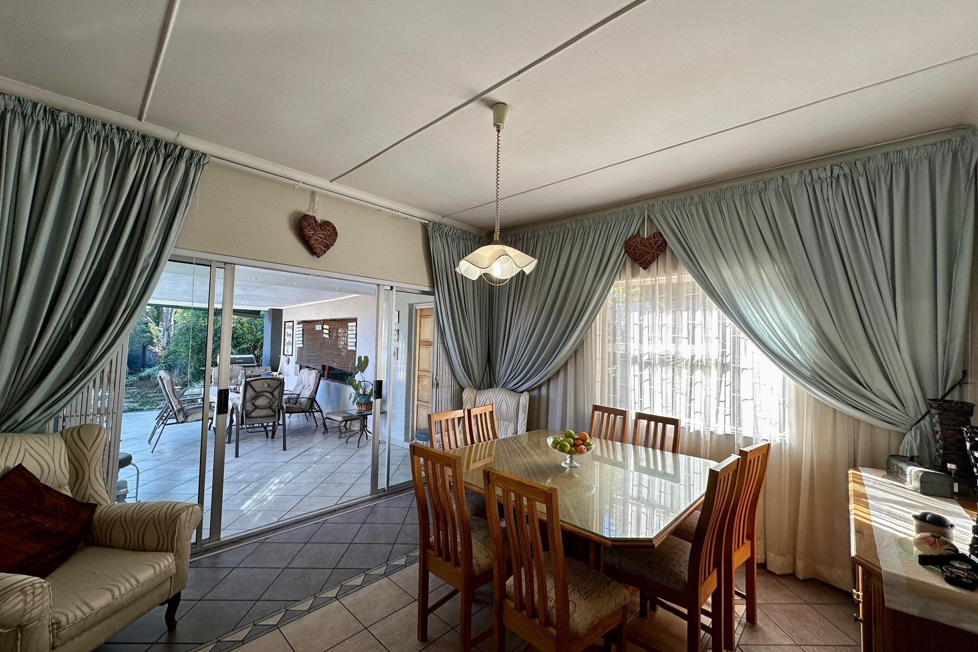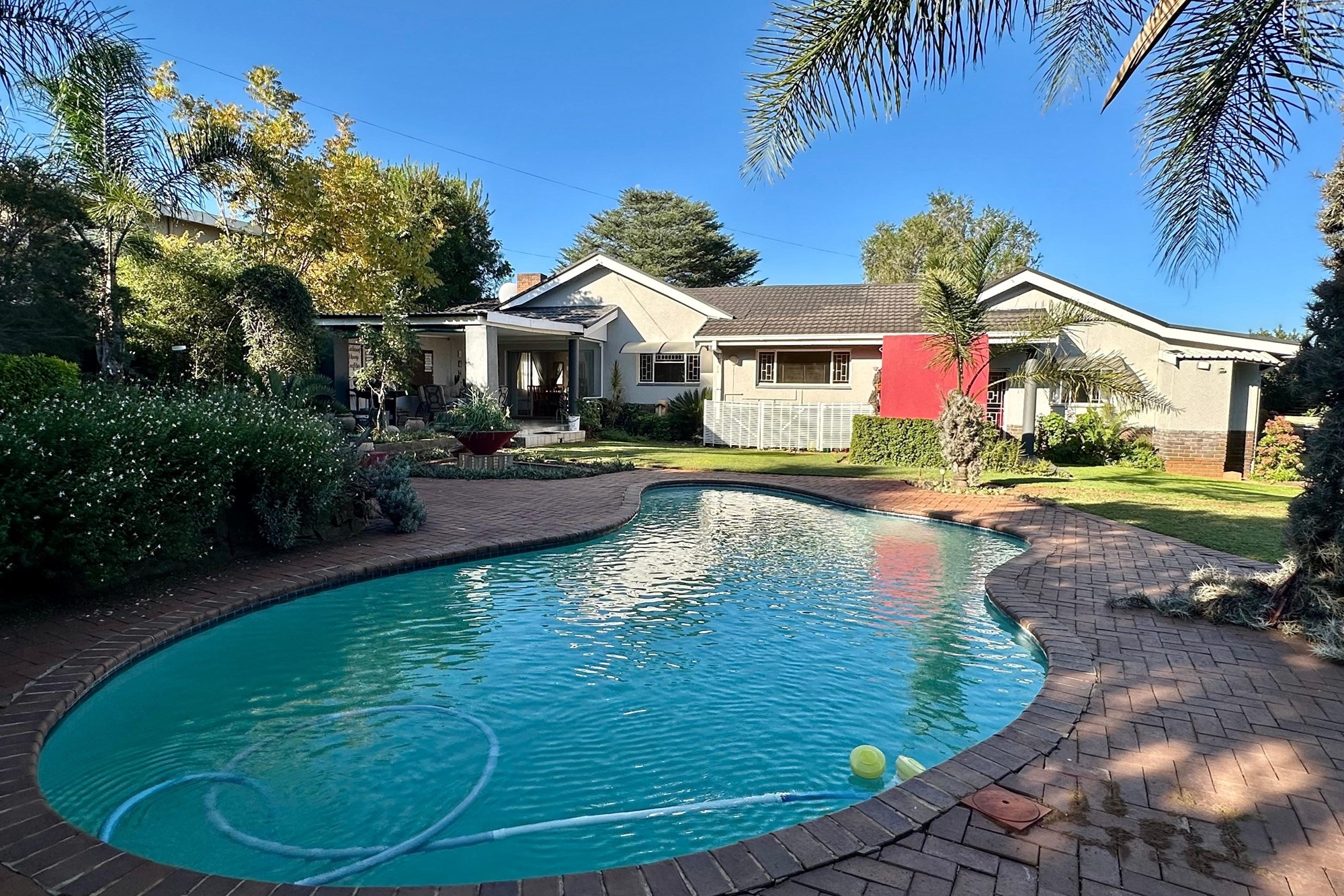 Step into a generous, open-plan living space featuring a modern kitchen with ample built-in cabinetry, seamlessly connected to the dining and lounge areas — all tiled for effortless upkeep. A second, oversized lounge with a cozy fireplace, ceiling fan, and sliding doors opens to a tiled entertainment patio overlooking a sparkling pool — ideal for weekend braais and summer relaxation.