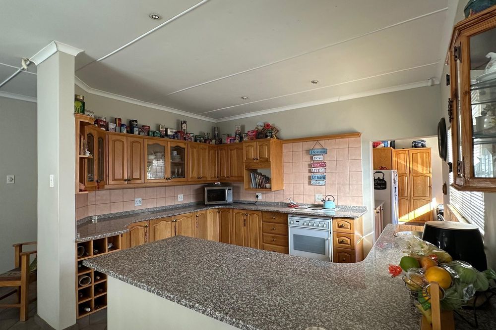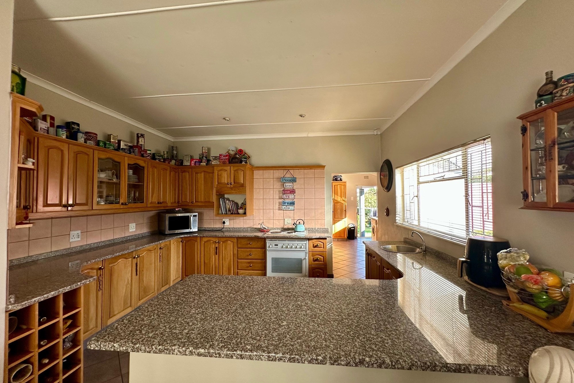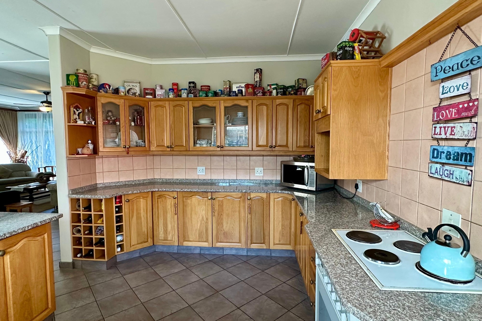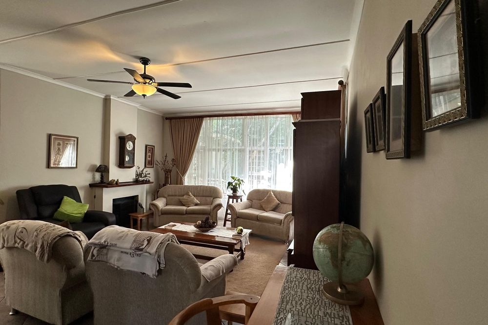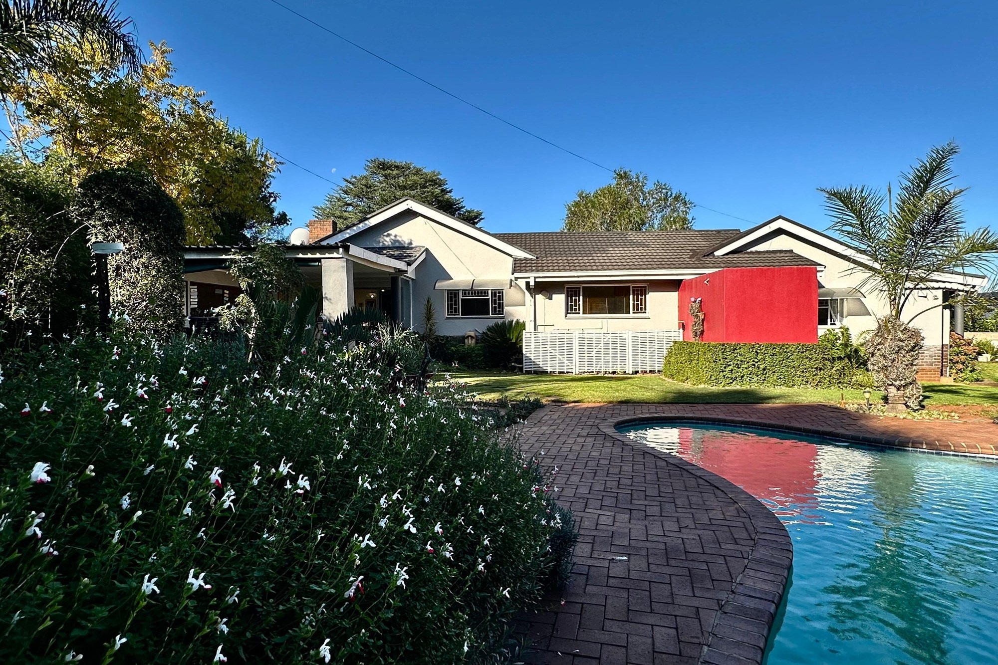 Step into a generous, open-plan living space featuring a modern kitchen with ample built-in cabinetry, seamlessly connected to the dining and lounge areas — all tiled for effortless upkeep. A second, oversized lounge with a cozy fireplace, ceiling fan, and sliding doors opens to a tiled entertainment patio overlooking a sparkling pool — ideal for weekend braais and summer relaxation.