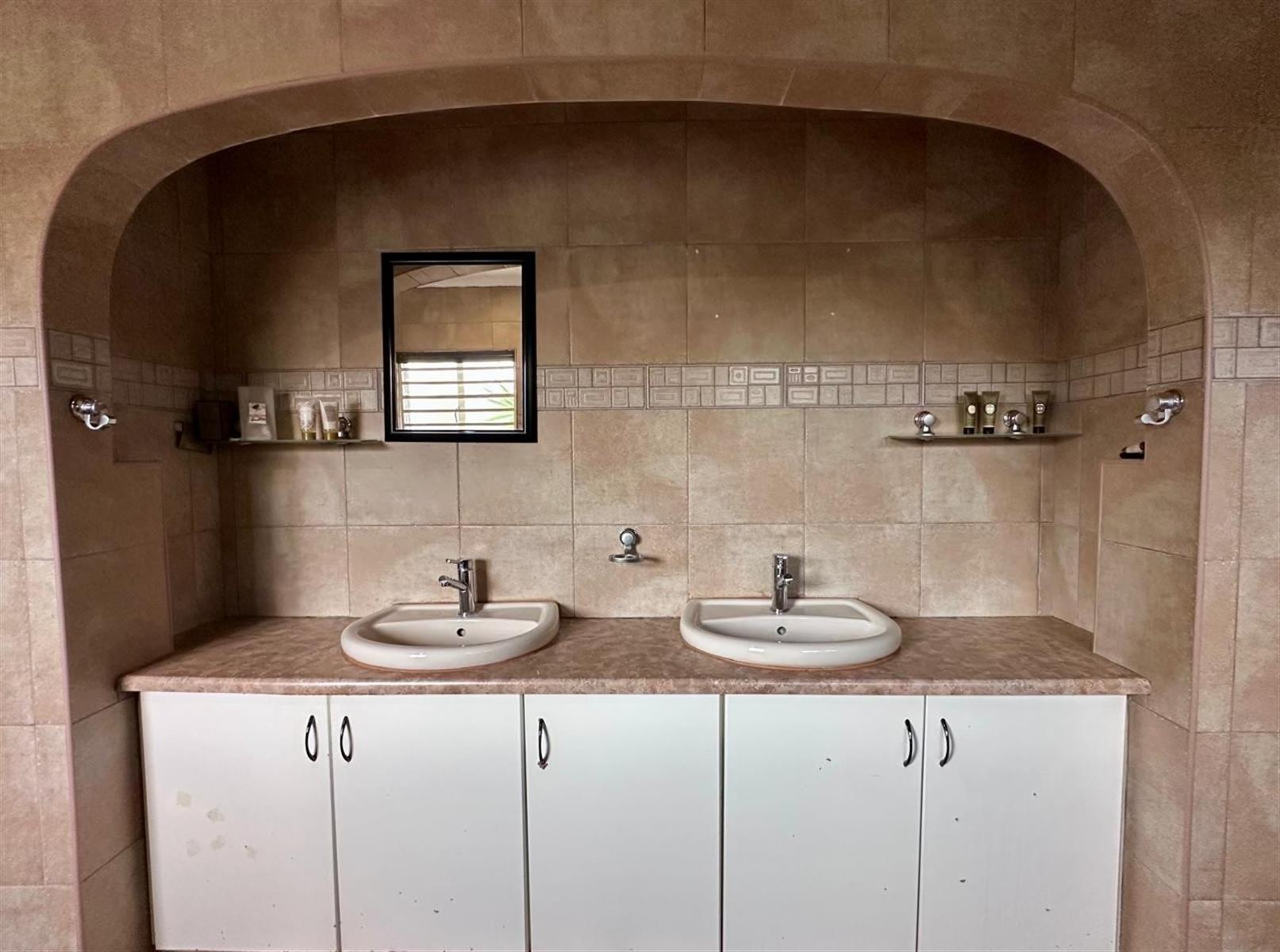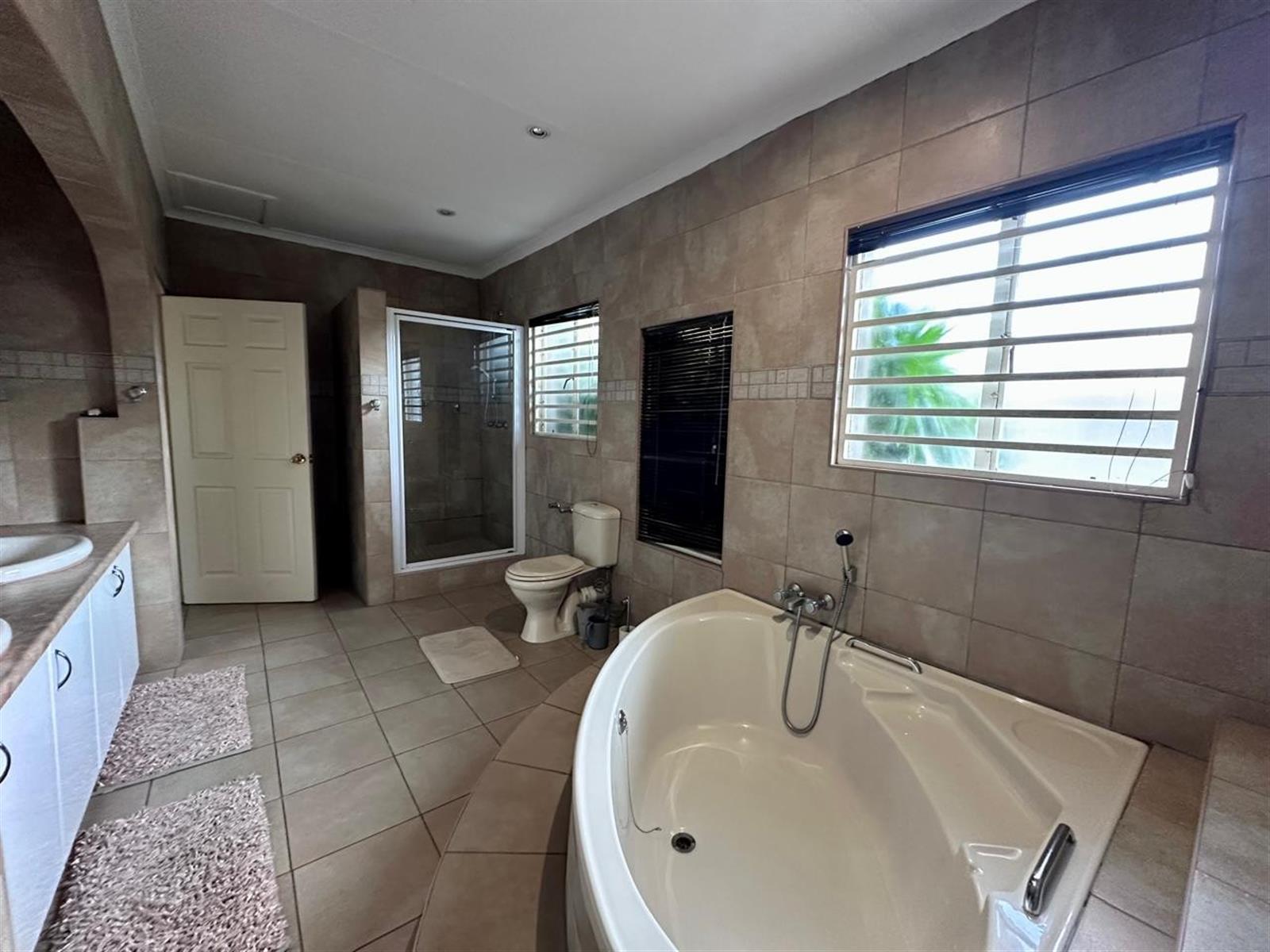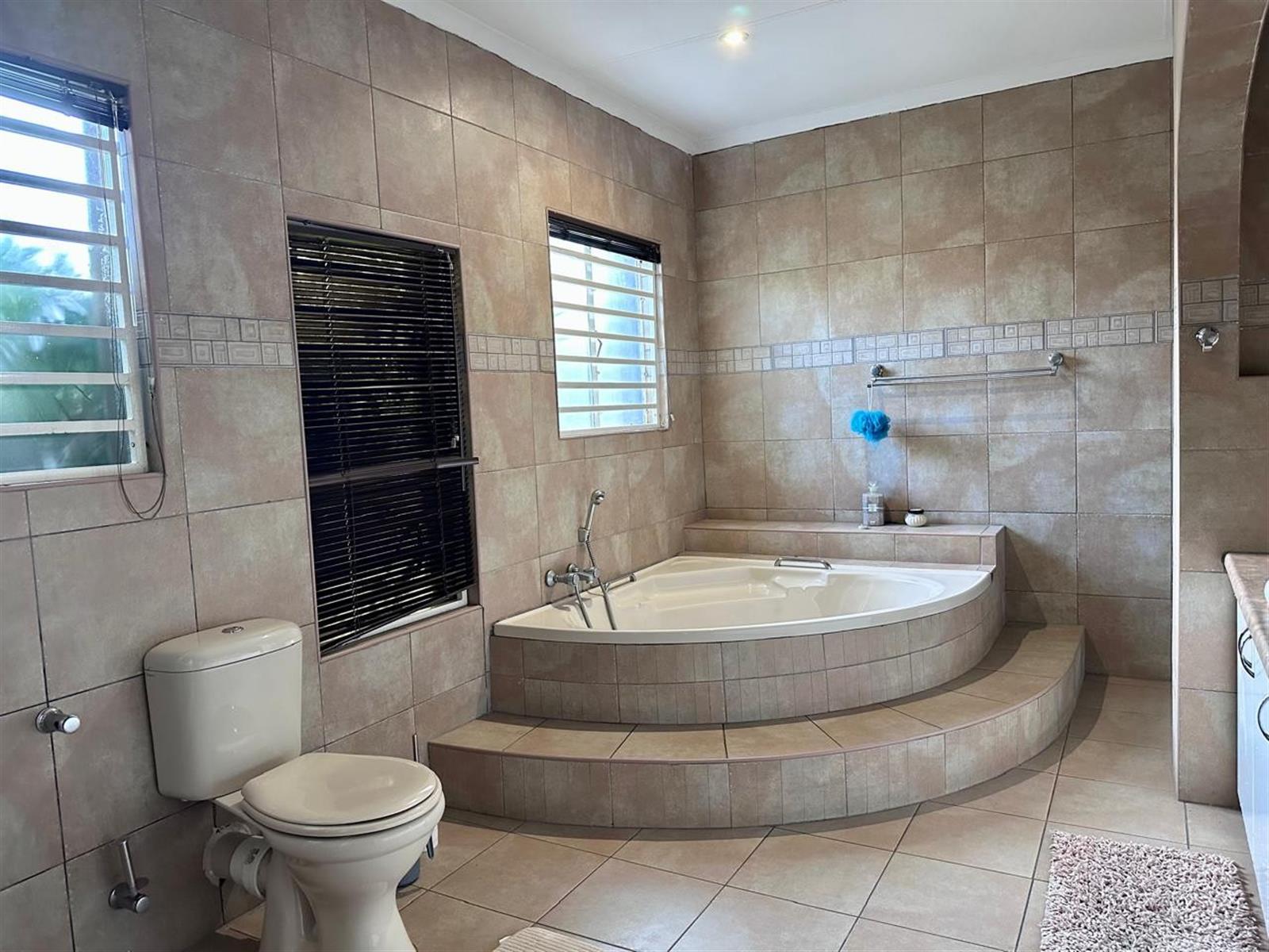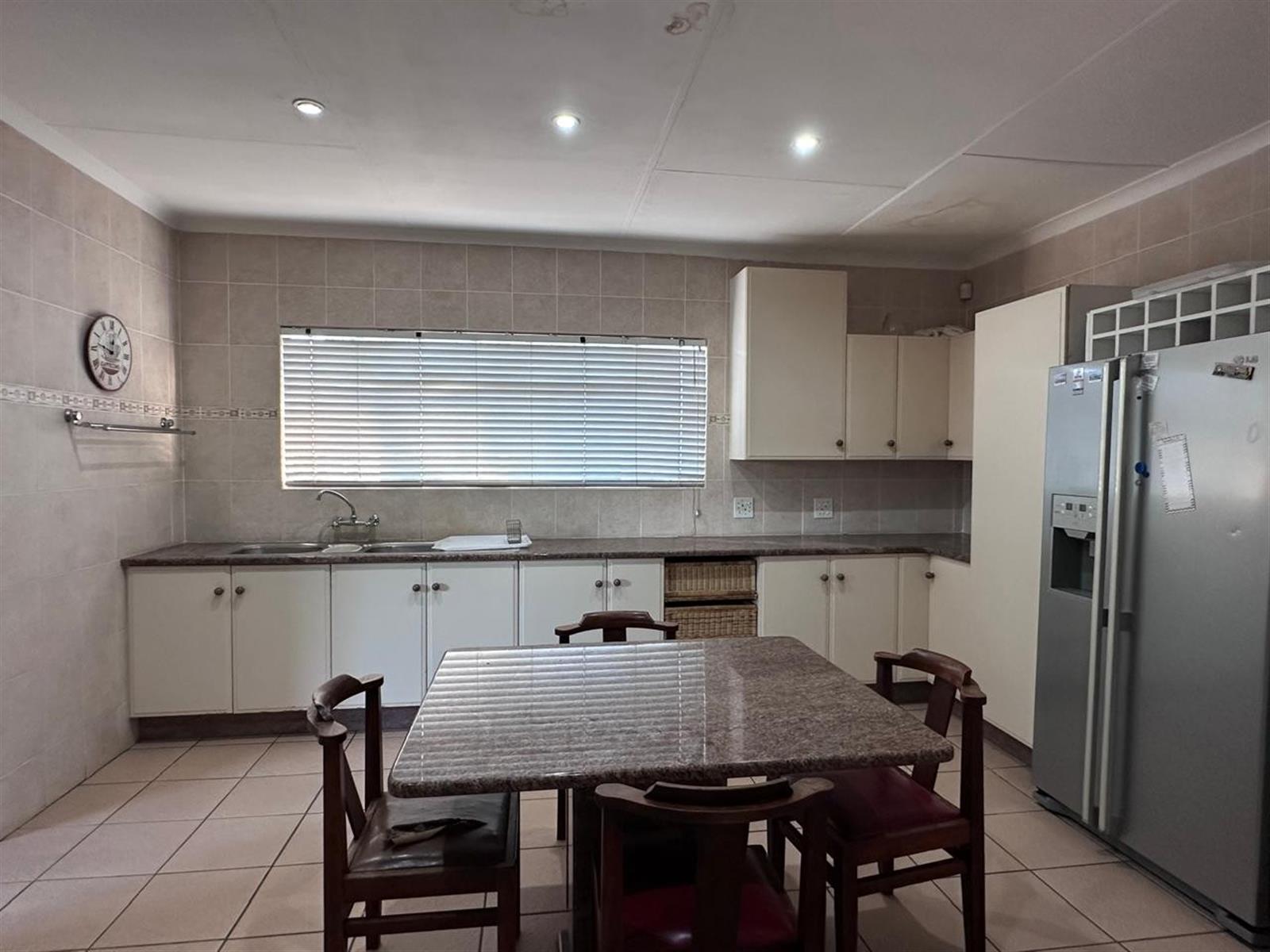 Three garages are on offer, with one converted into a private office, perfect for working from home. Additional features include a domestic room with toilet, landscaped gardens with water features, garden lighting, and irrigation, as well as a braai area and jacuzzi for relaxed outdoor entertaining.