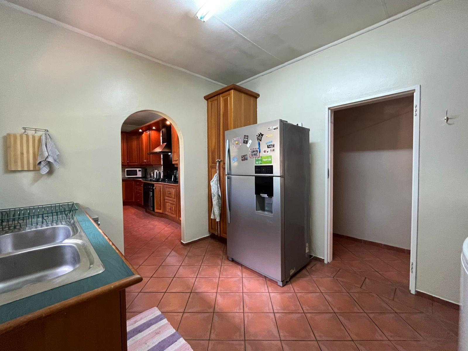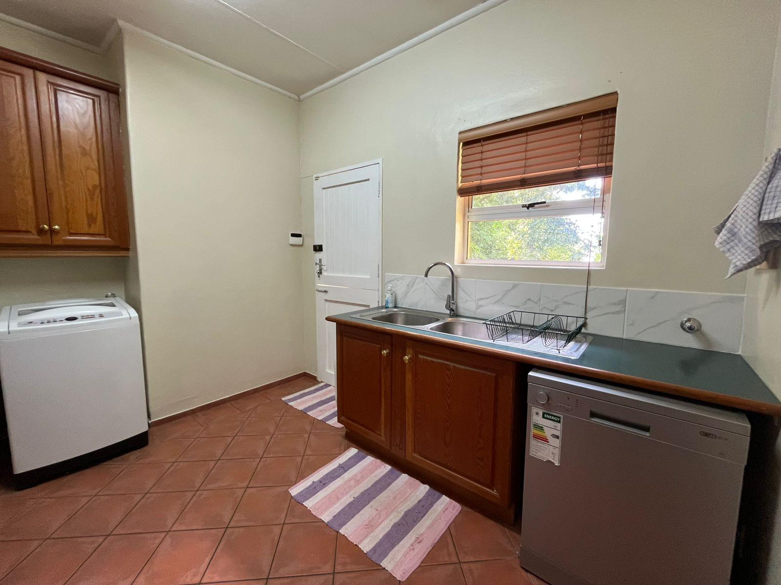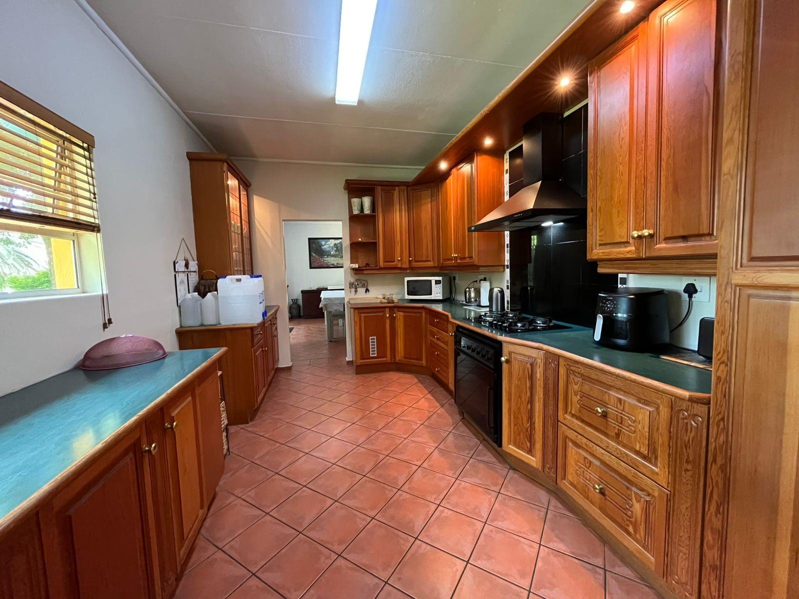 The heart of the home is a stunning kitchen featuring solid hardwood cupboards, a gas hob, and a separate scullery with built-in cupboards to keep everything neat and organised.