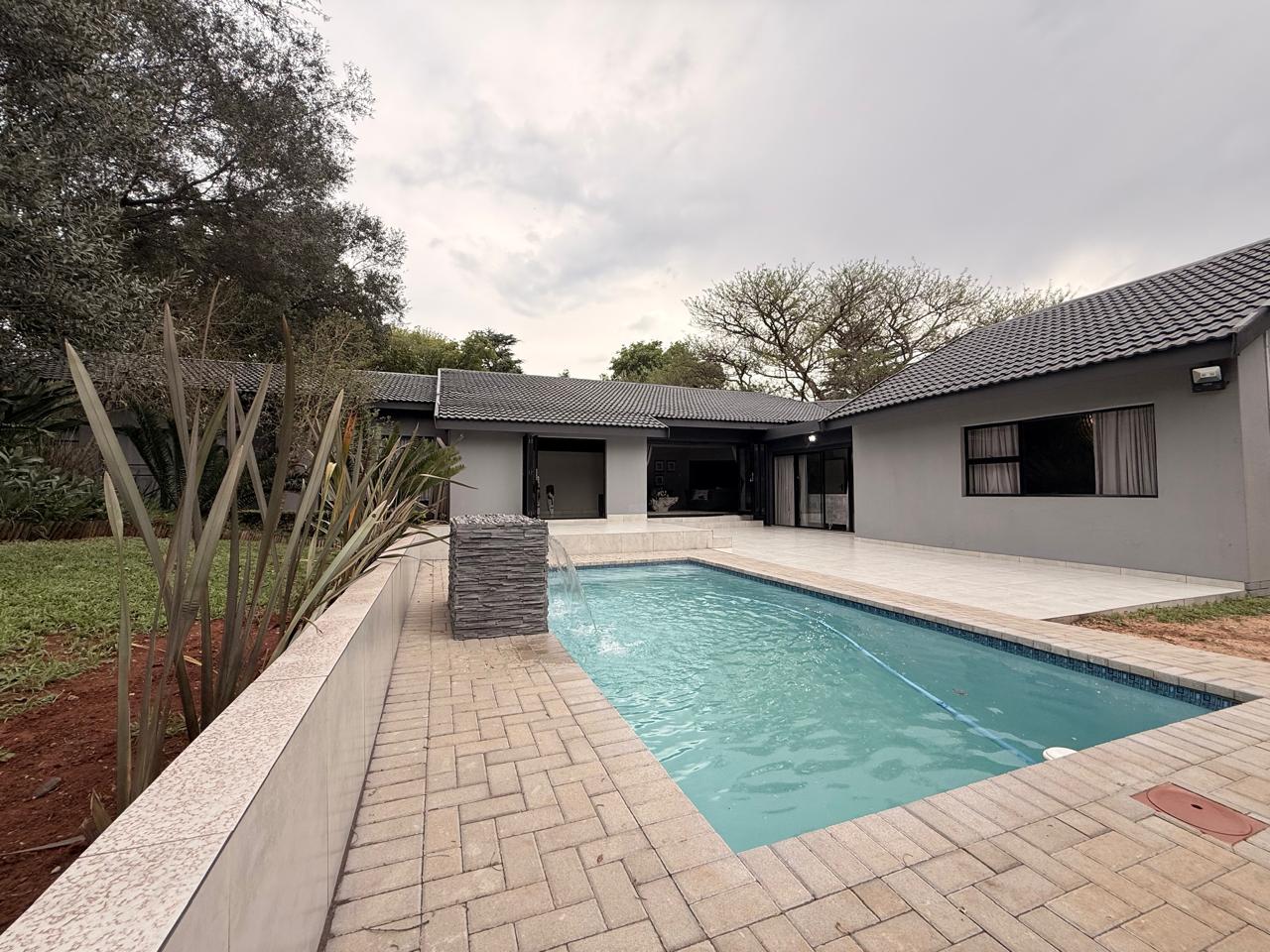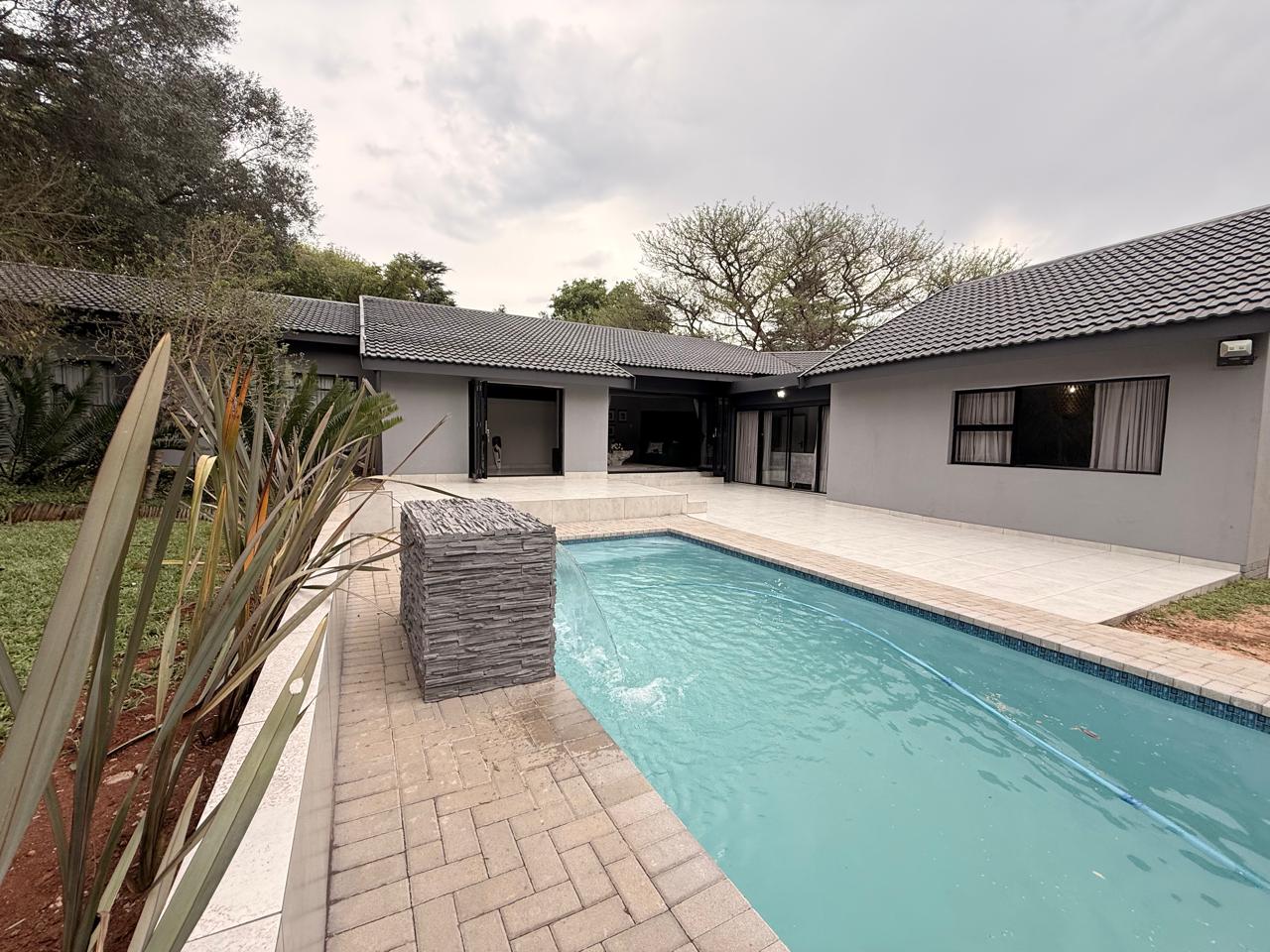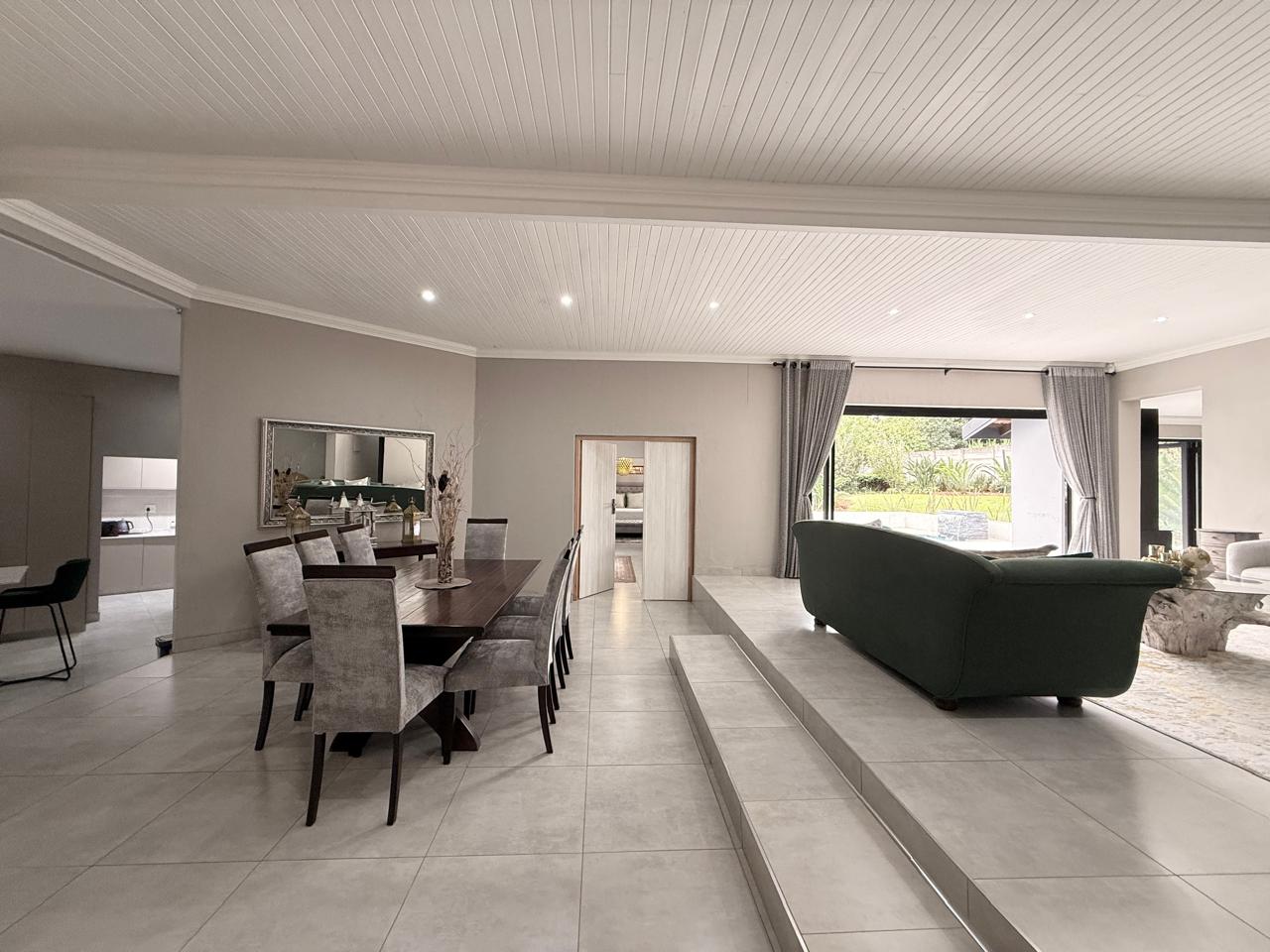 Open-plan Lounge and Dining Area filled with natural light, flowing seamlessly to the brand-new pool with a stunning water feature