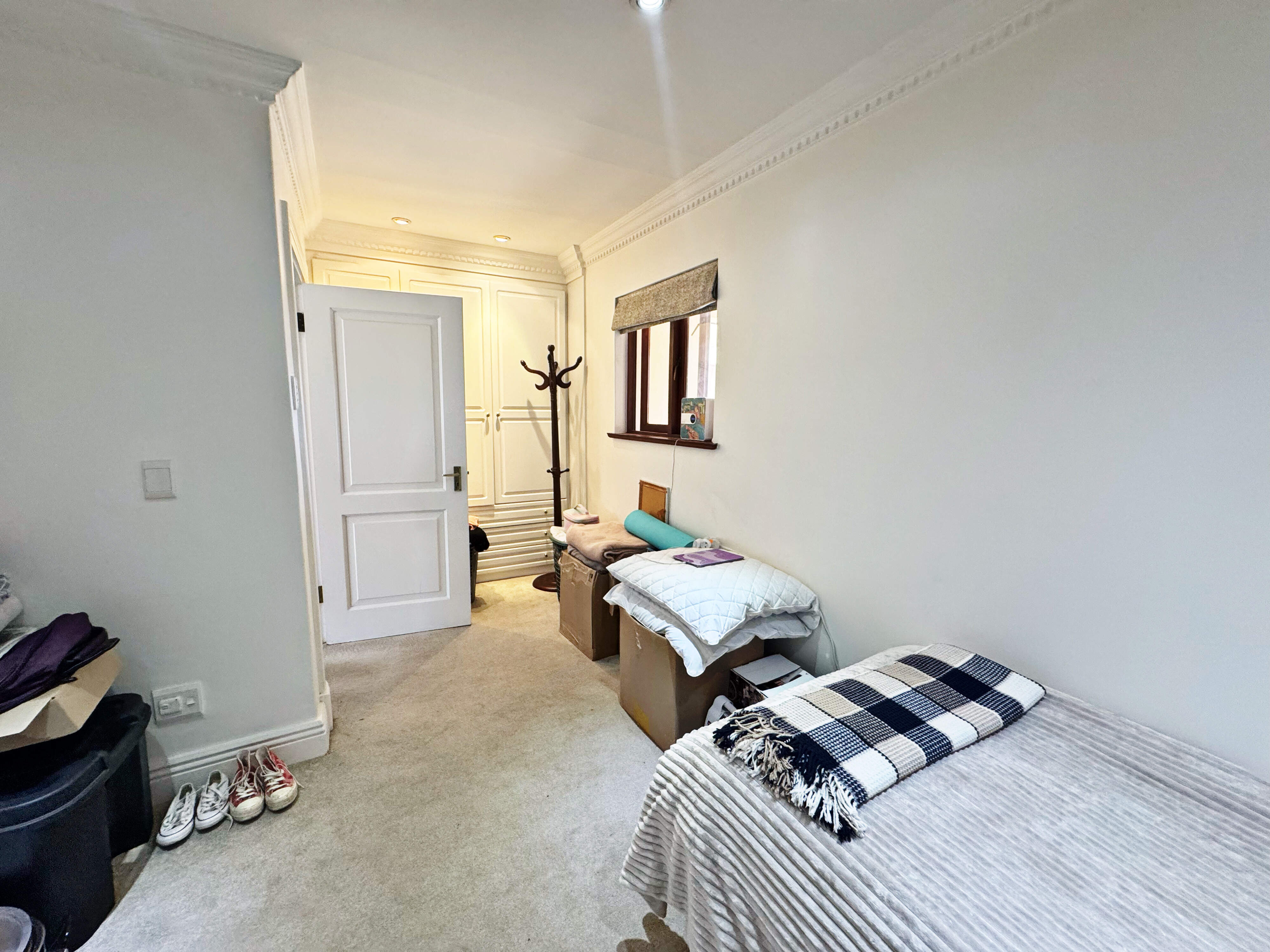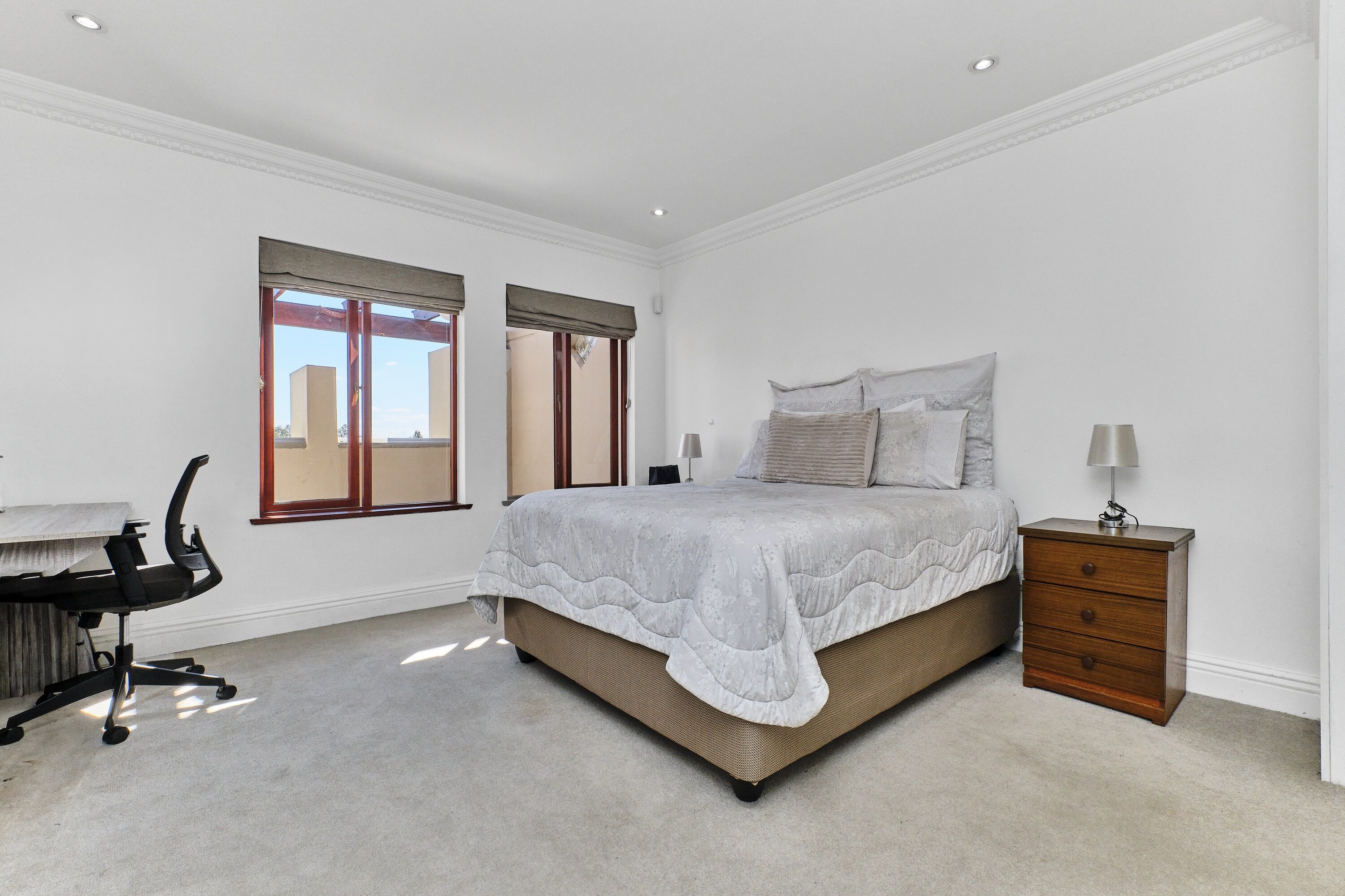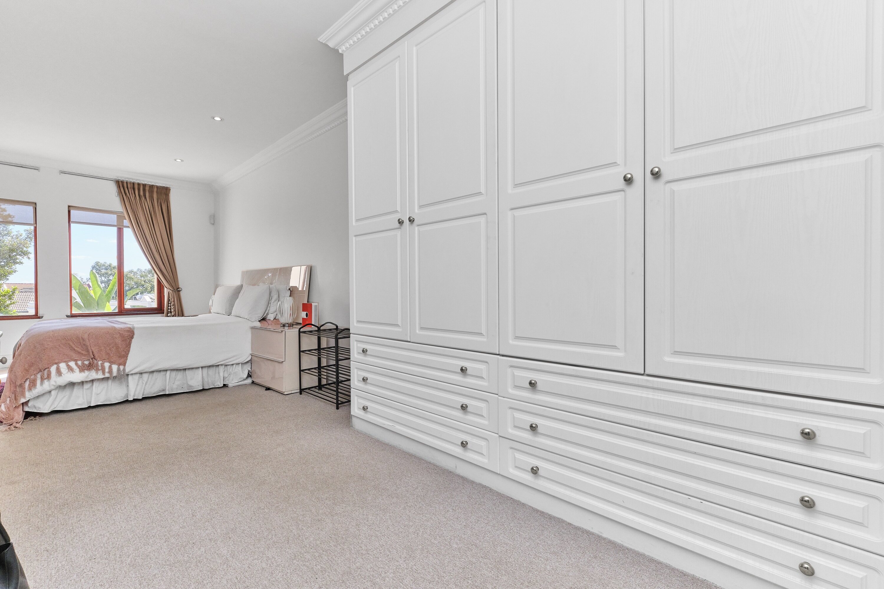 Spacious main bedroom located downstairs, featuring ample built-in cupboards and a door opening onto a covered patio