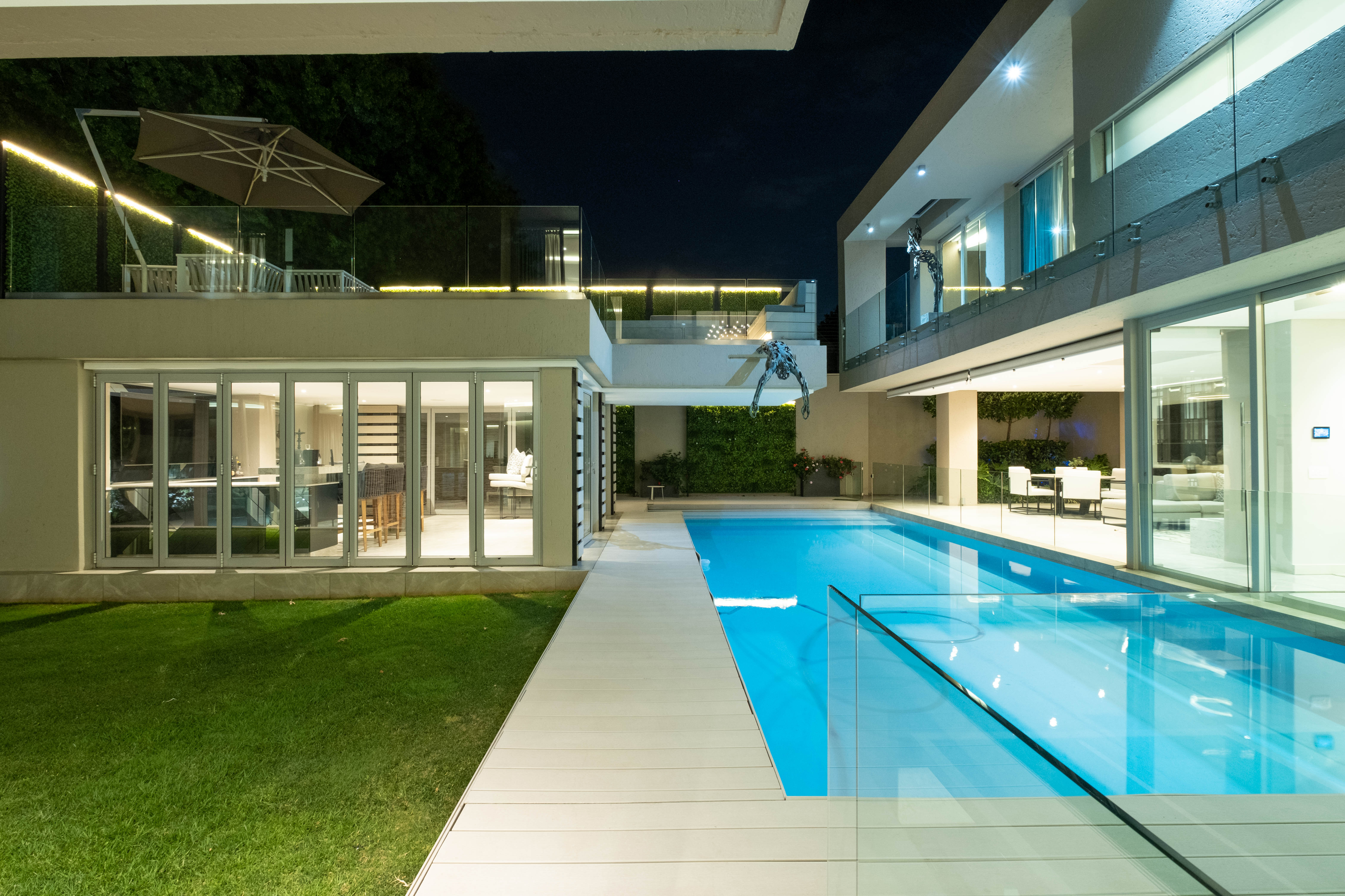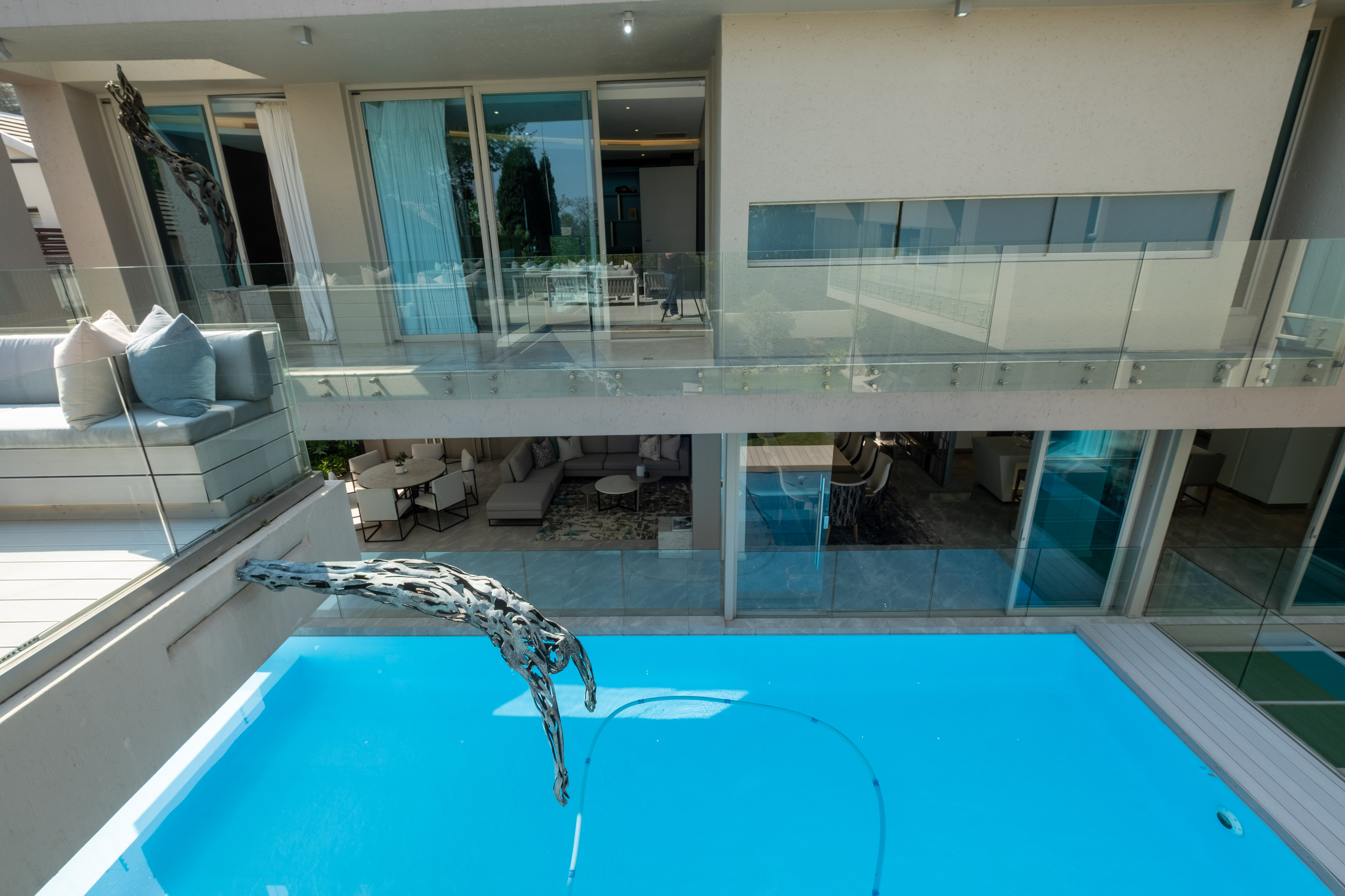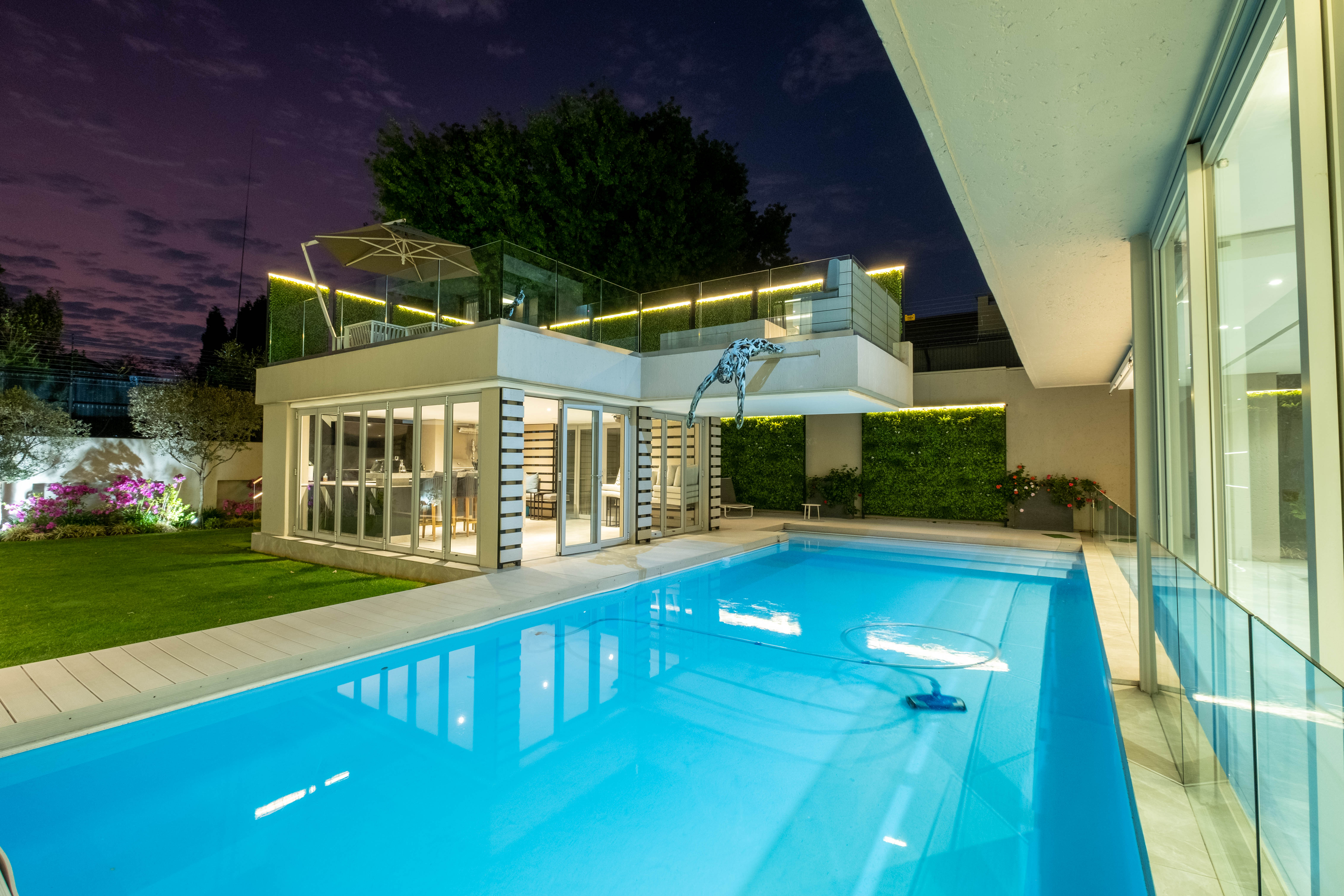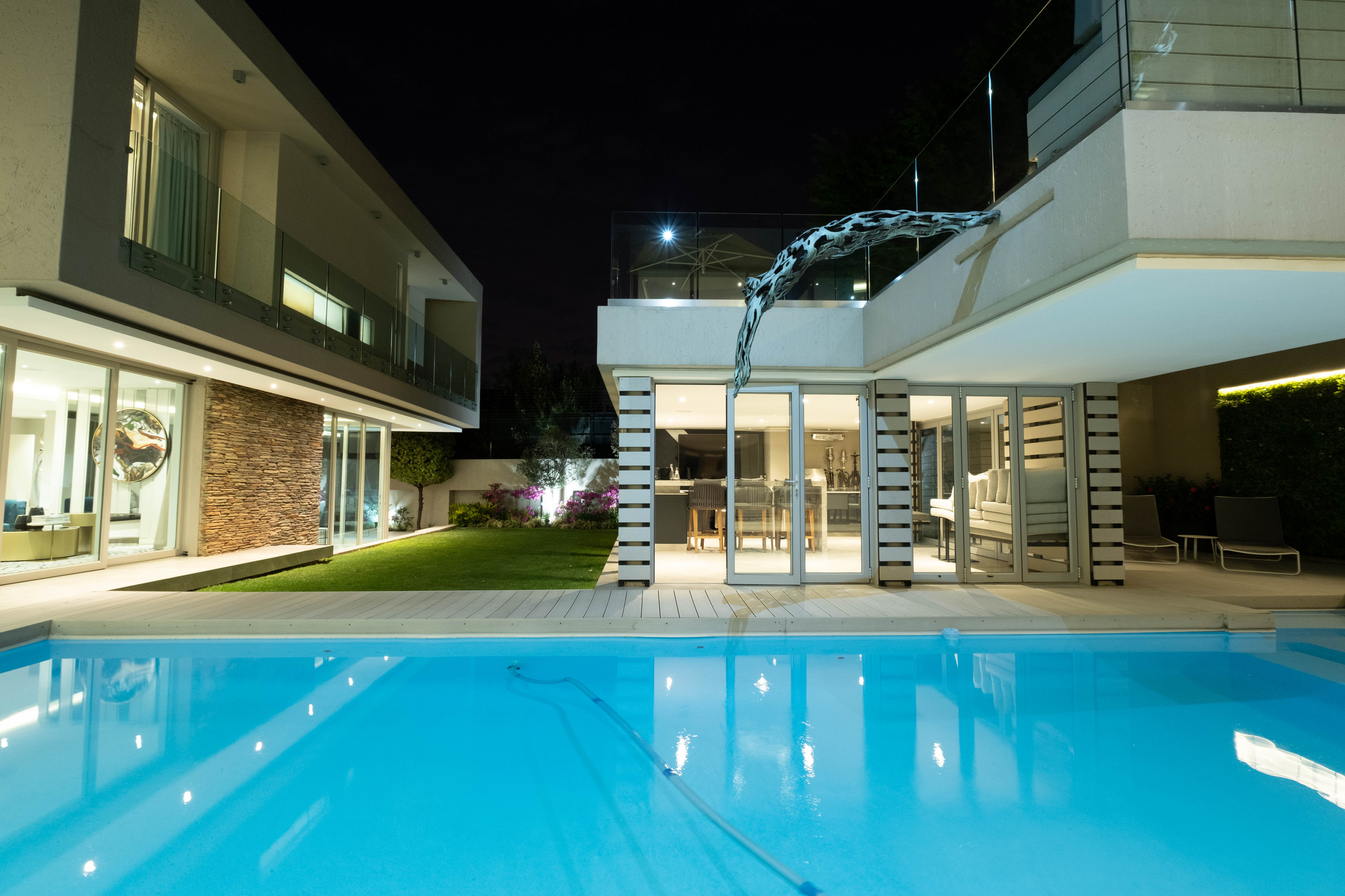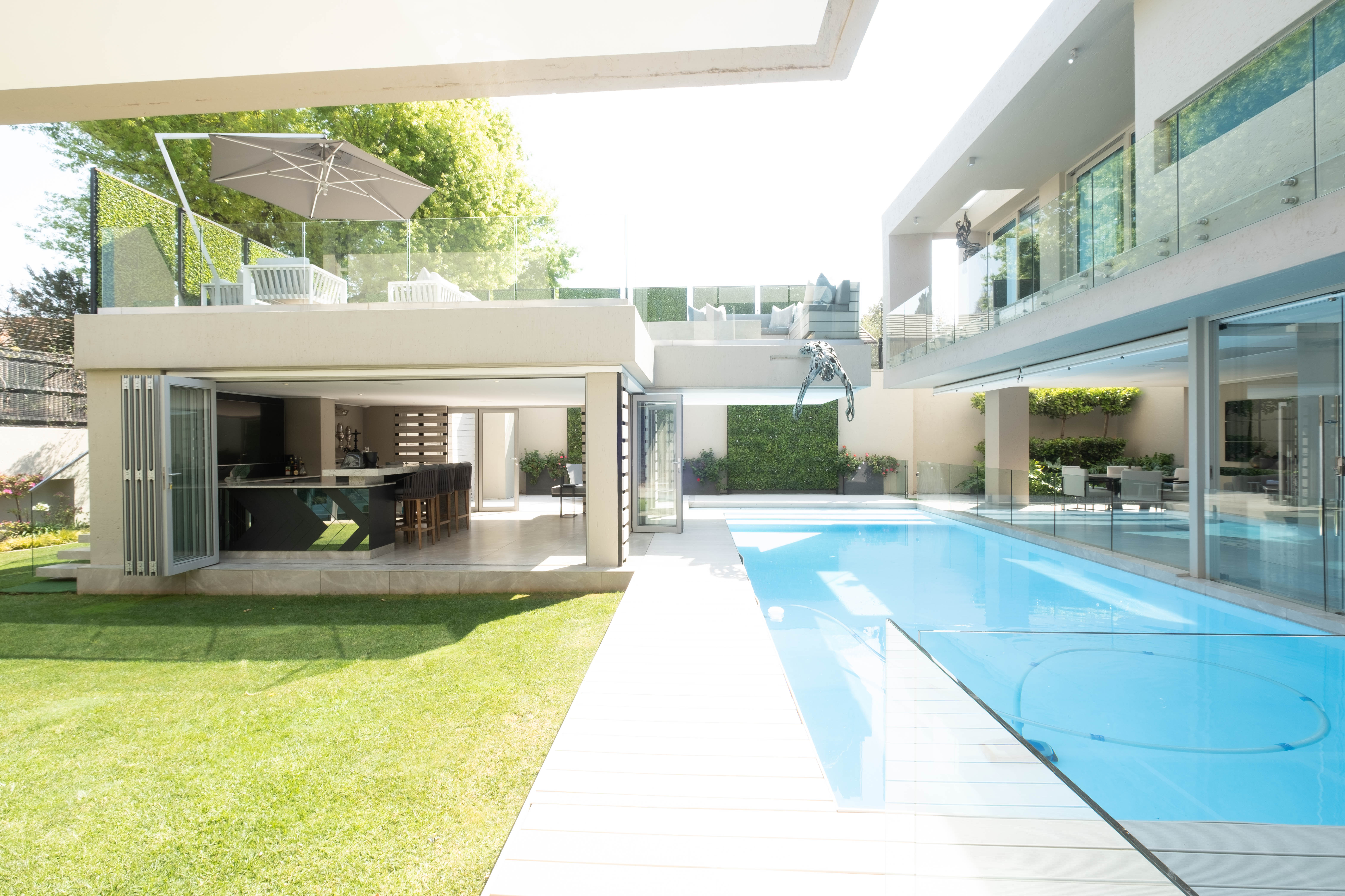The home welcomes you into a lavish open plan entertainment area with many areas to entertain. The home envelops a sparkling pool and manageable well maintained garden with a bar and barbeque area that over looks the whole home. The kitchen has a gas stove and is built to entertain and cook to your hearts content. The laundry is separate and has access for staff. There is a dining area and an outside patio area that gives that indoor outdoor living experience.