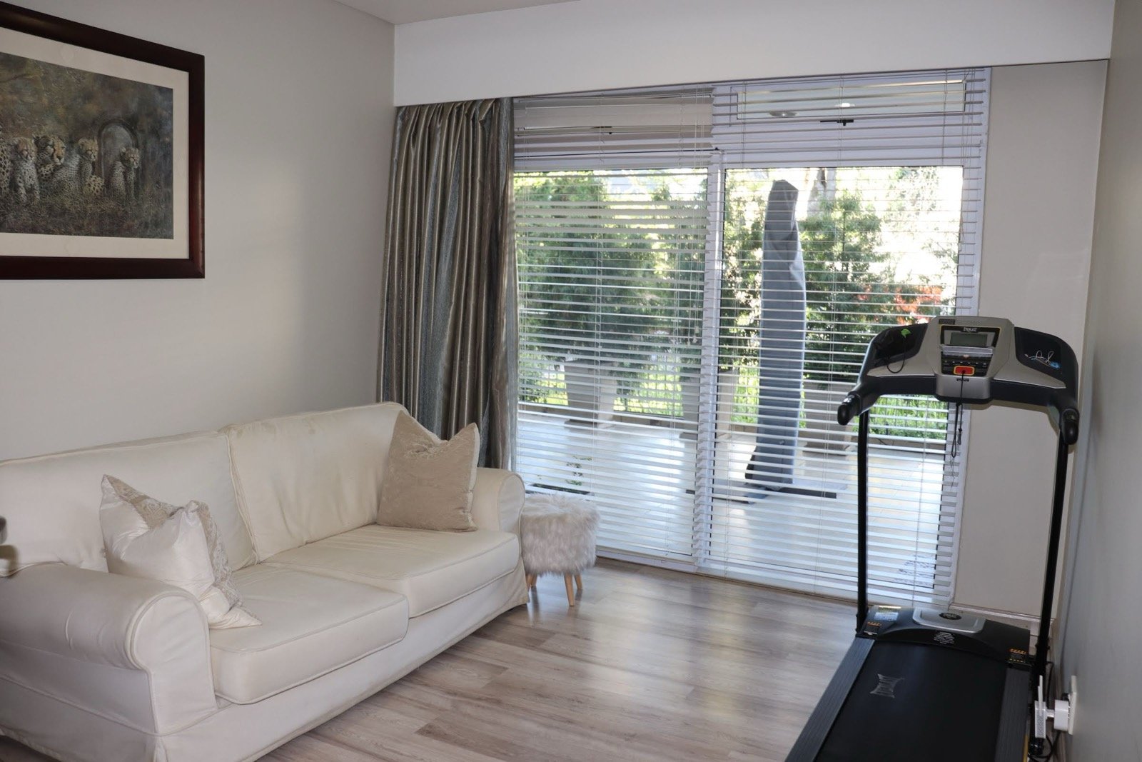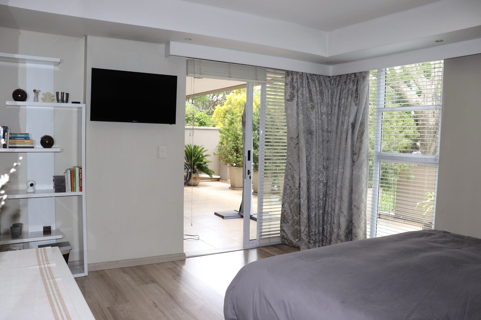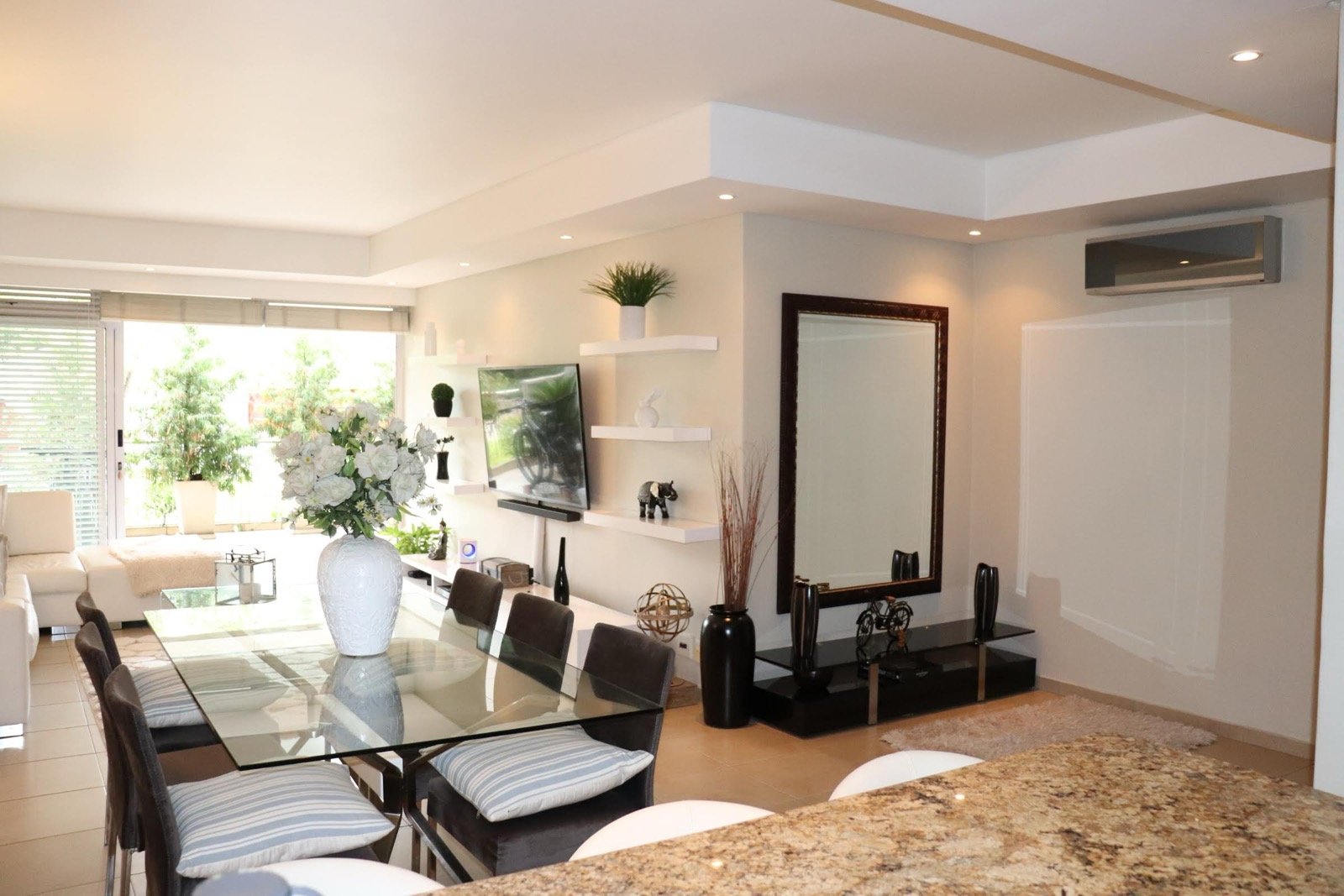 The lounge and 2 of the rooms have direct access to the patio through the glass sliding doors.