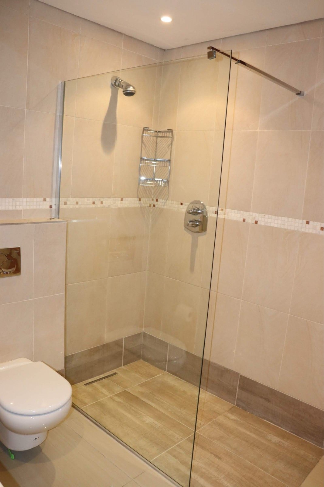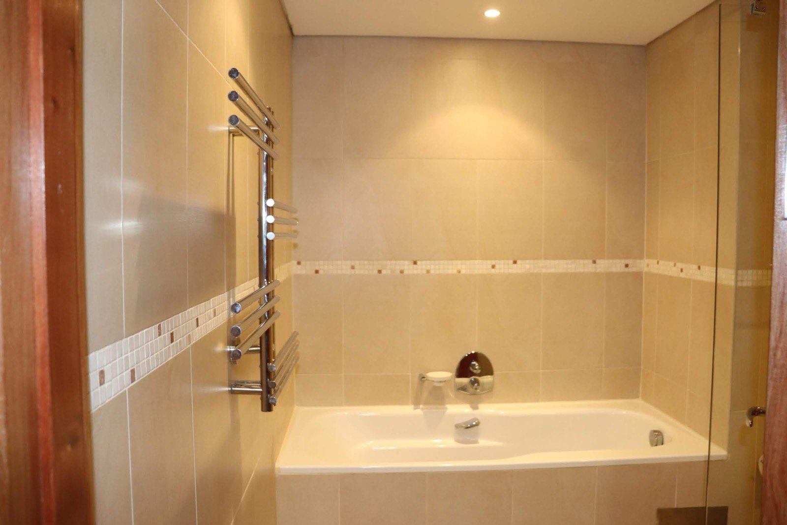 The 2nd bathroom has a bath and overhead shower with heated towel racks, with a laundry area in the corridor.