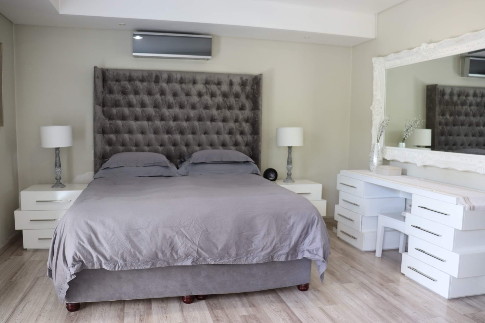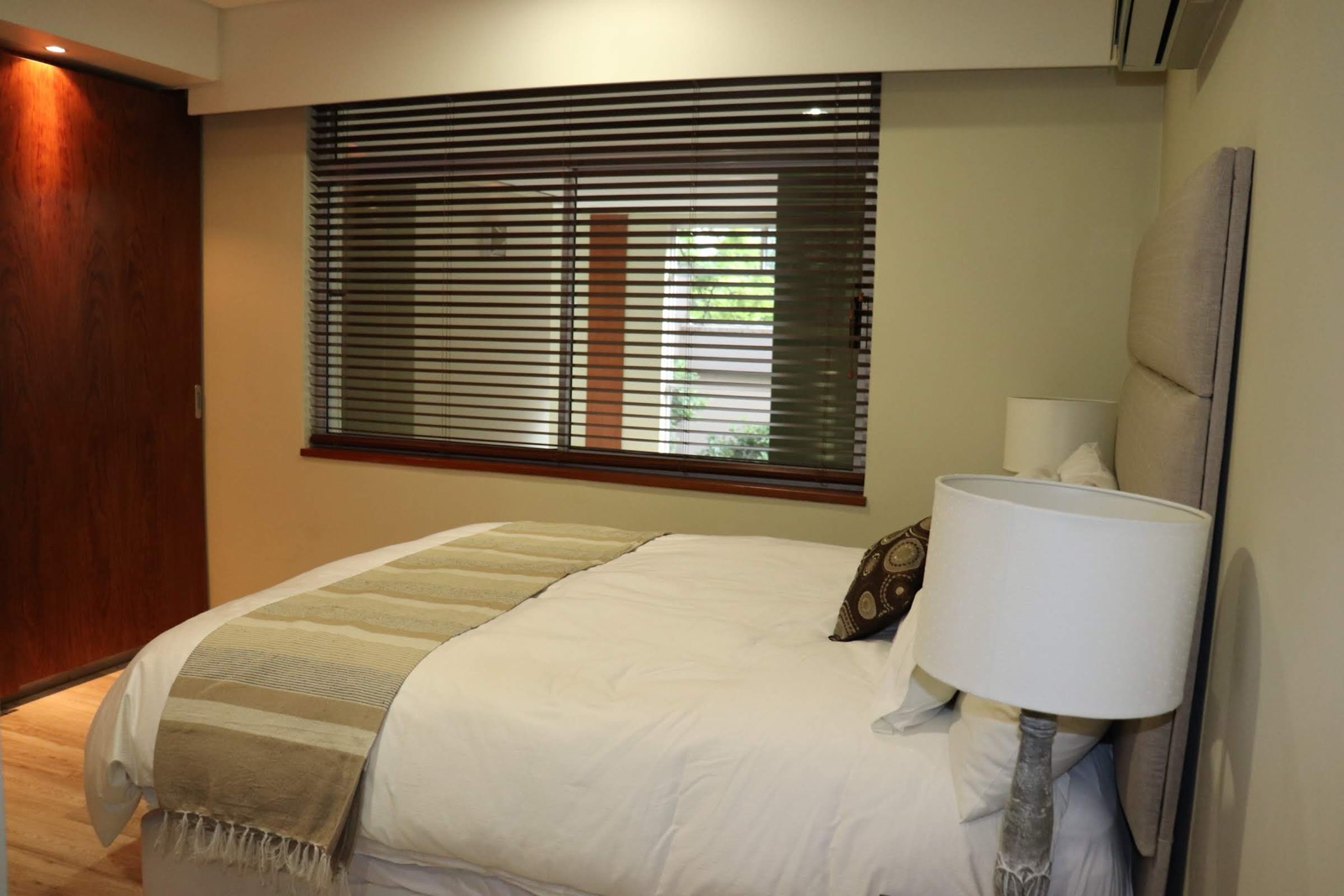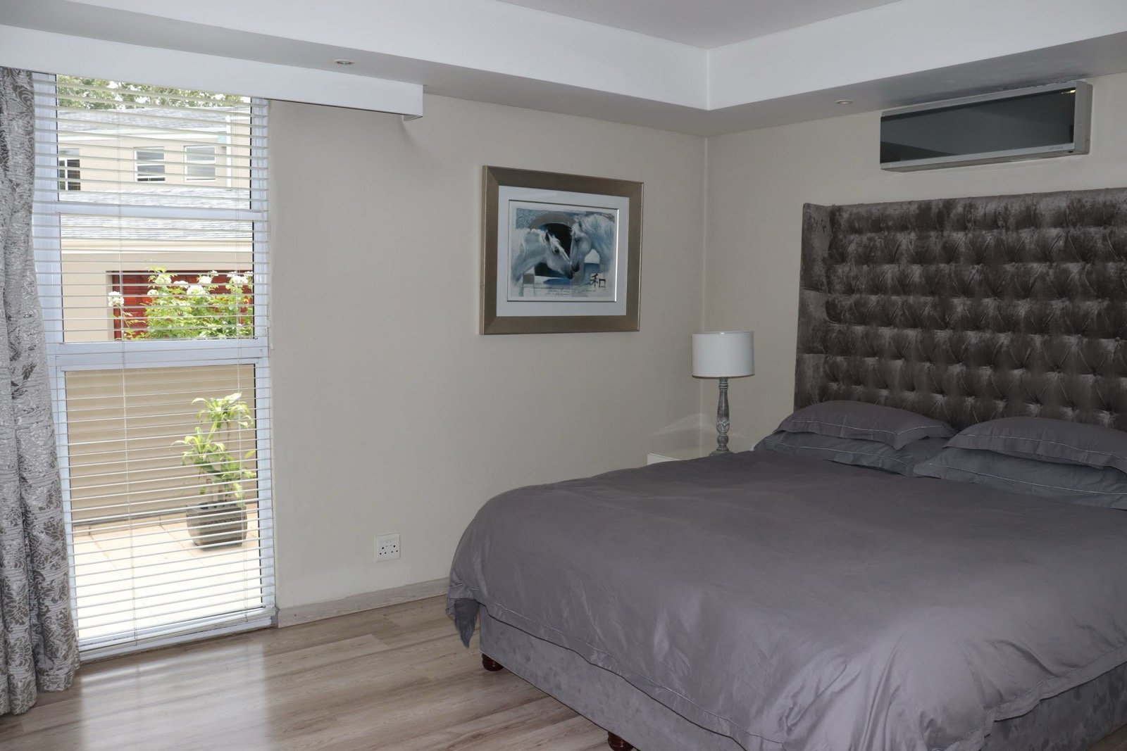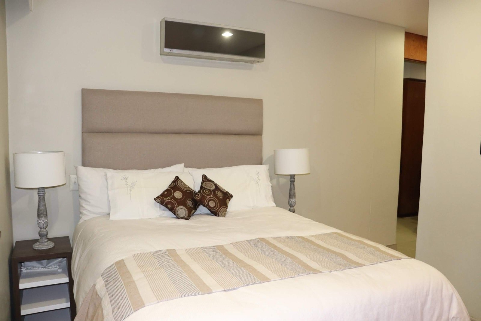 The apartment consists of 3 well-sized rooms , a large patio with built-in braai, air-conditioning, underfloor heating, and backup power.