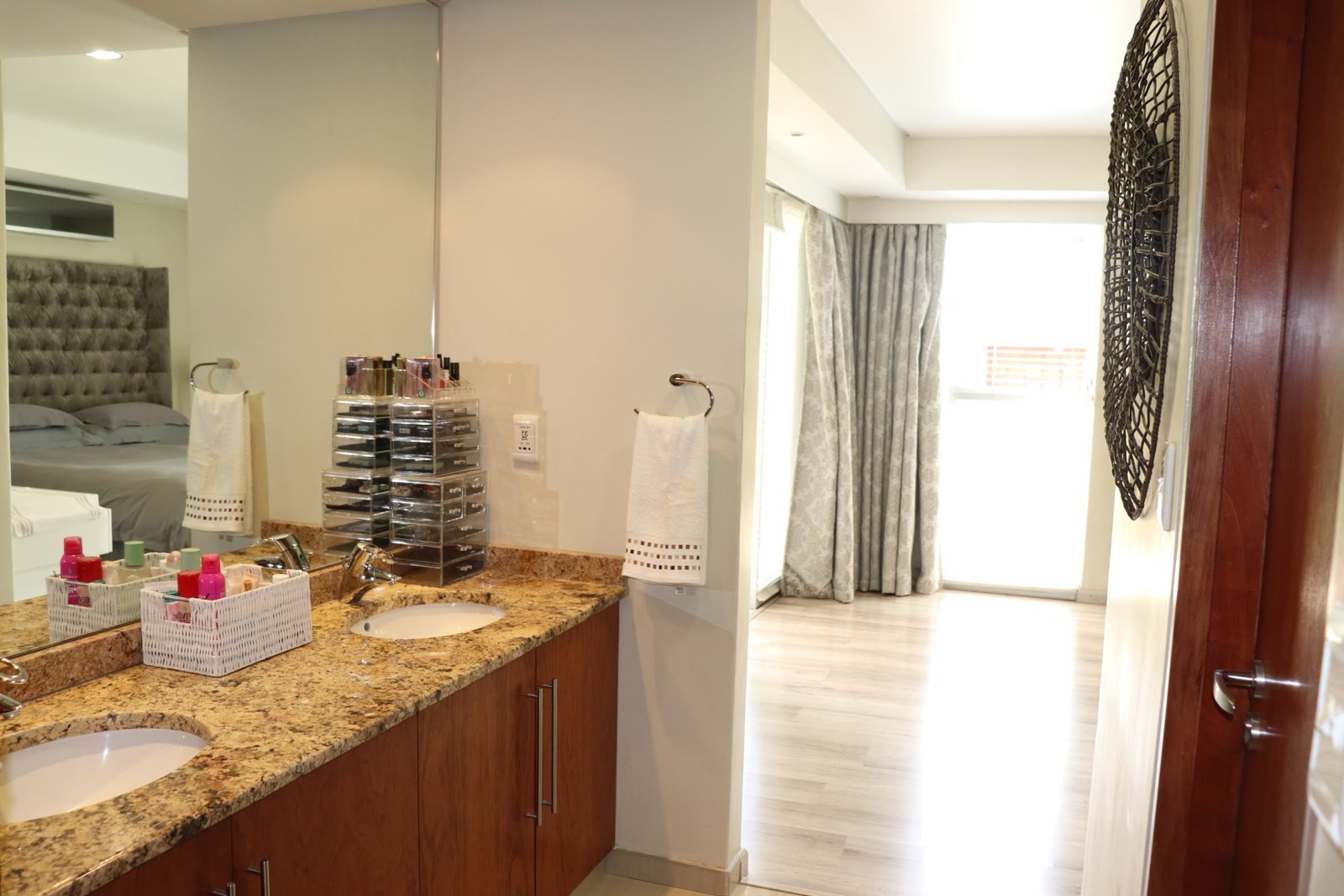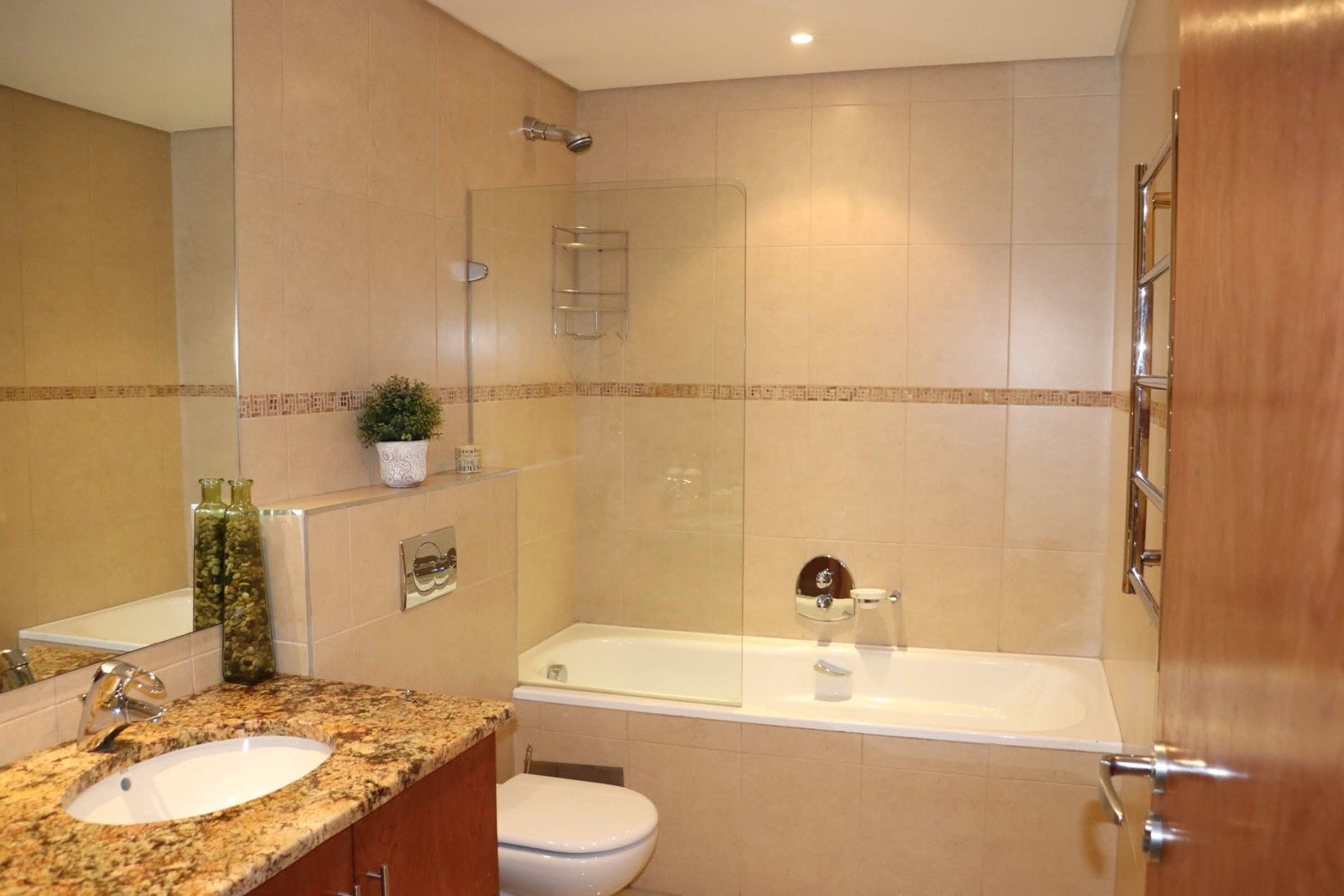 Your master bedroom is en-suite with a walk-in-closet, full bathroom and double vanity. The bedrooms can also be closed off from the rest of the apartment, and there's a separate guest loo.