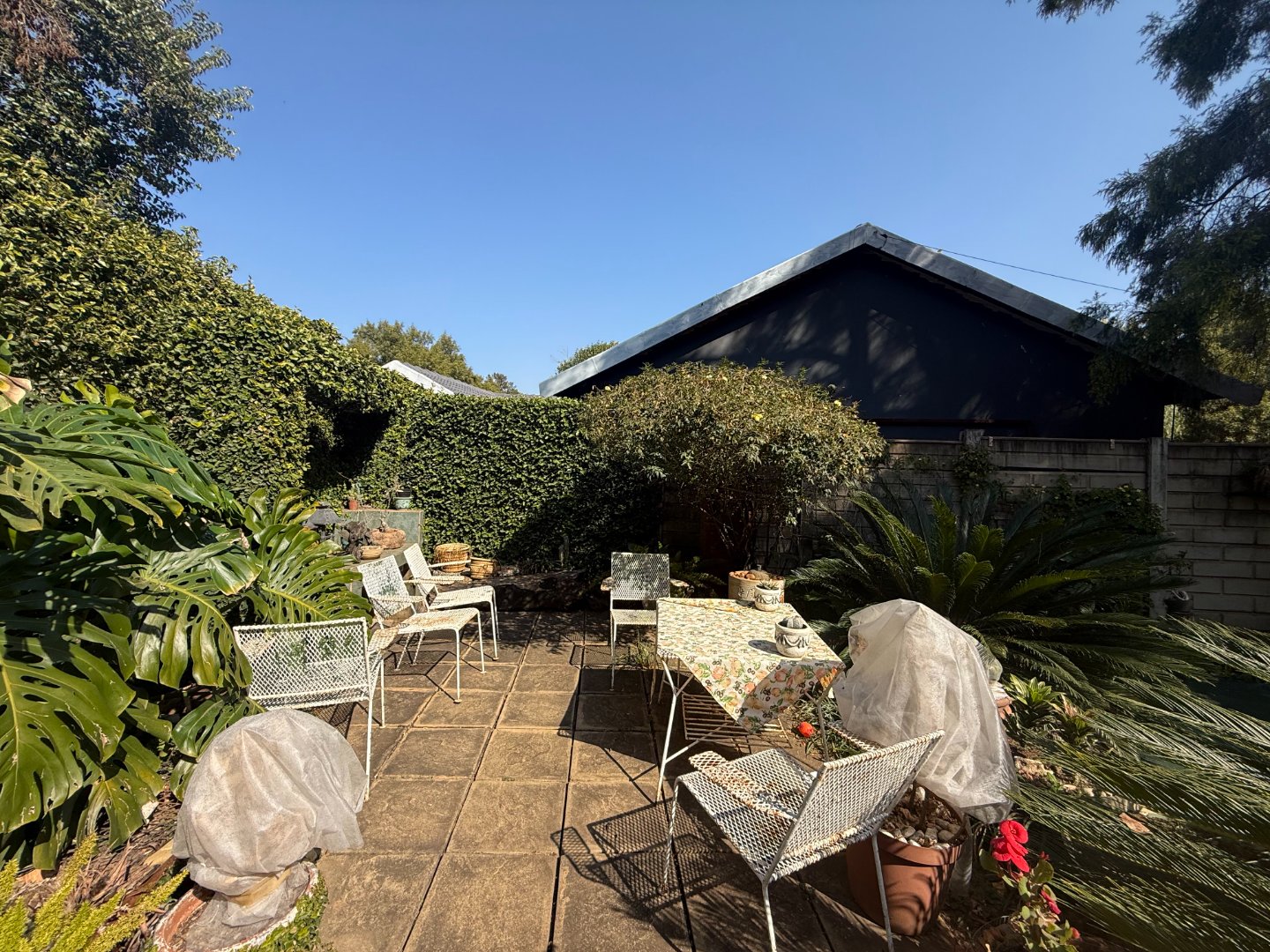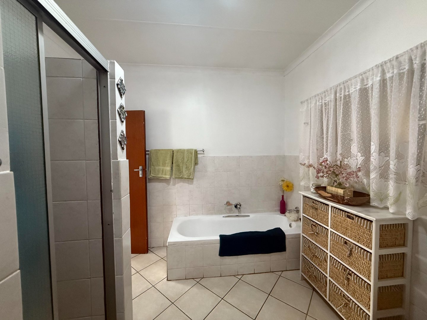There are three comfortable bedrooms, all with pleasant garden views. The main bedroom offers an en-suite bathroom and generous built-in cupboards, while additional storage space is available throughout the home.