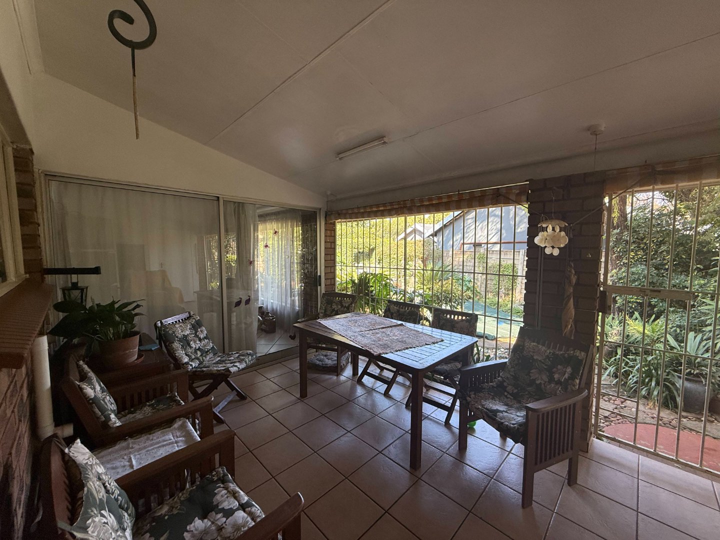 Sliding doors lead to a covered patio with a built-in braai, overlooking the swimming pool and garden — an ideal setting for entertaining or relaxing with family and friends.
