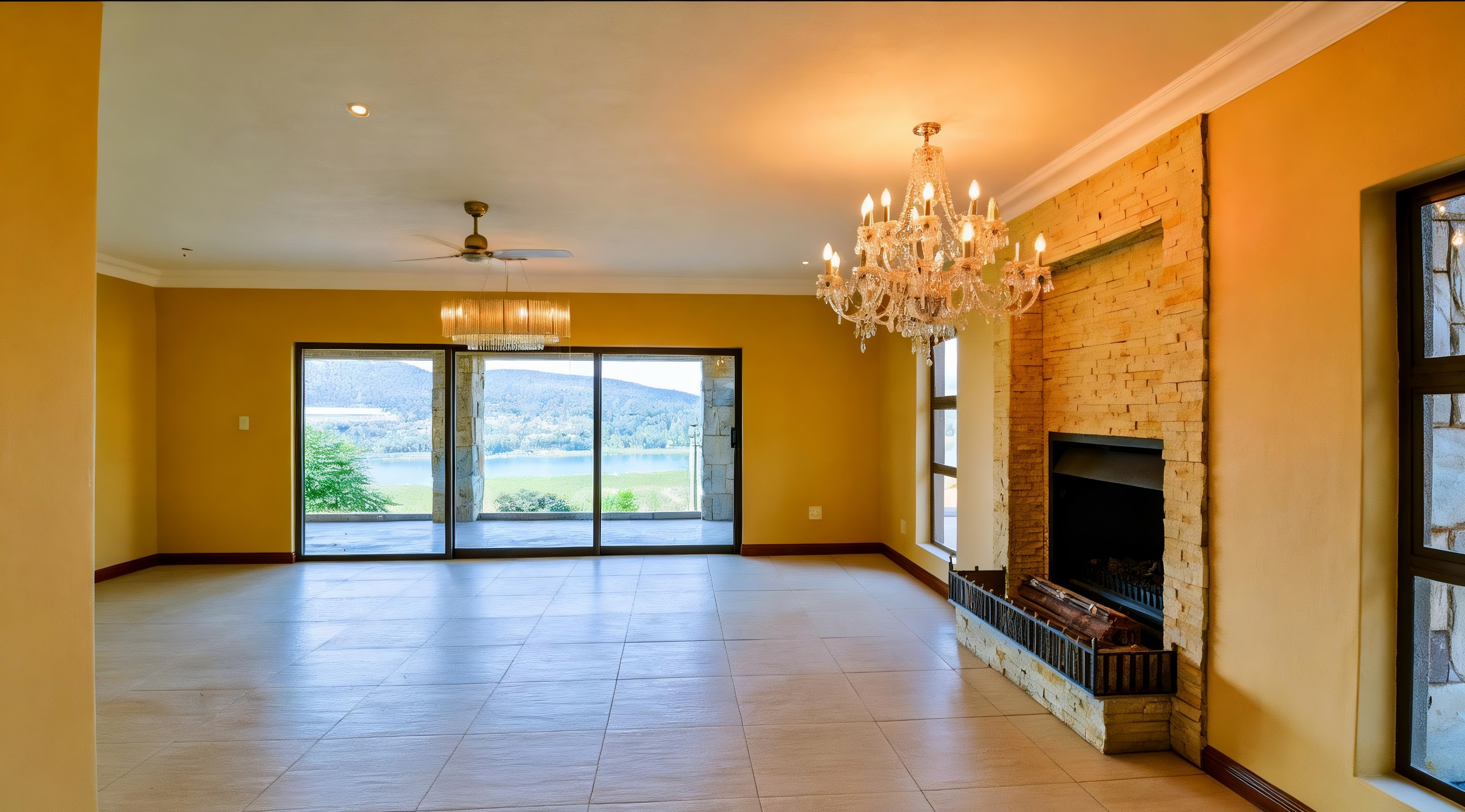 Sliding doors opening onto a large covered veranda with spectacular dam views