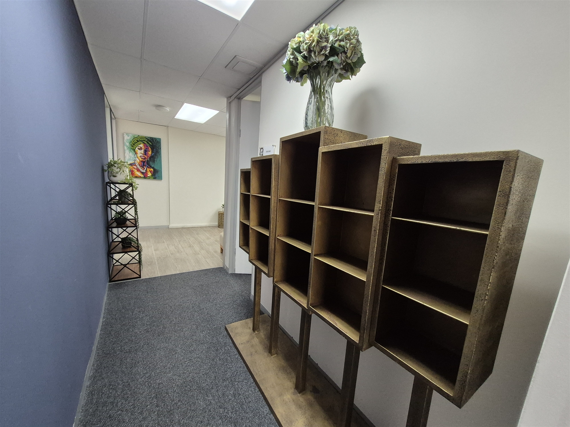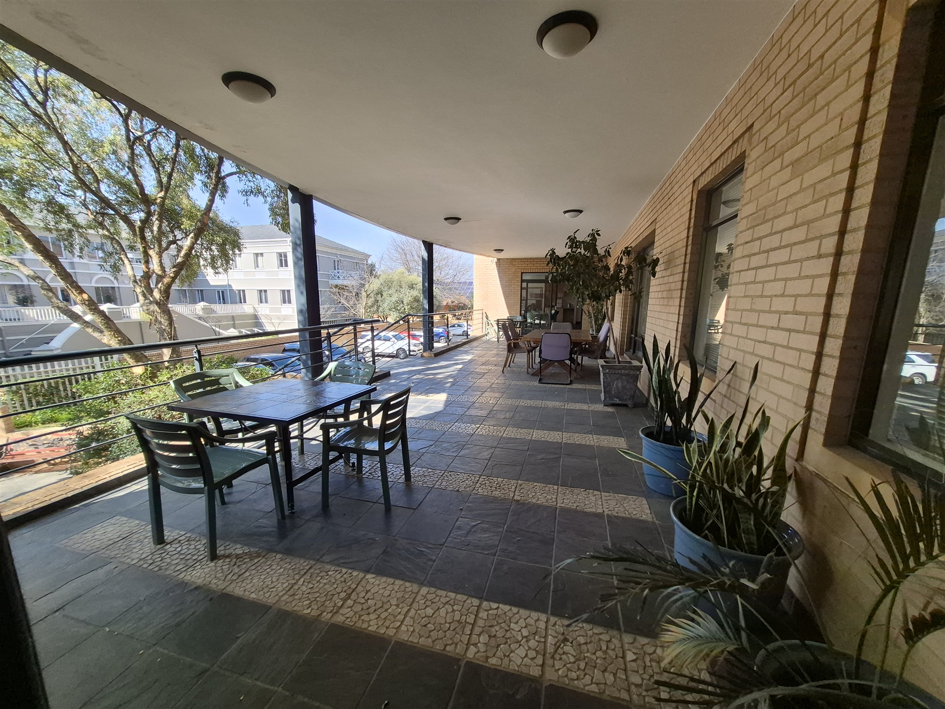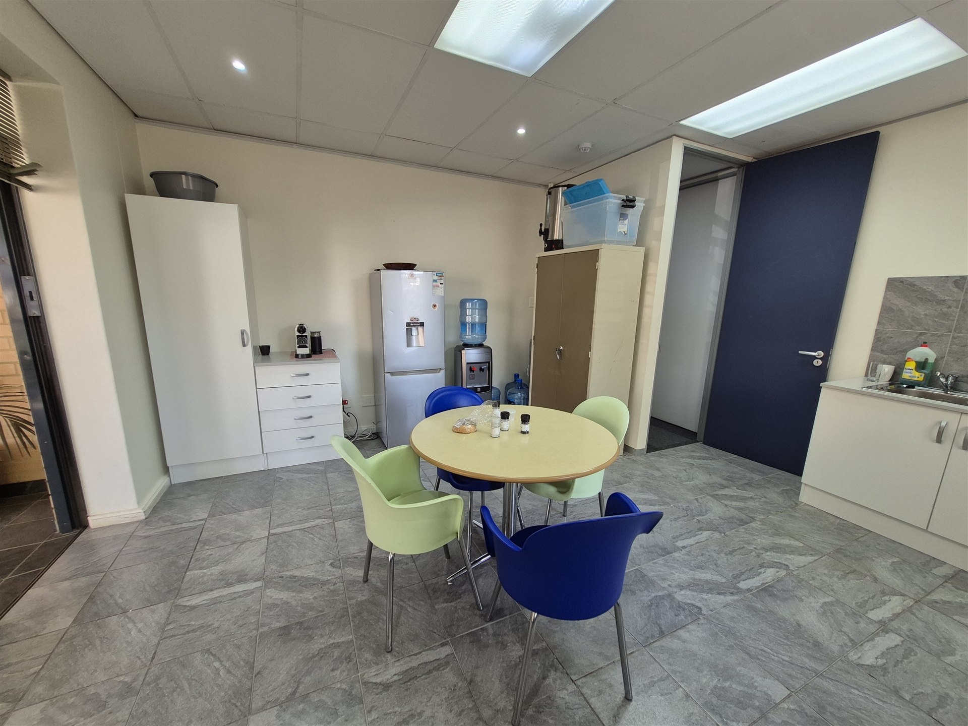 The suite features a combination of boardrooms, cellular offices, and open-plan workspace, as well as a stylish kitchen with a seating area that opens onto a spacious patio. The patio leads to a tranquil garden setting complete with seating and a braai area — perfect for staff breaks or informal meetings.