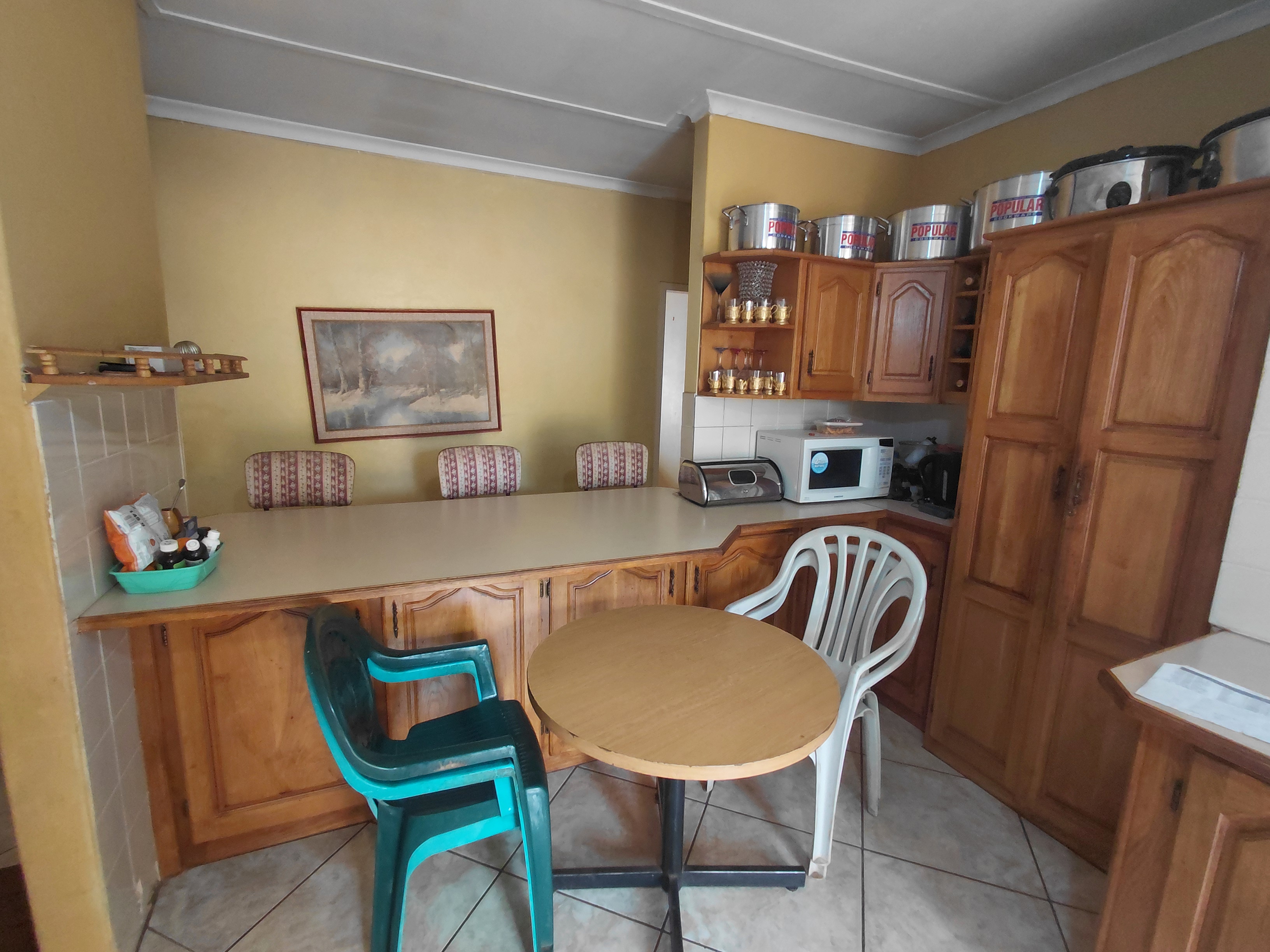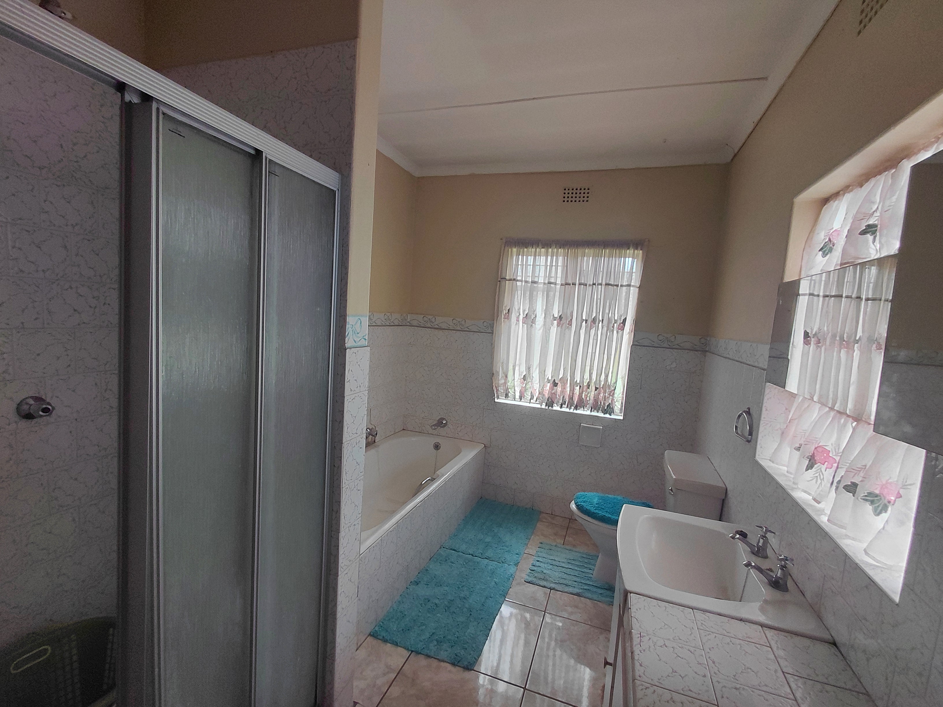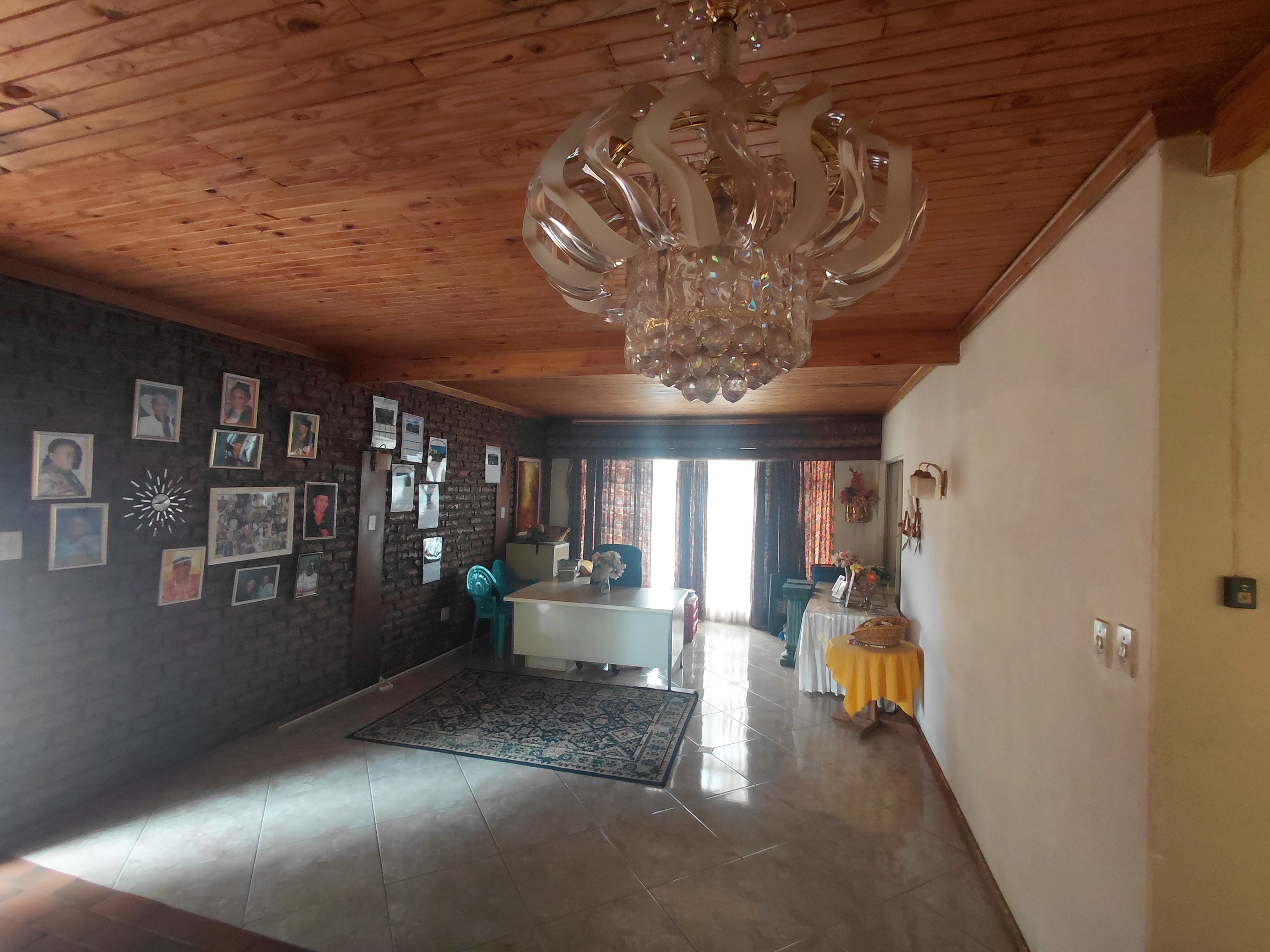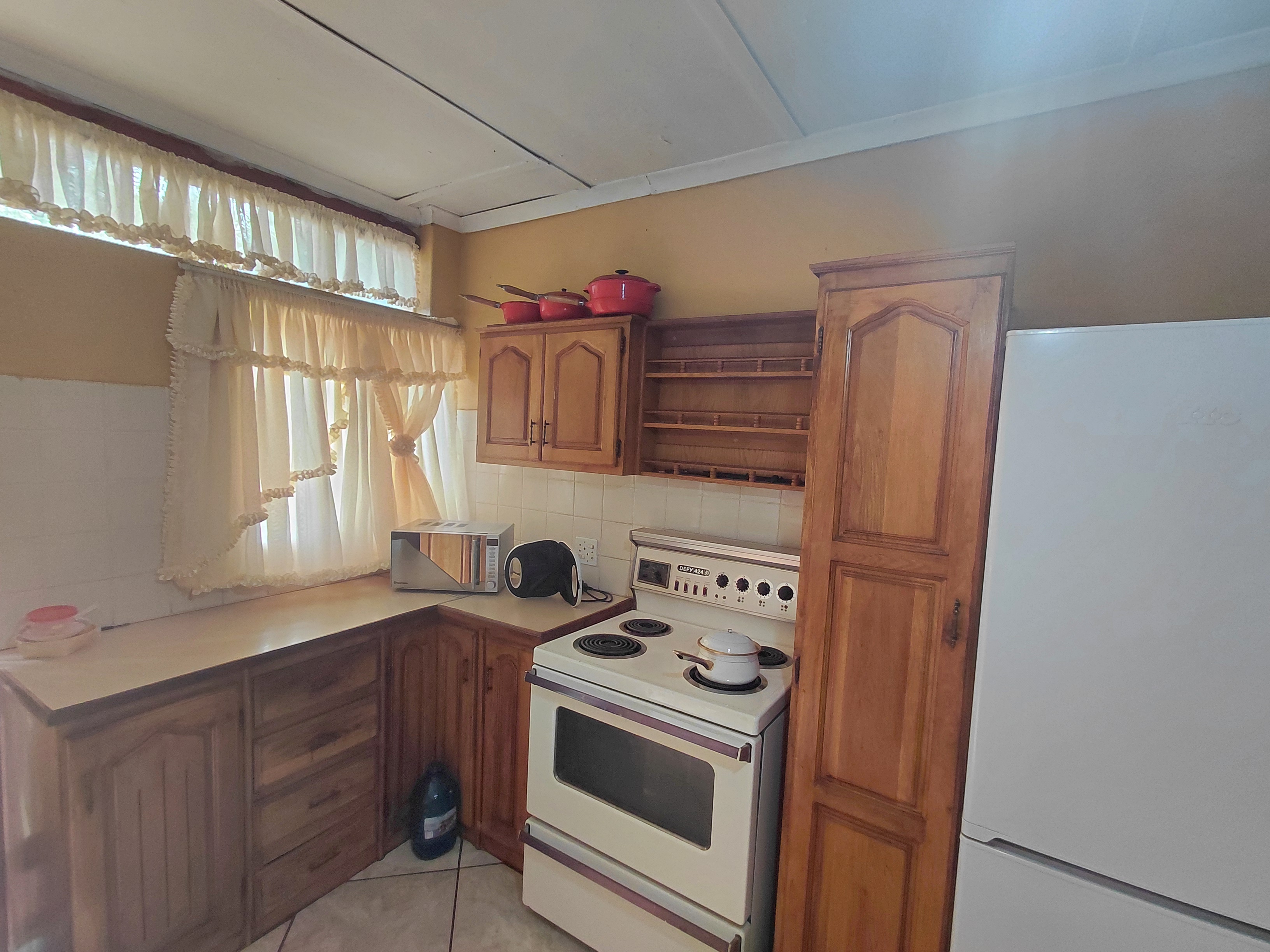 The fitted kitchen is practical and well laid out, complemented by three well-sized bedrooms, two bathrooms, and a separate guest toilet. The home is finished with a combination of tiled and carpeted floors, plastered walls, and charming knotty pine ceilings, giving it a warm, classic character.