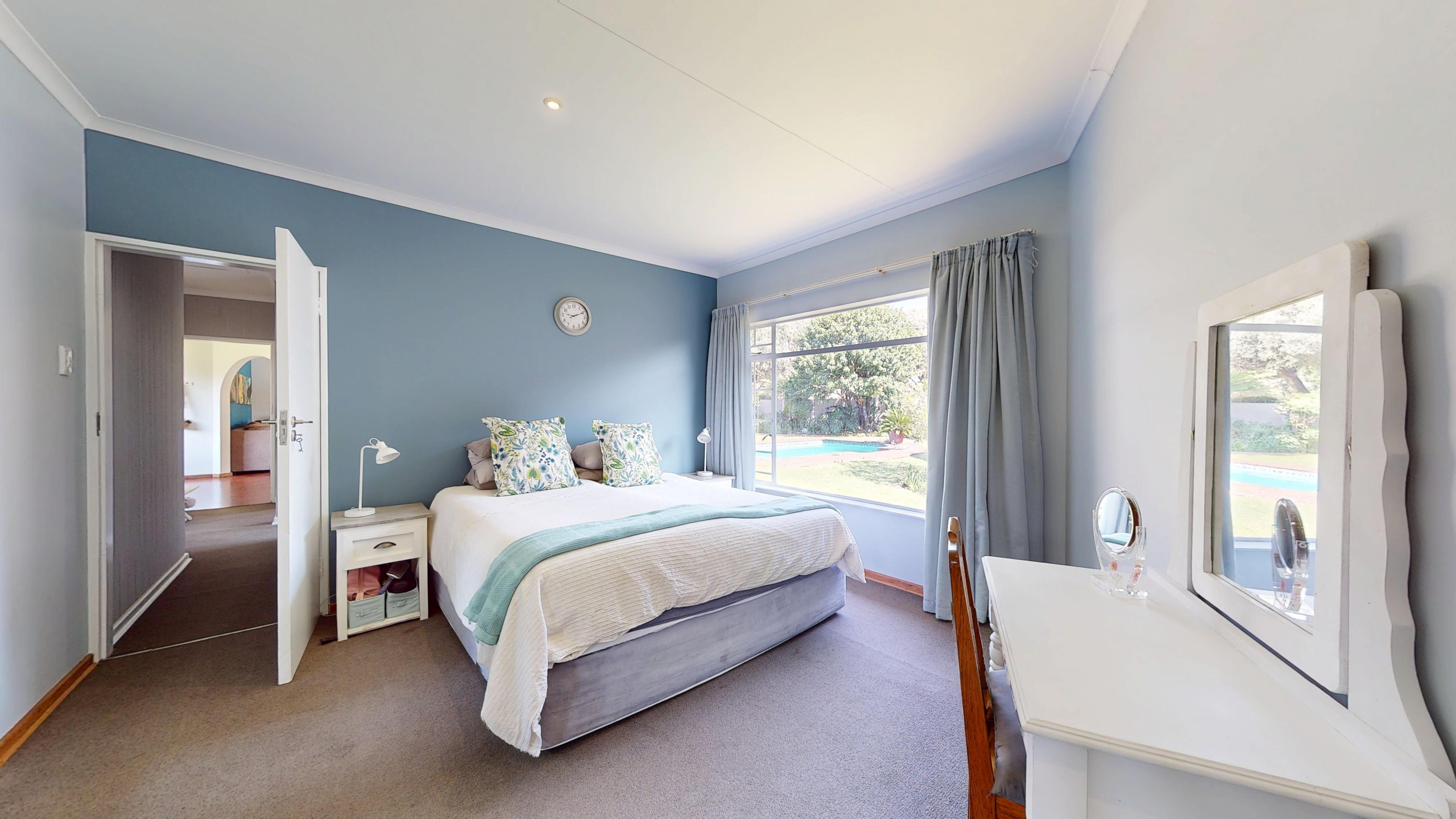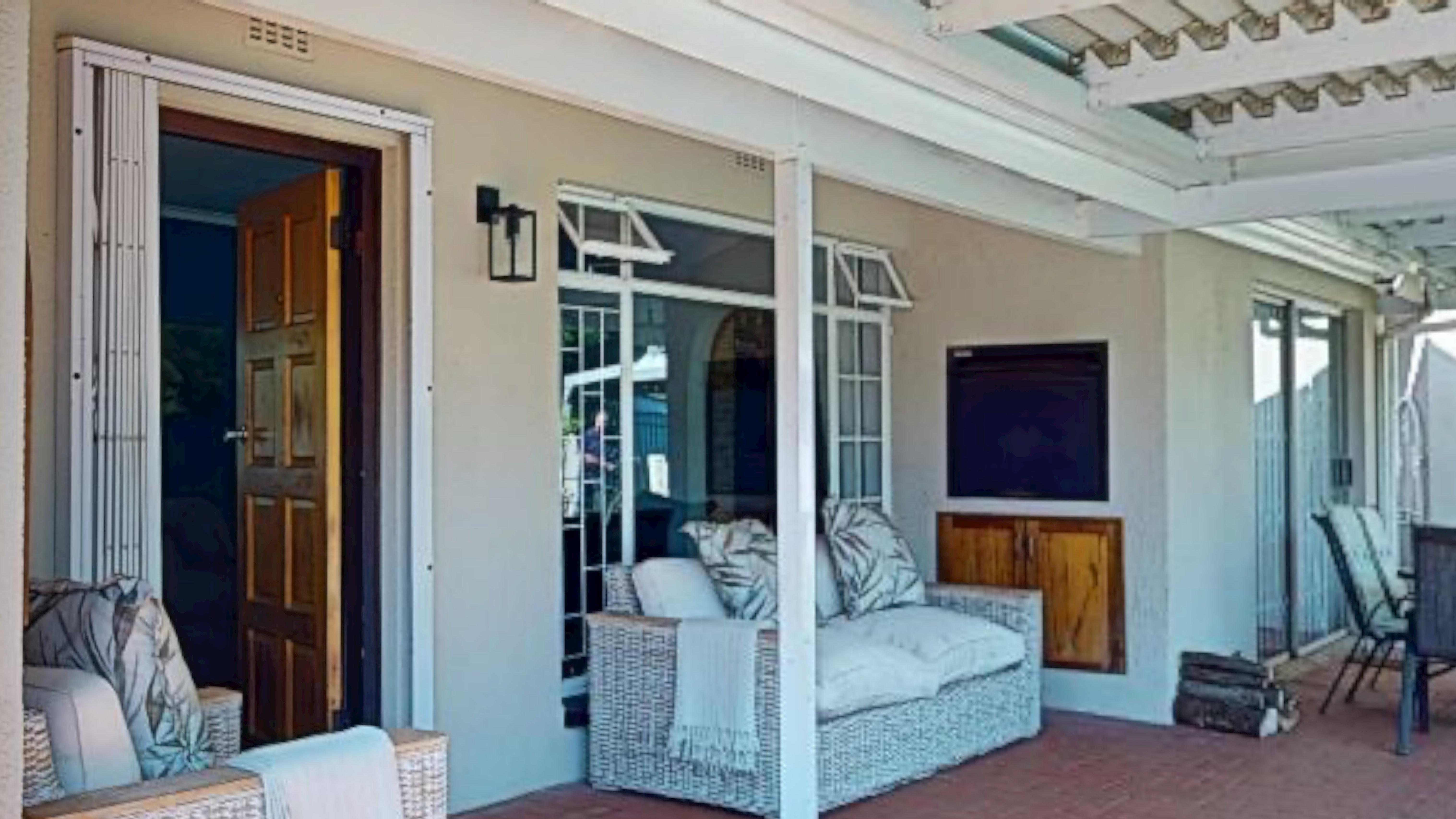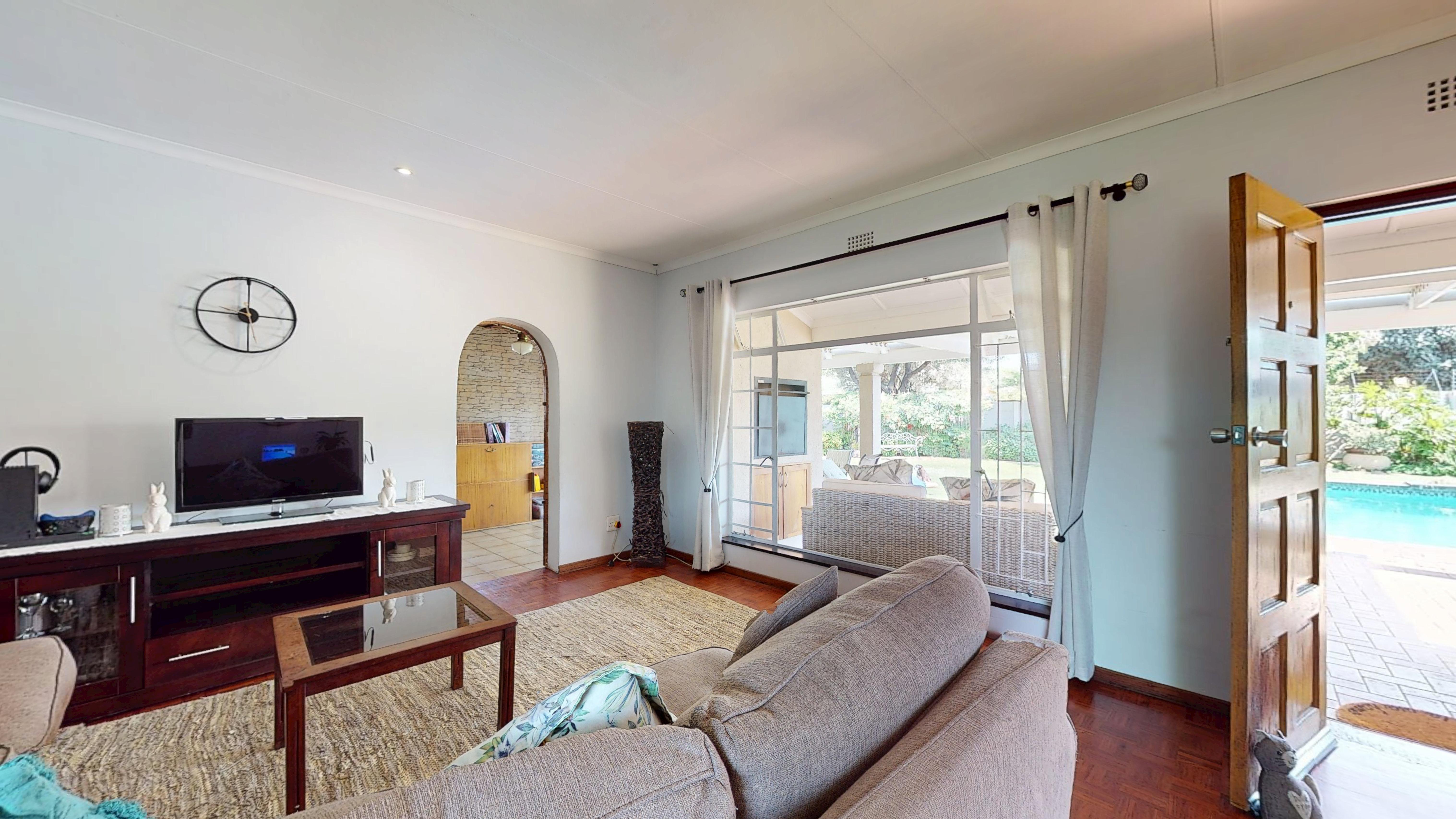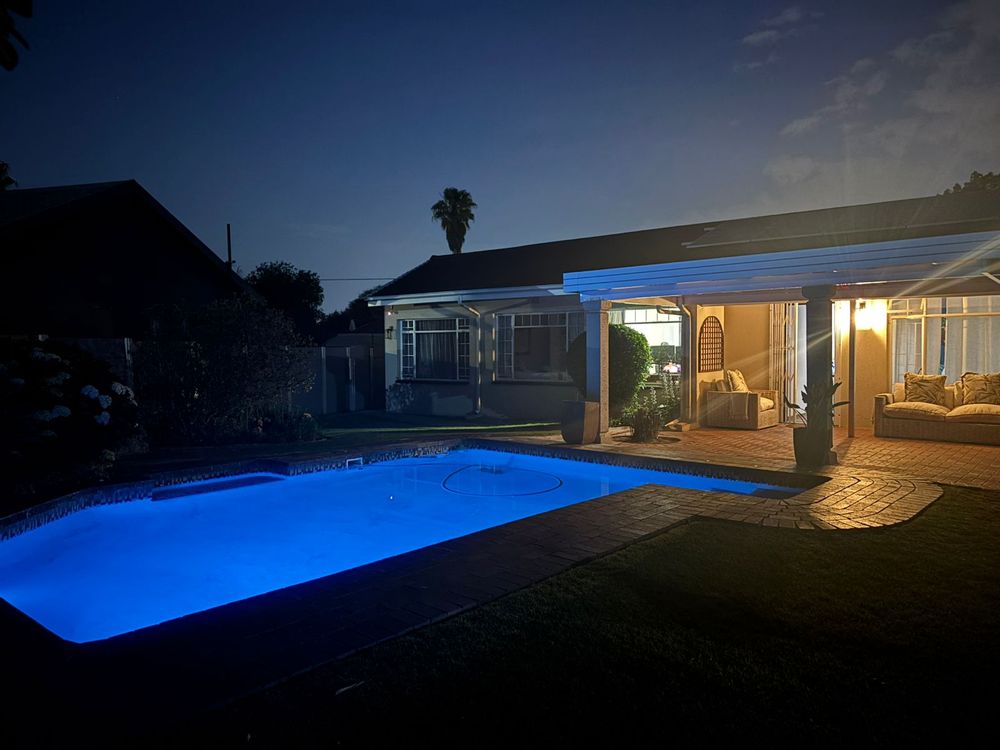 Step outside to a covered patio with a louvered sunroof and a built-in braai, overlooking a sparkling, well-maintained swimming pool and a beautifully landscaped garden—perfect for summer days and family fun.