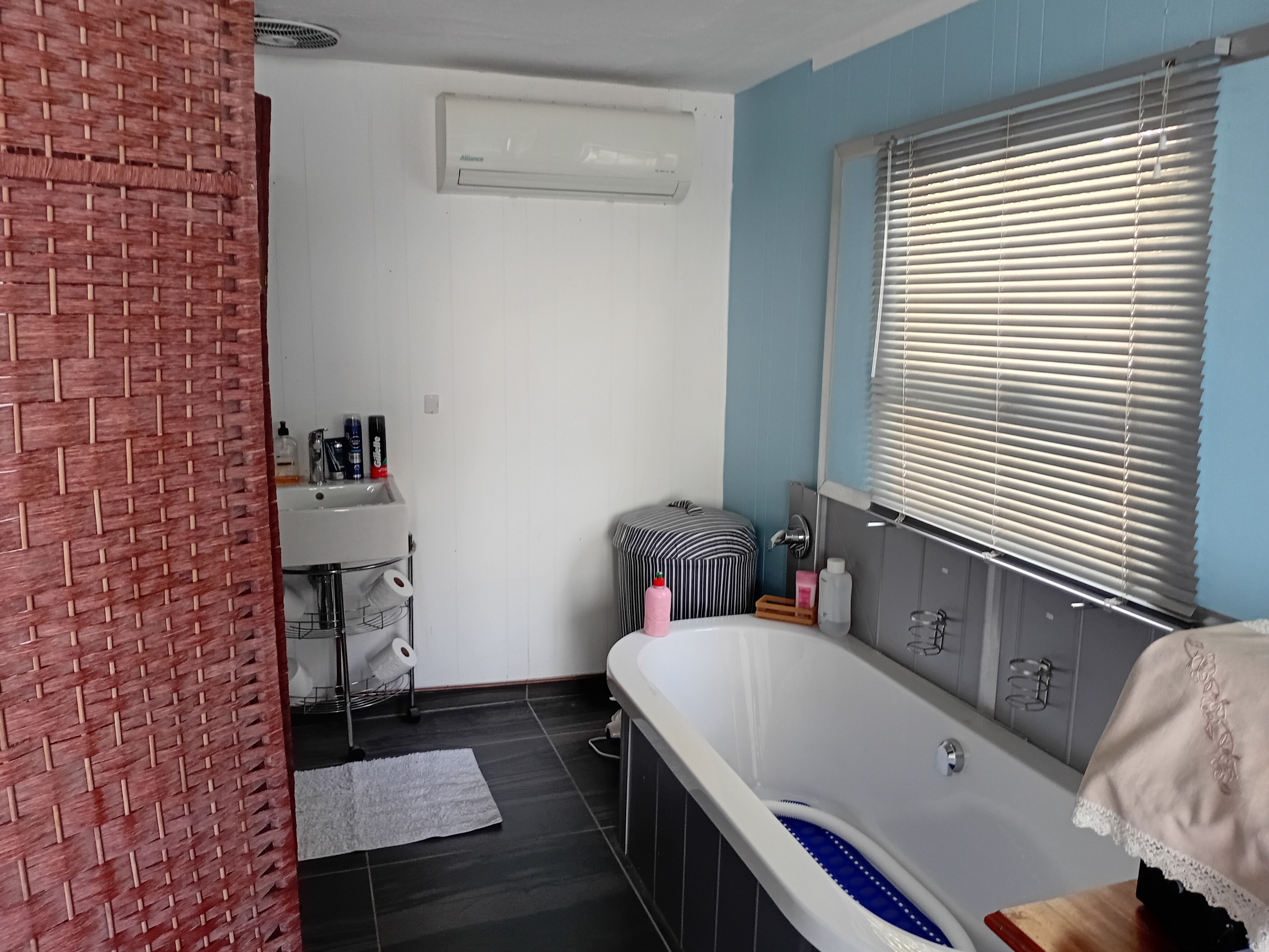 The unit boasts 2 bedrooms, a study (workroom), open plan kitchen/dining room/lounge area creating a room with space and character. There are two bathrooms, en suite with a bath, toilet and basin and another with a shower, toilet and basin. The kitchen if fitted with modern cupboars and a gas hob. The main bedroom has an airconditioner for the hot summer days. There is a tool shed, a few workshops around the back , a covered carport and parking for at least 4 cars.