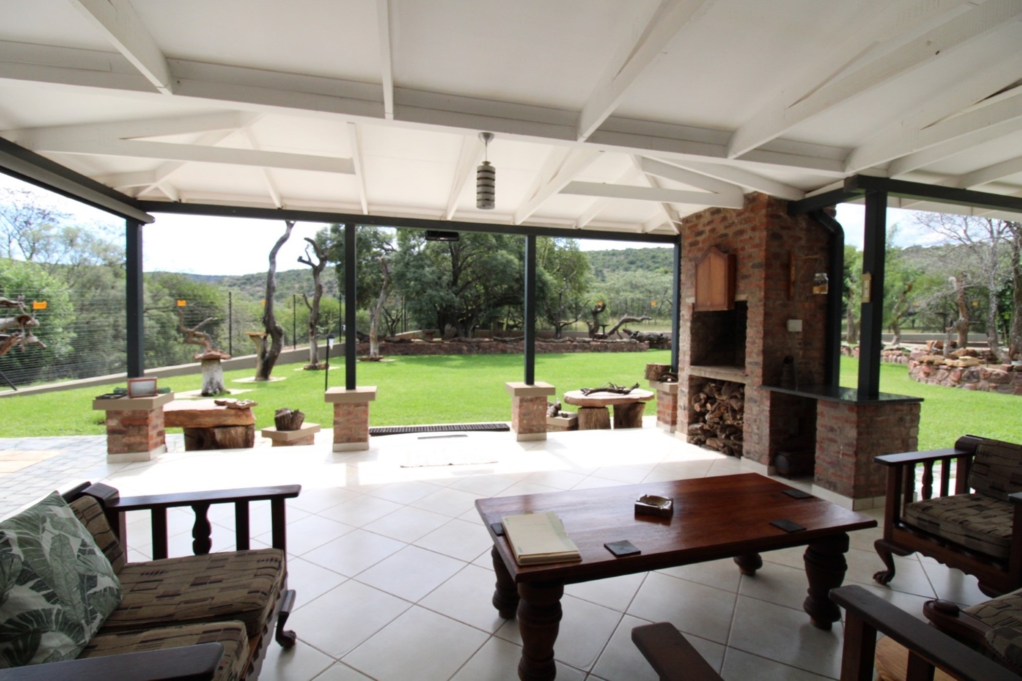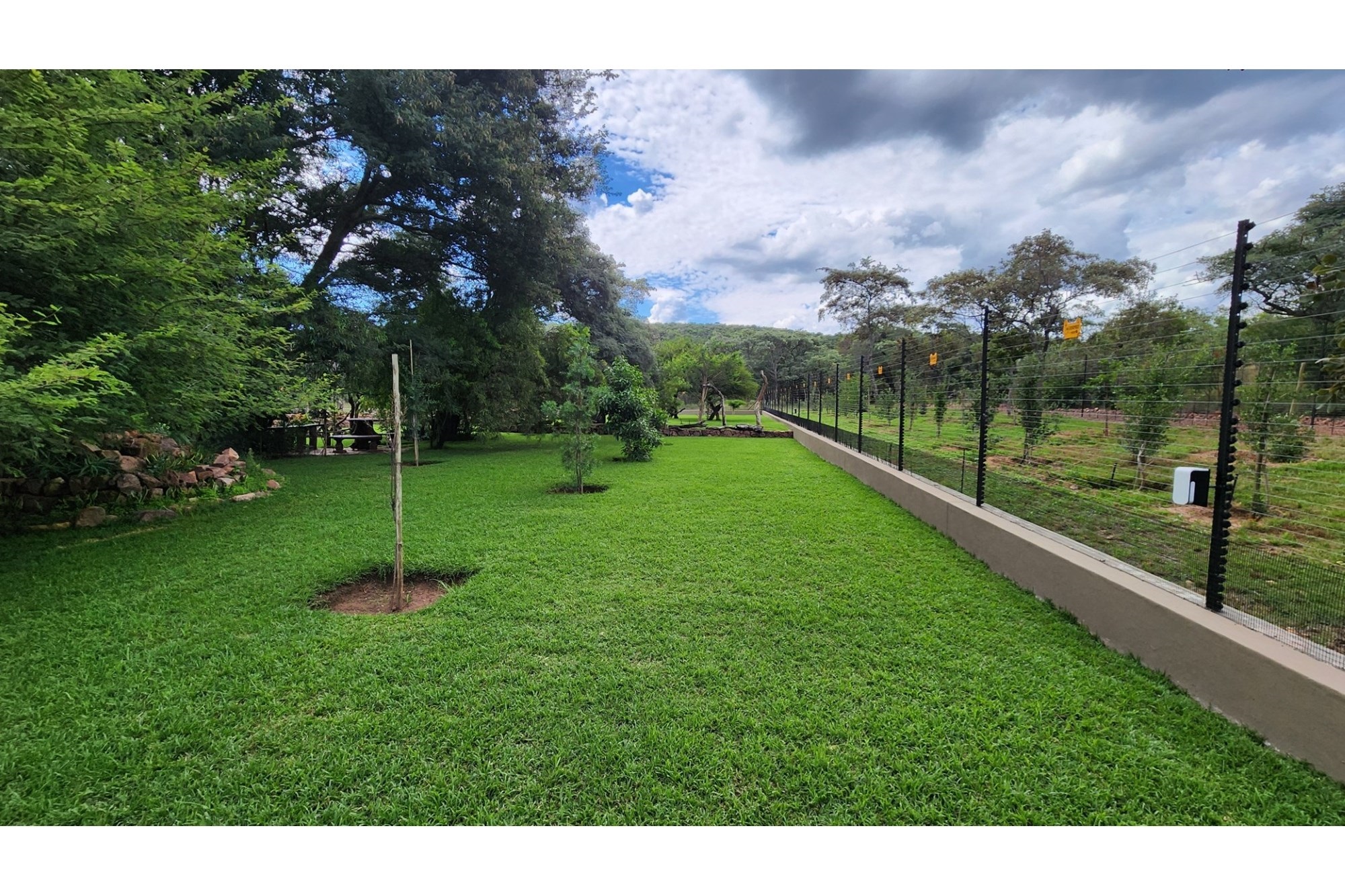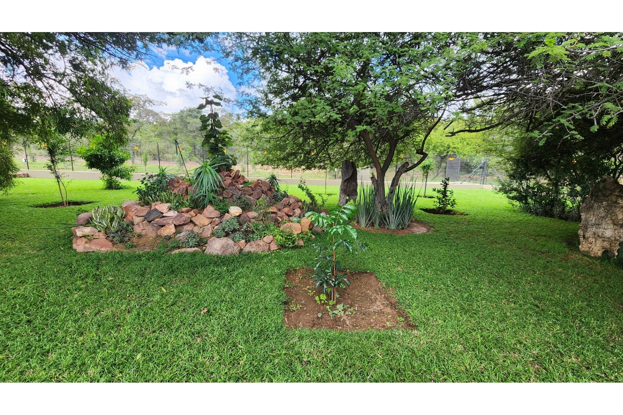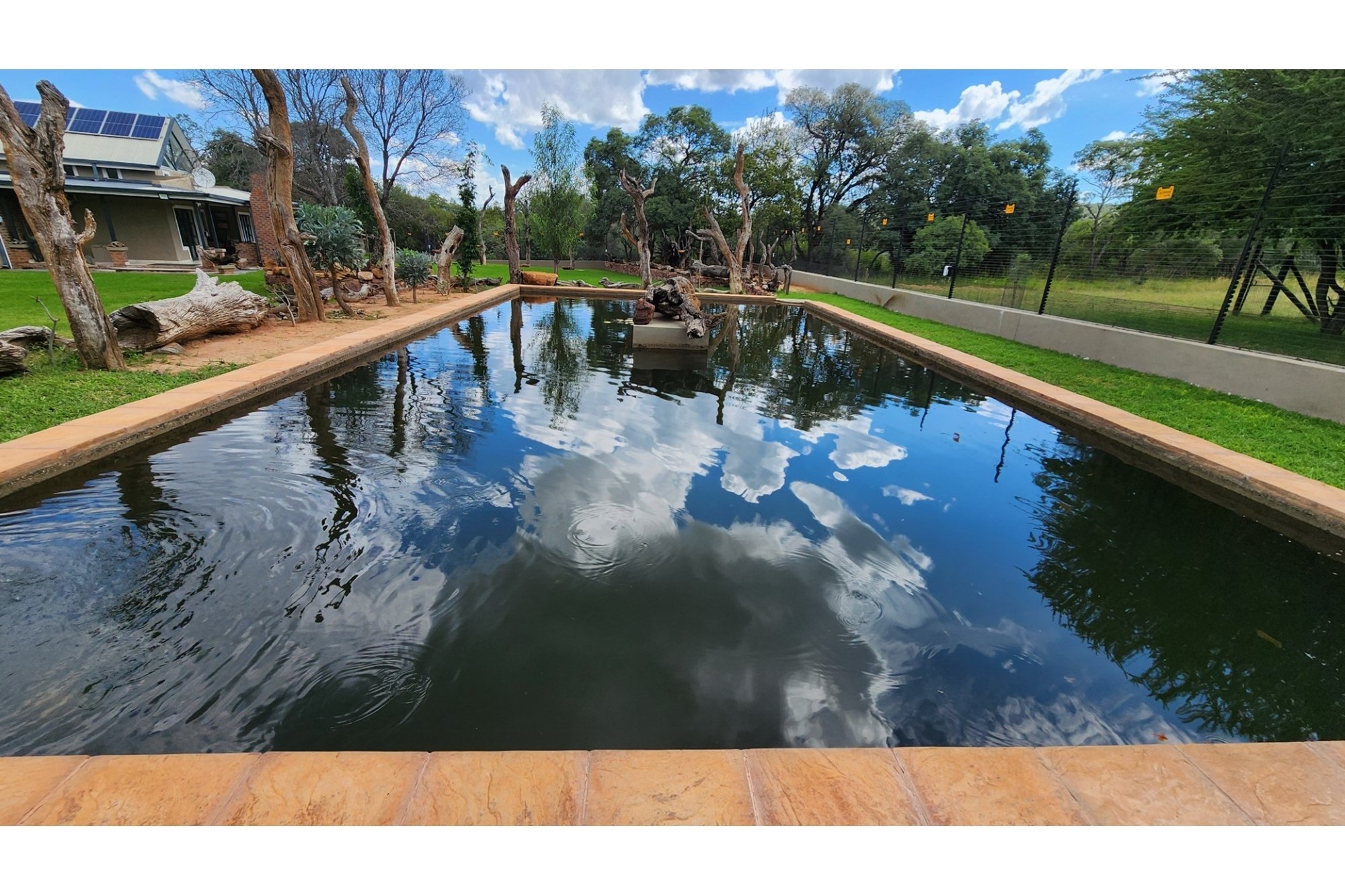 The outdoor spaces truly celebrate the beauty of indigenous flora with over 300 specially planted indigenous trees punctuating a manicured, expansive lawn maintained by an automatic irrigation system. Leadwood features and a strategic layout of water elements serve to create a mesmerizing landscape that blends seamlessly with the surrounding bushveld scenery. A concrete water storage dam, purpose-built for both irrigation and captivating water features, reinforces the fusion of luxury and sustainability in every aspect of this remarkable property.