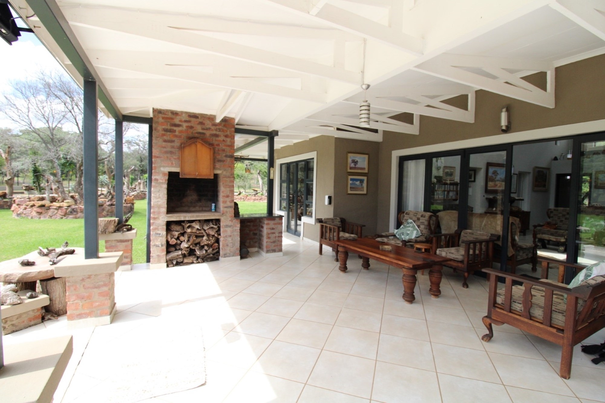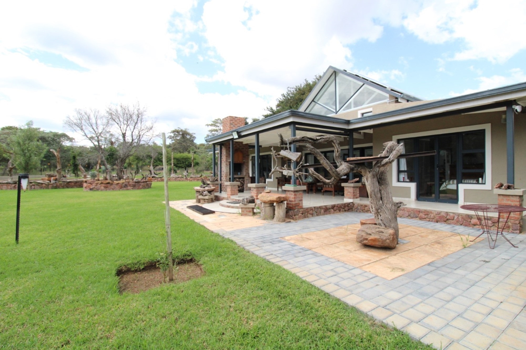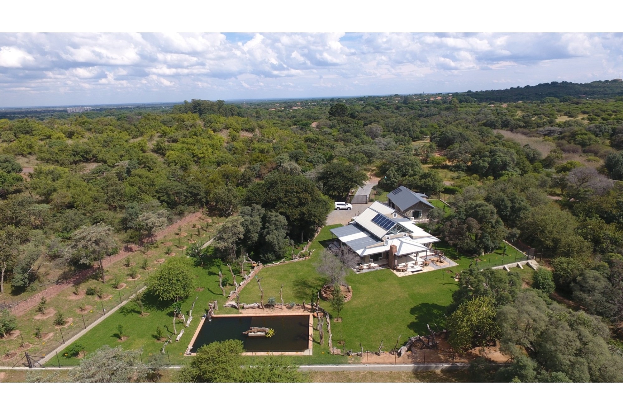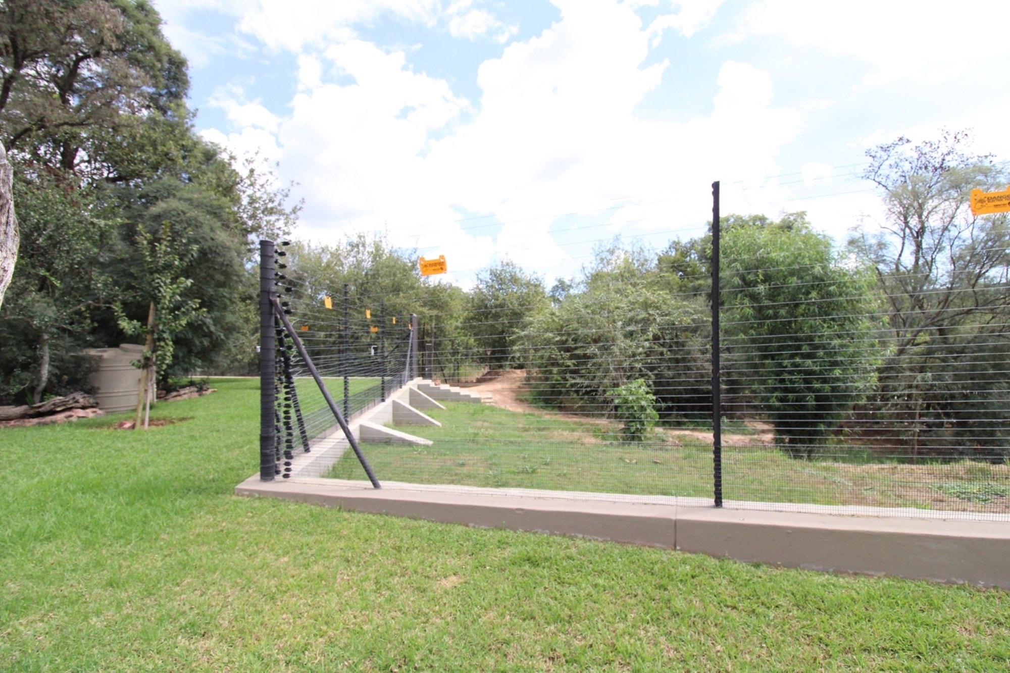 The outdoor spaces truly celebrate the beauty of indigenous flora with over 300 specially planted indigenous trees punctuating a manicured, expansive lawn maintained by an automatic irrigation system. Leadwood features and a strategic layout of water elements serve to create a mesmerizing landscape that blends seamlessly with the surrounding bushveld scenery. A concrete water storage dam, purpose-built for both irrigation and captivating water features, reinforces the fusion of luxury and sustainability in every aspect of this remarkable property.