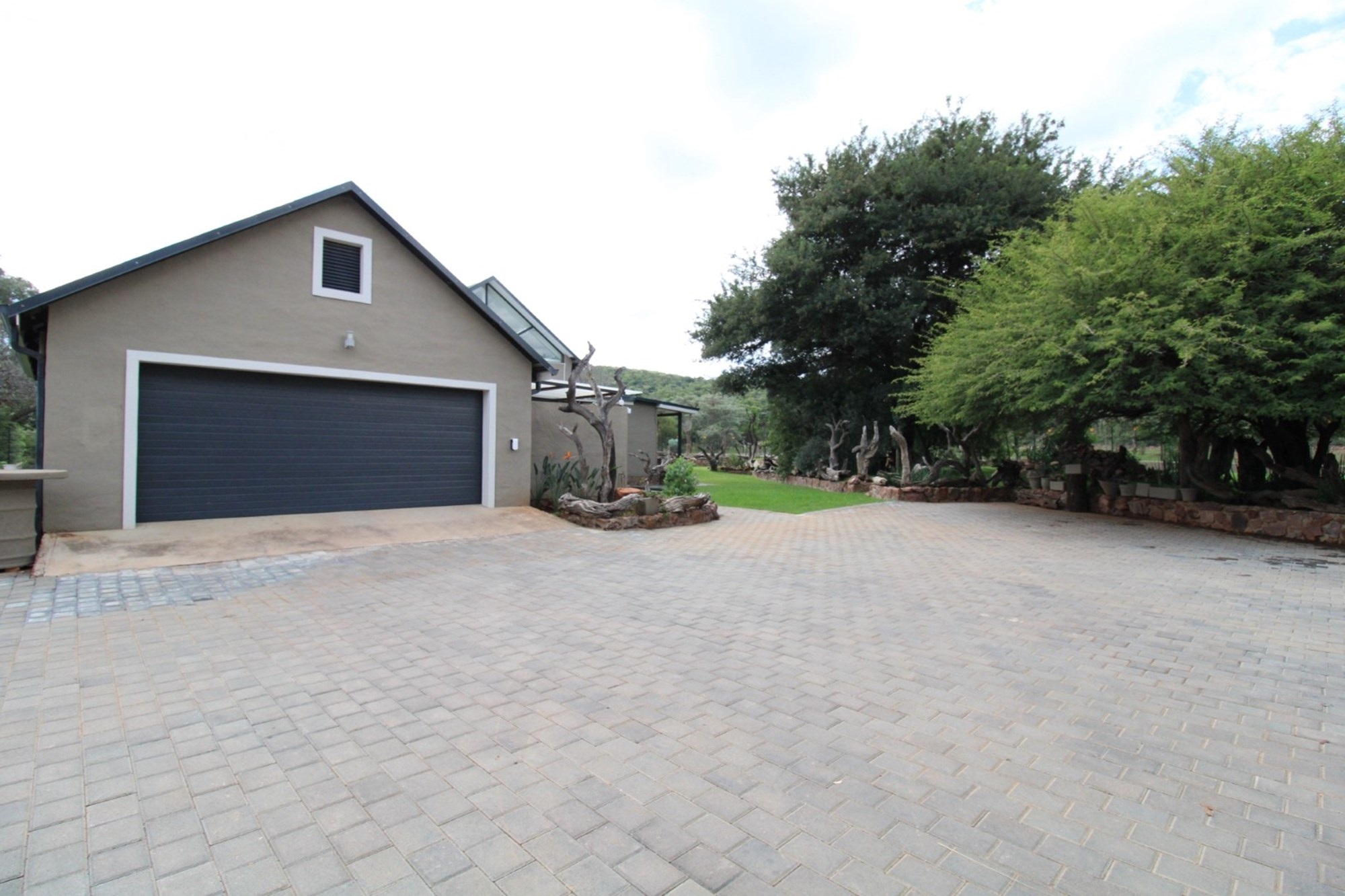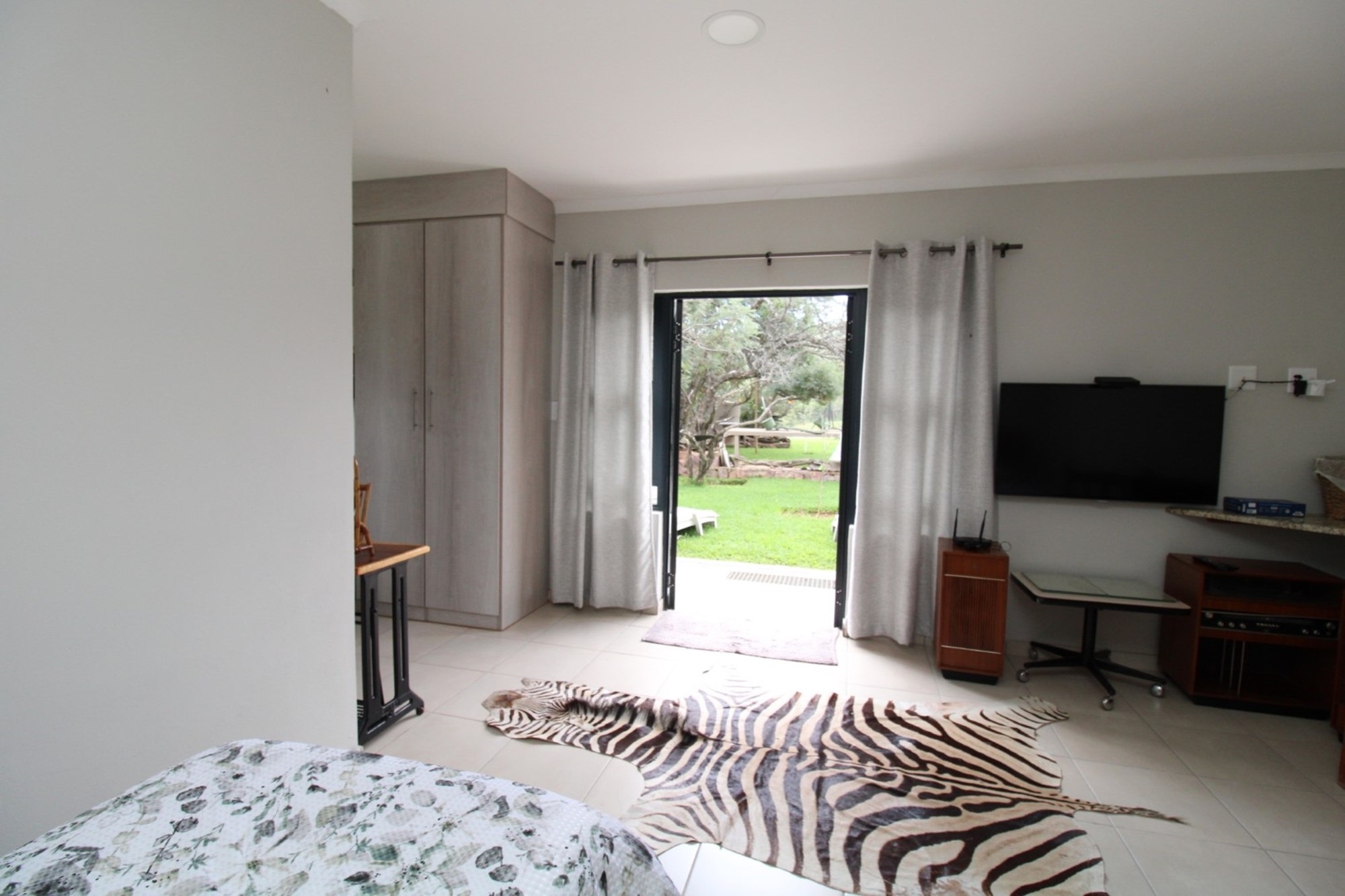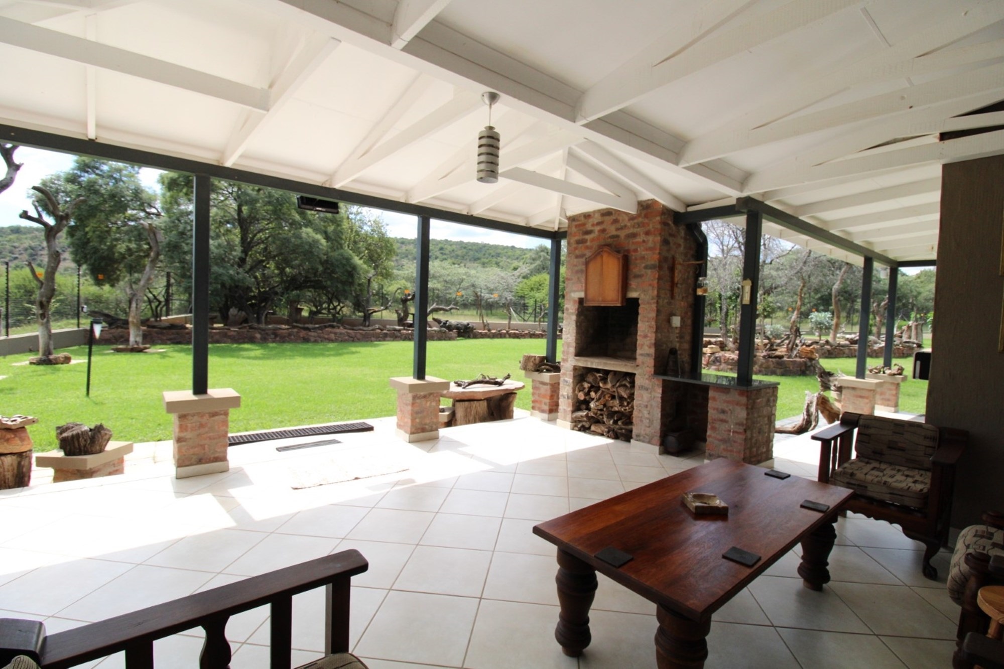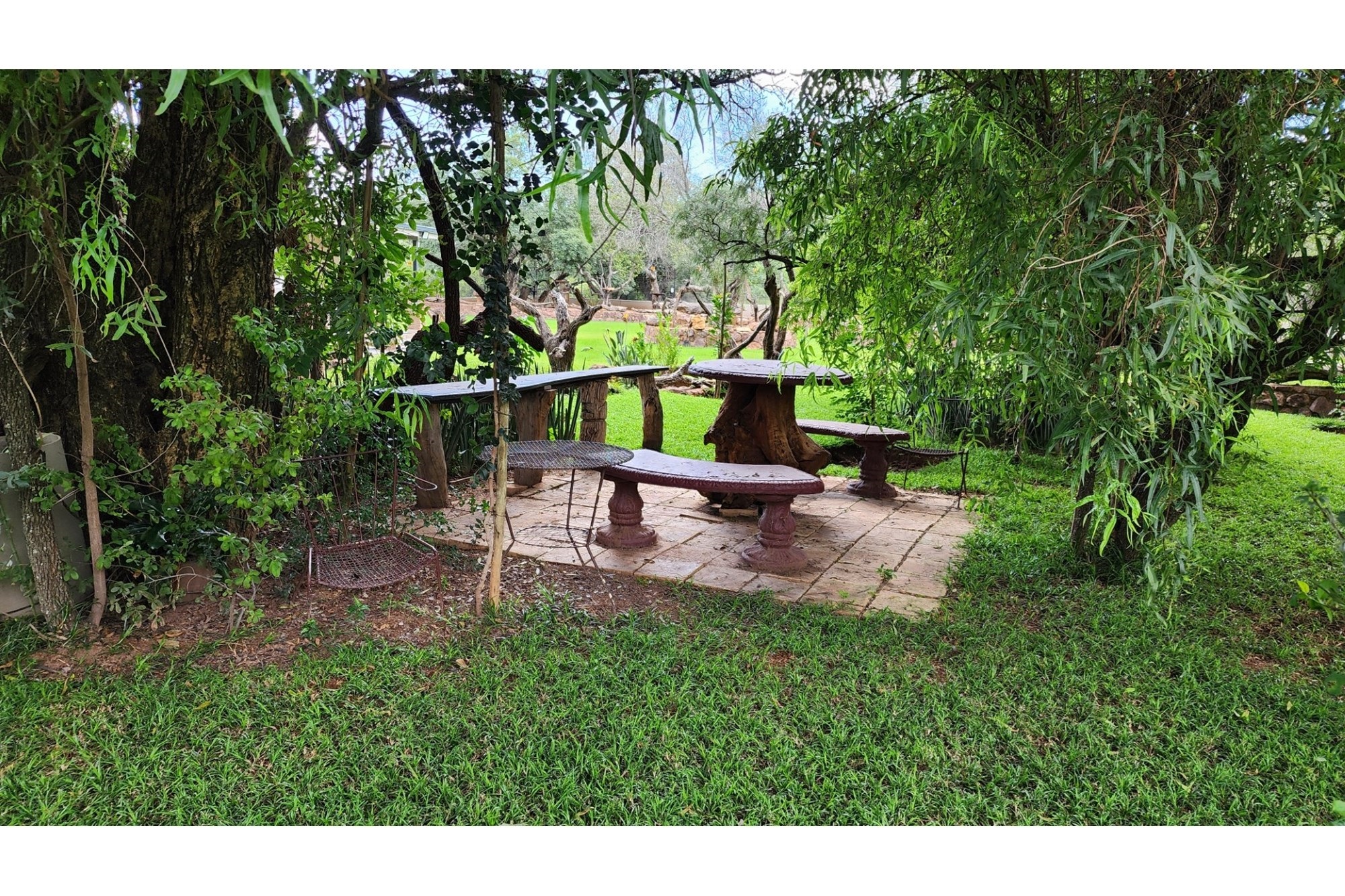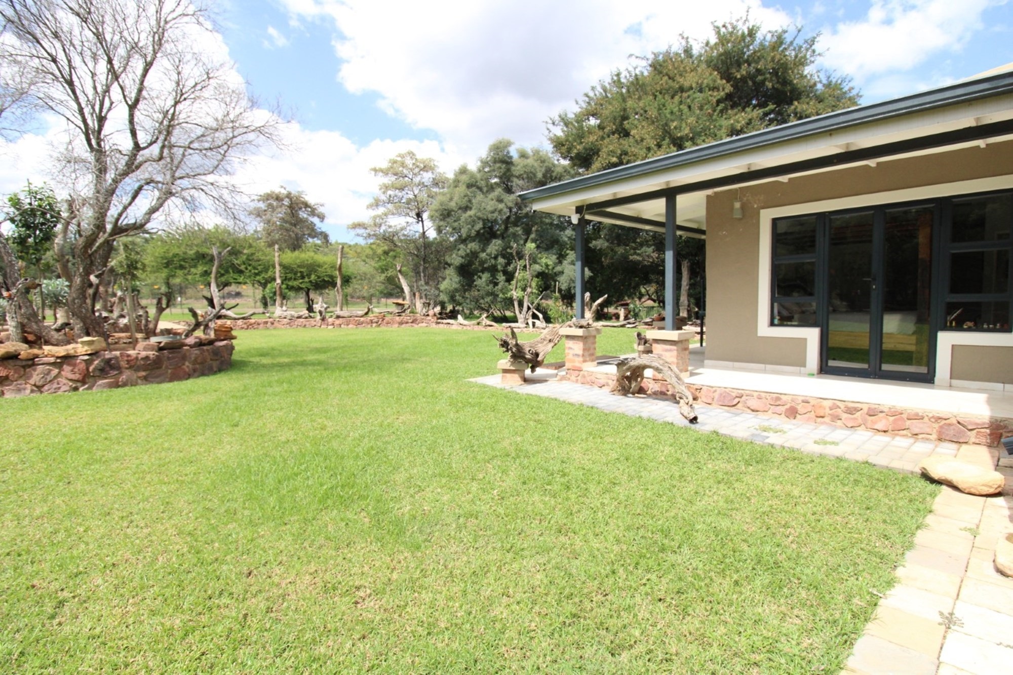 The outdoor spaces truly celebrate the beauty of indigenous flora with over 300 specially planted indigenous trees punctuating a manicured, expansive lawn maintained by an automatic irrigation system. Leadwood features and a strategic layout of water elements serve to create a mesmerizing landscape that blends seamlessly with the surrounding bushveld scenery. A concrete water storage dam, purpose-built for both irrigation and captivating water features, reinforces the fusion of luxury and sustainability in every aspect of this remarkable property.