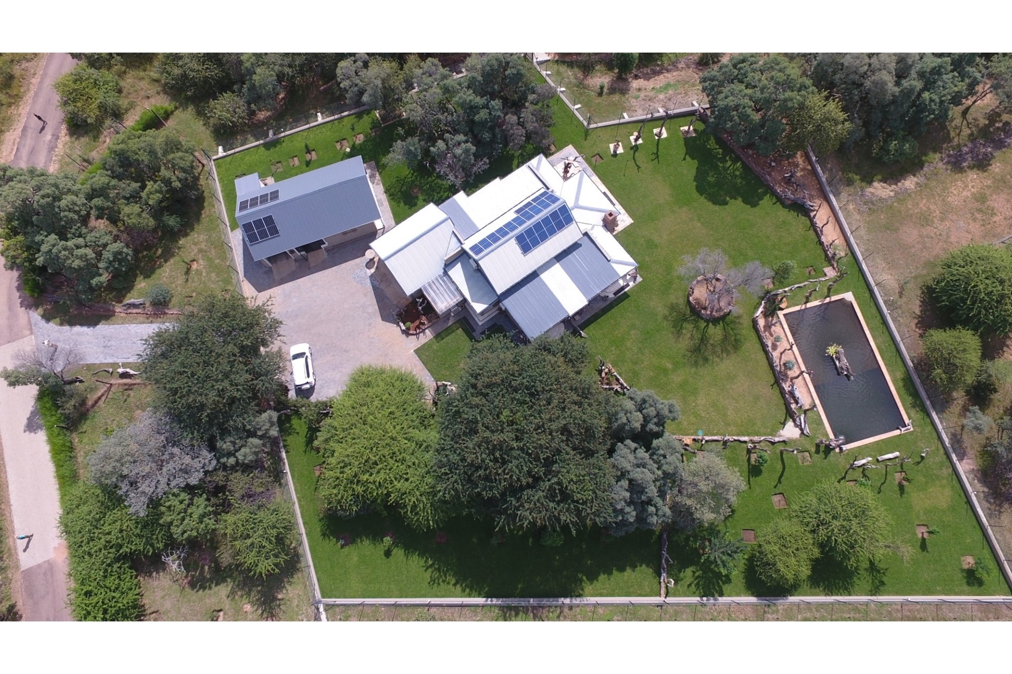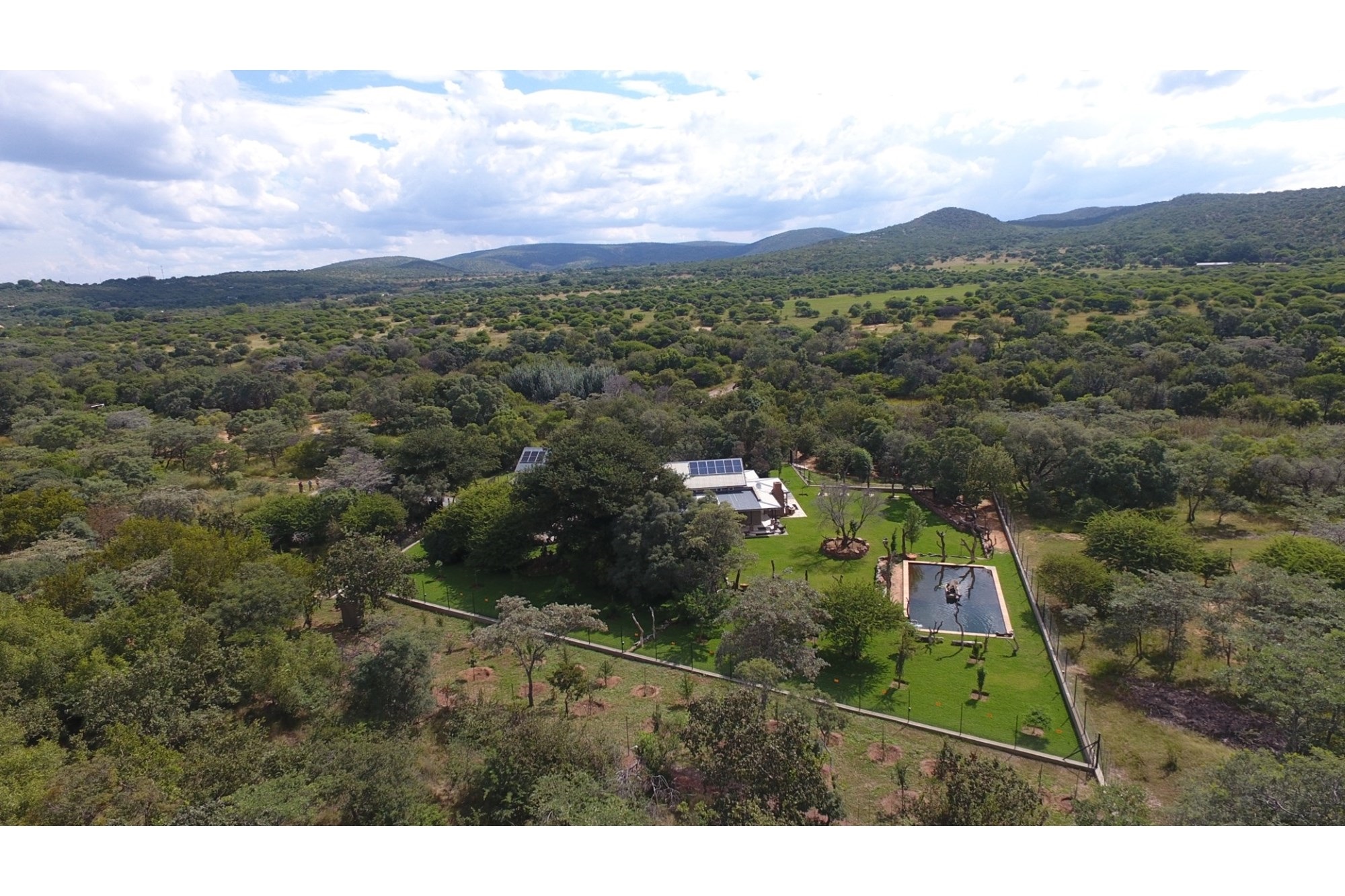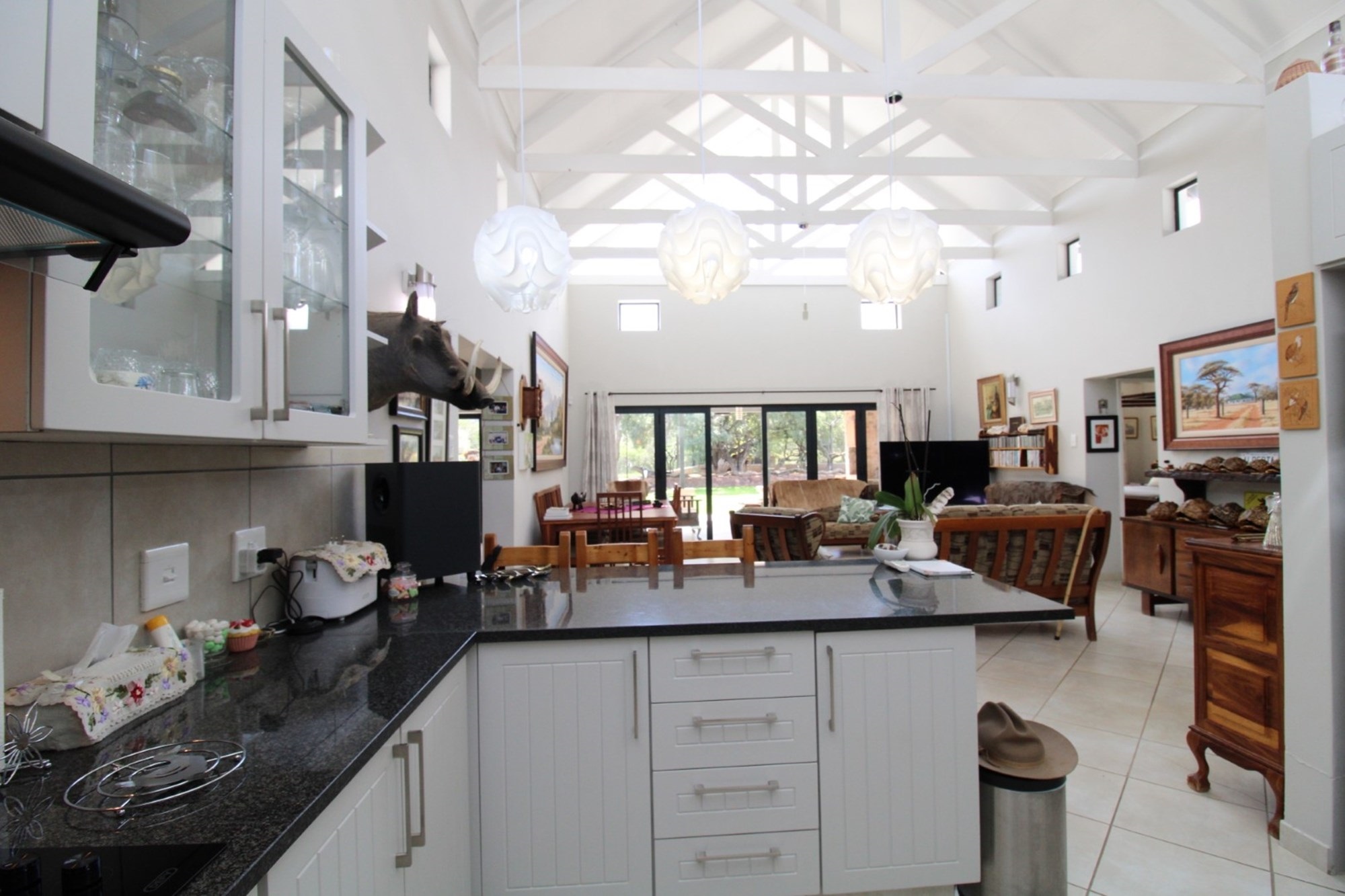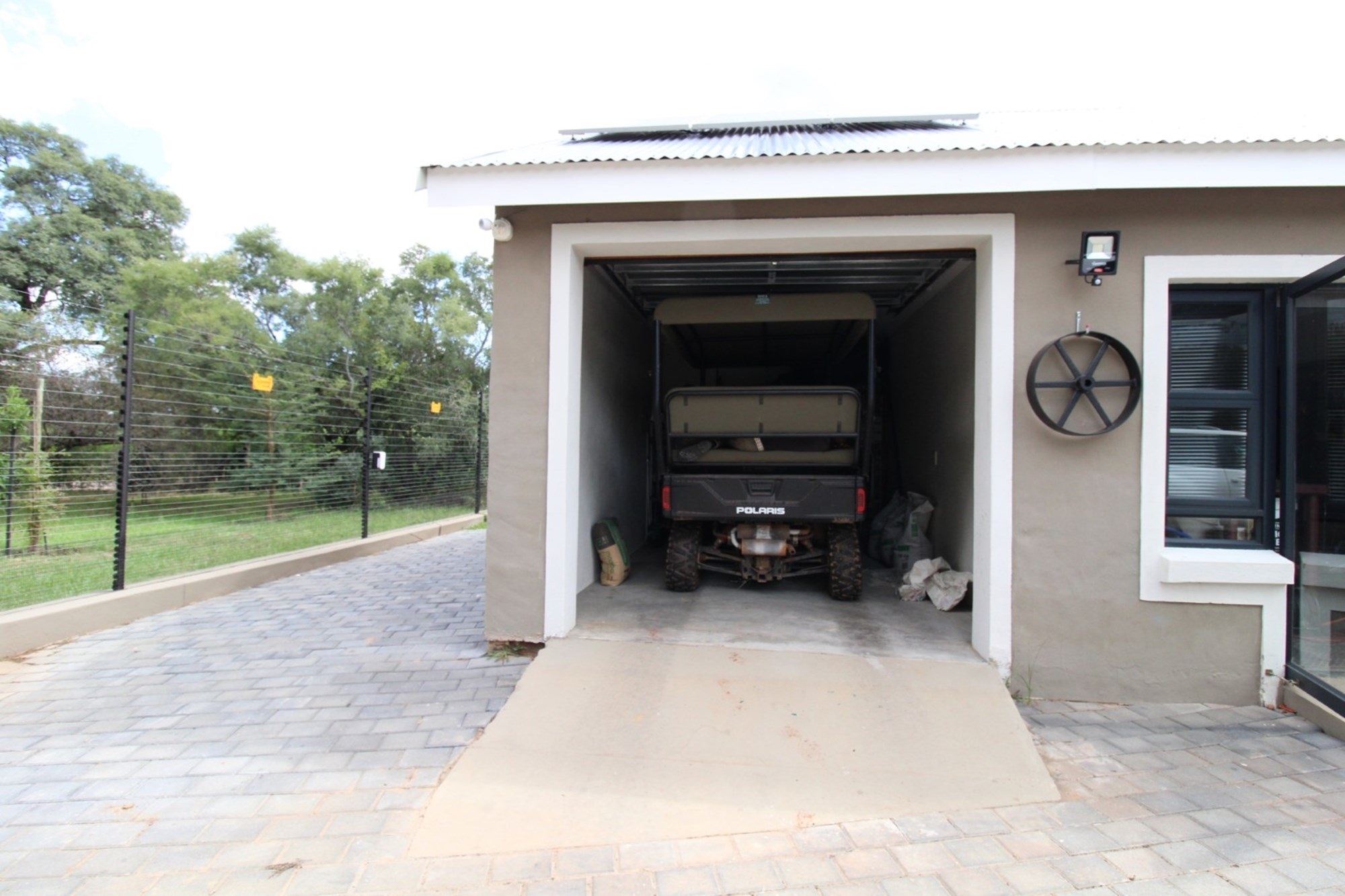 The main house, a stunning pitched roofed residence, sits on an impeccably landscaped stand enriched with attractive bush and water features. A bird hide overlooking the dam and a dedicated Bush Boma braai area (Boskamp) invite you to savour unforgettable outdoor experiences in the true spirit of bushveld living. The robust main solar installation featuring 18 solar panels, two x 5kW inverters, and 15 kW backup batteries, all underscores the estate`s commitment to sustainable living.