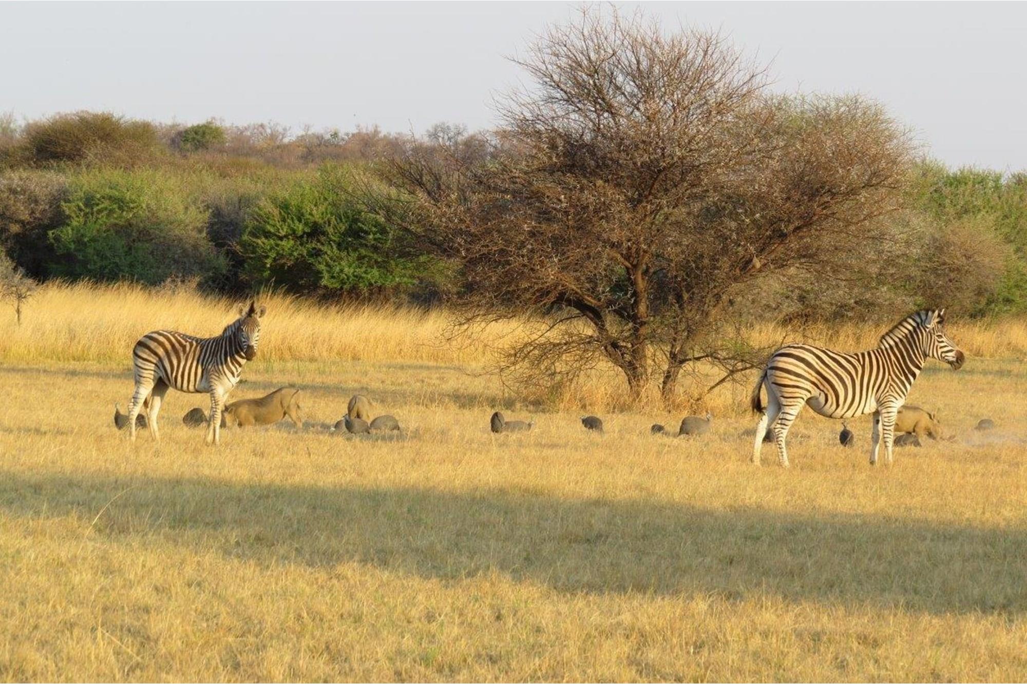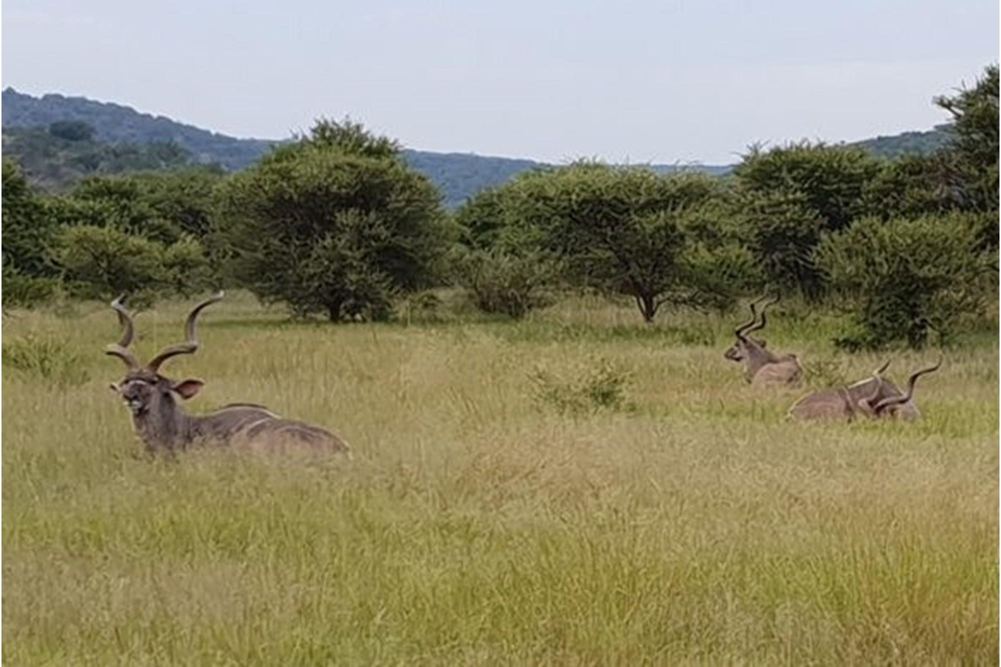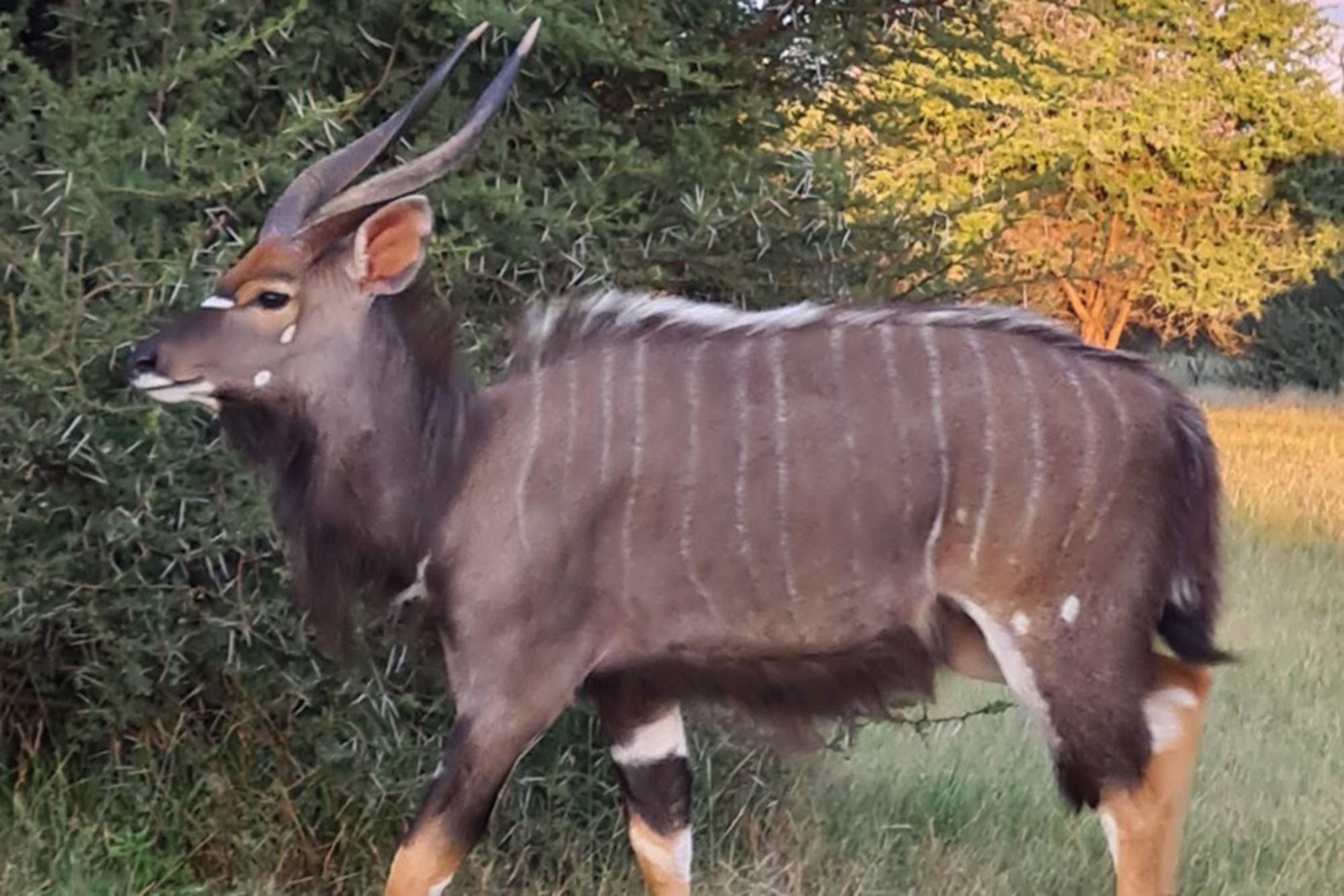 Game species include giraffe, wildebeest, zebra, duiker, kudu, impala, blesbuck, sable antelope, bushbuck, warthog, waterbuck, nyala, and other small common game species.