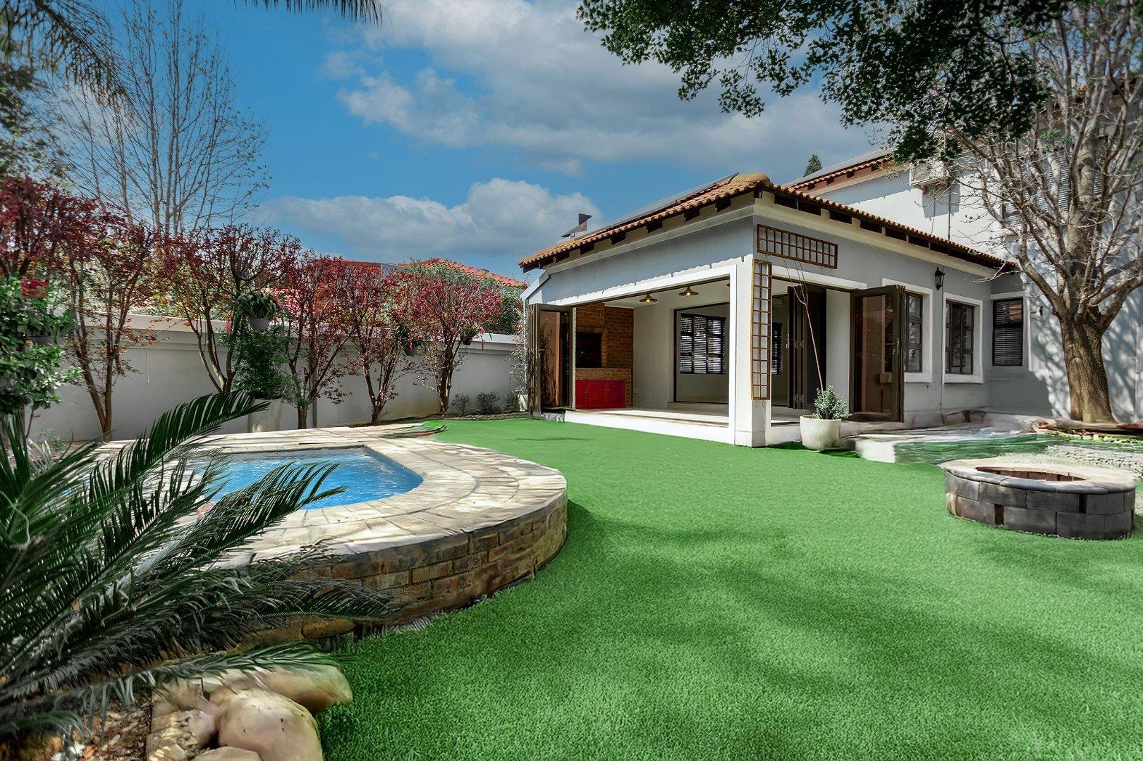 The flowing open-plan design seamlessly connects the dining room, TV lounge, and enclosed patio with built-in braai, all overlooking the sparkling pool, creating a warm and inviting indoor-outdoor lifestyle.