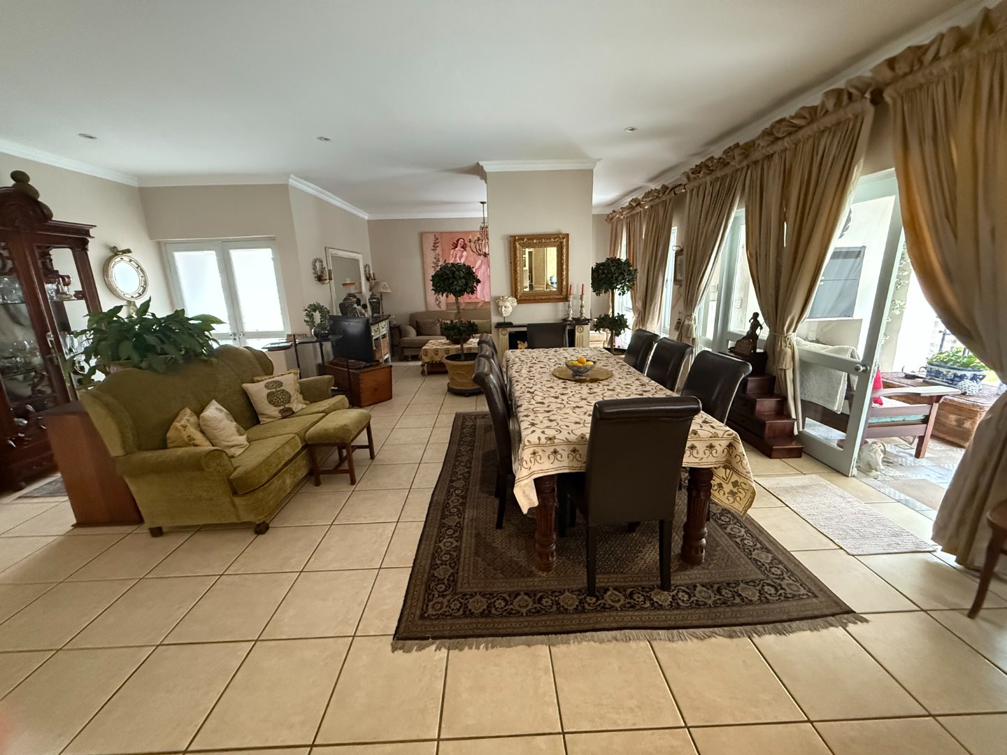 Massive open plan dining room and lounge with fireplace. These living areas open onto spacious patio with built in braai.