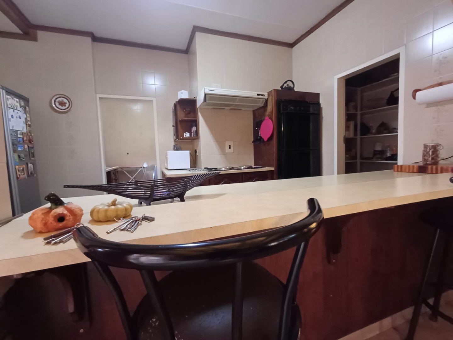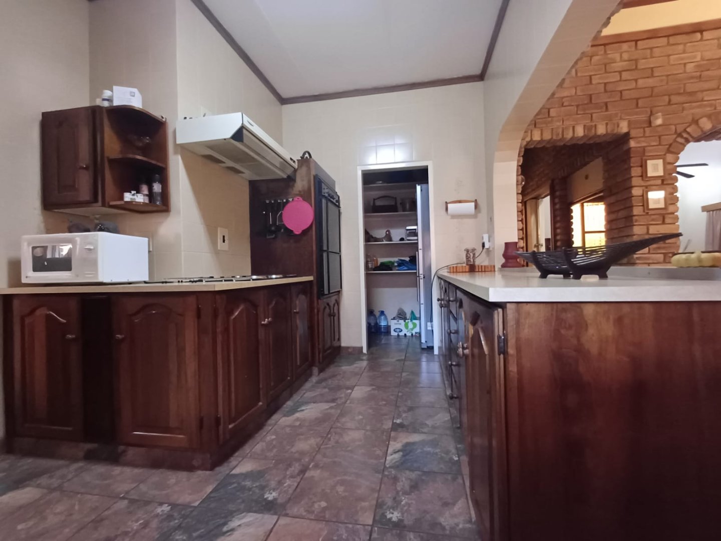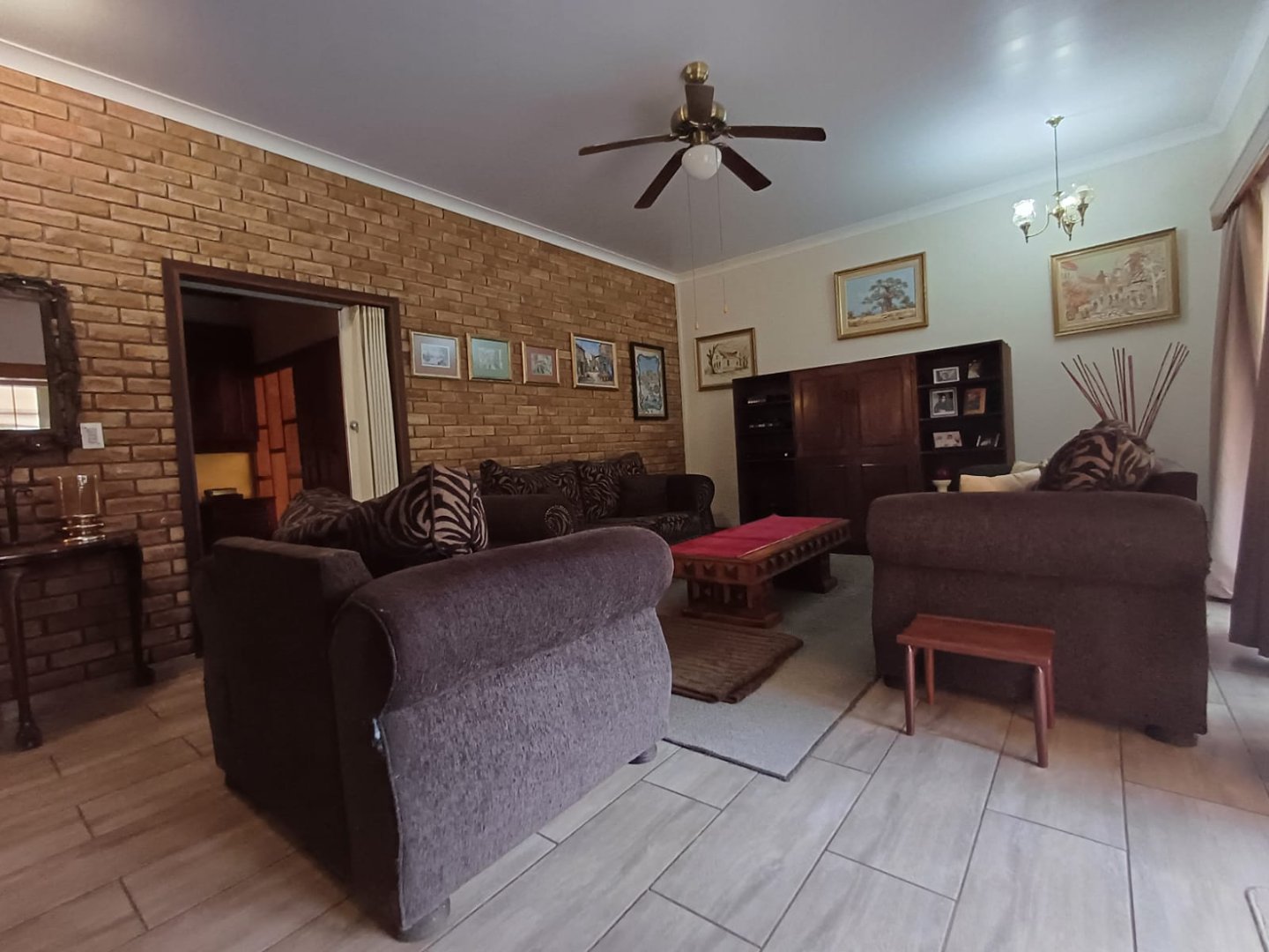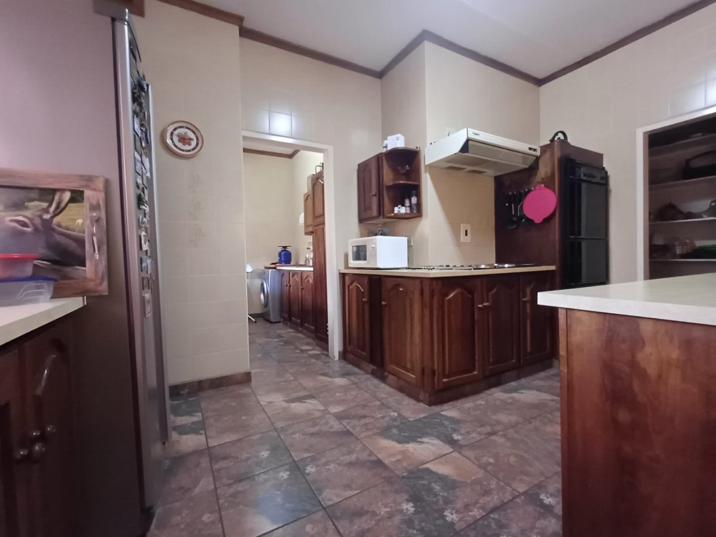 The property welcomes you with an elegant entry hall that leads to a spacious living room complete with a ceiling fan for year-round comfort. The open-plan kitchen and dining area create a seamless flow for entertaining and family gatherings. The kitchen features a sleek island, double ovens, a scullery, and a pantry, providing both style and functionality.