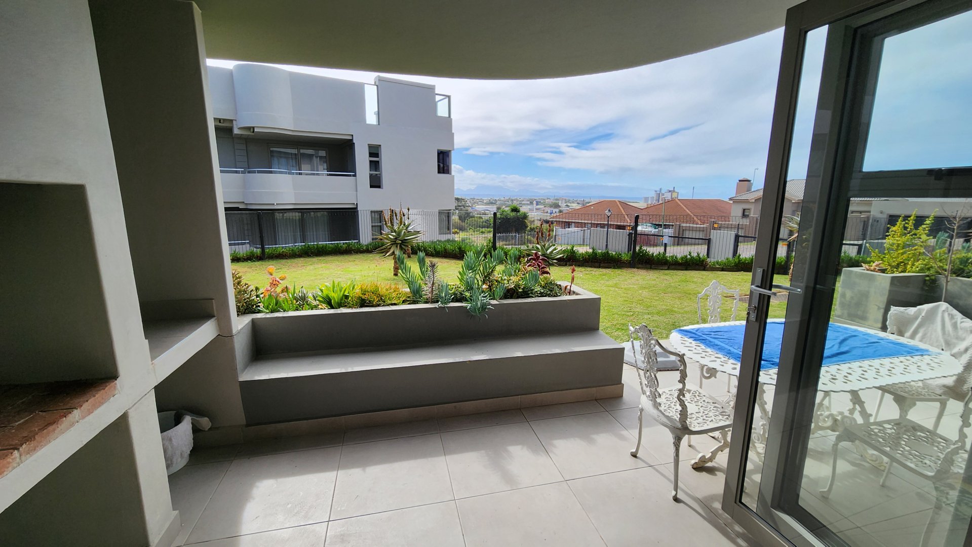 This very neat apartment in a popular complex with affordable levies is situated at ground floor level with access to a garden in front. Open plan living area, covered veranda with built in braai, two bedrooms en suite, kitchen and covered parking for your vehicle. You will enjoy mountain views as well as some distant sea views from the living room as well as the main bedroom. North facing apartment and warm and sunny during winter months. This complex also has a lift to ensure ease of access to the apartment for the elderly as well as wheelchair impaired persons. With permission of the trustees of the body corporate a small dog will also be welcome. Situated between the coastal towns of Mossel Bay and Hartenbos with beautiful swimming beaches and other attractions and all amenities you may need as well as easy access to the N2 highway. Perfect lock up and go investment at the heart of the Garden Route of South Africa. For more information or appointment to view you are welcome to contact me.